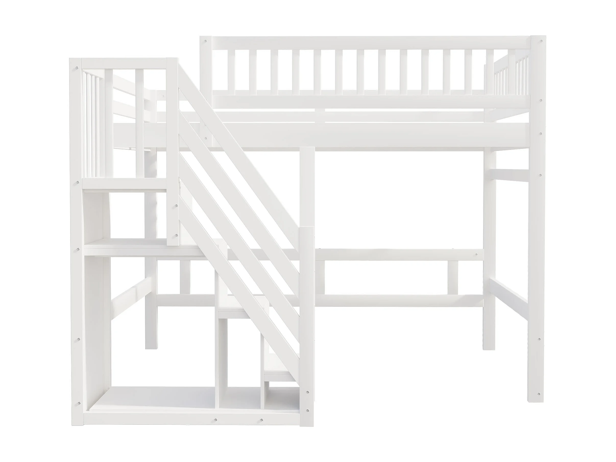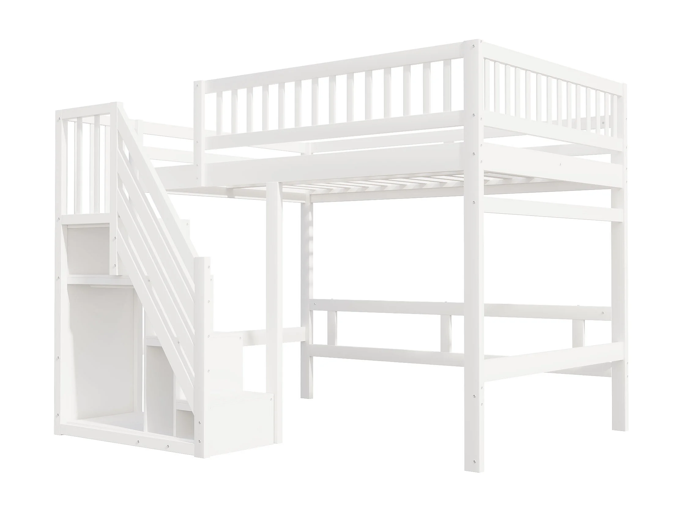 Lit en Bois Massif 140x200 avec Escalier de Rangement et Balustrade Haute, pour Enfant et Adolescent, MDF, Blanc (205x192x173 cm)