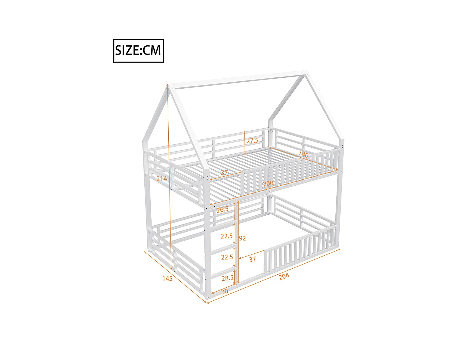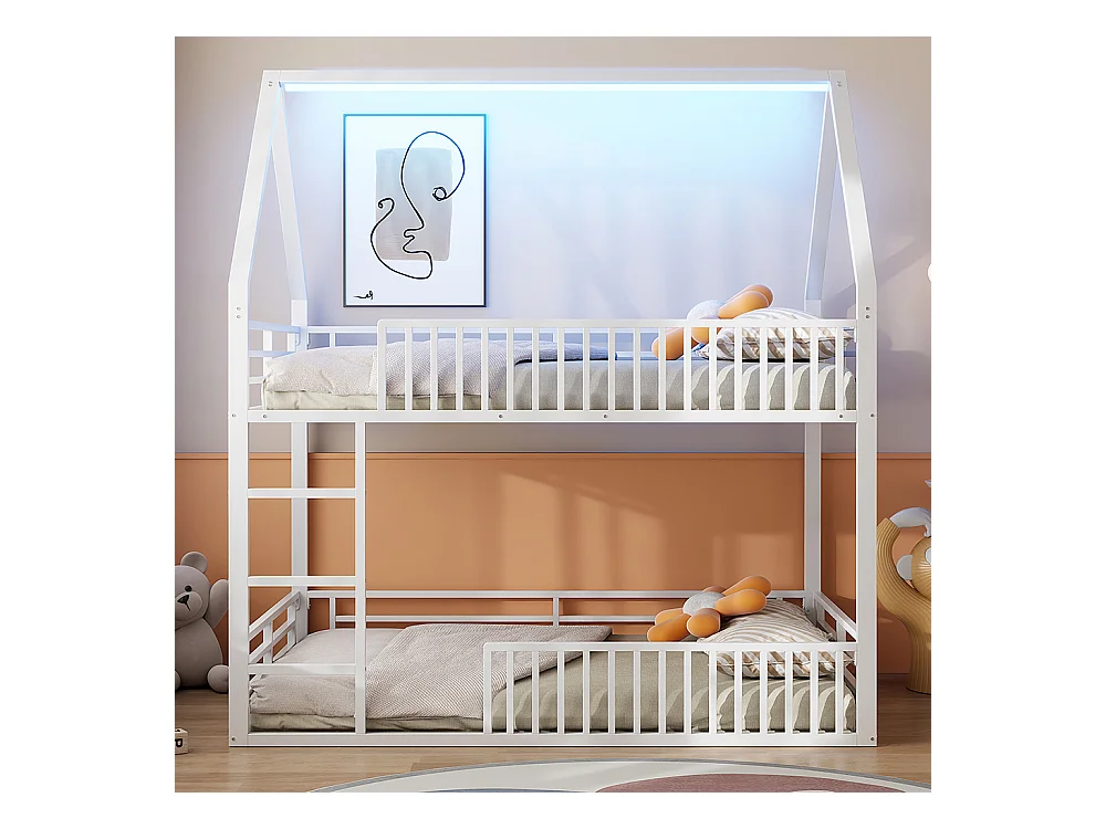Lit superposé en forme de maison avec barrière et éclairage LED, métal, blanc (140x200x214 cm)