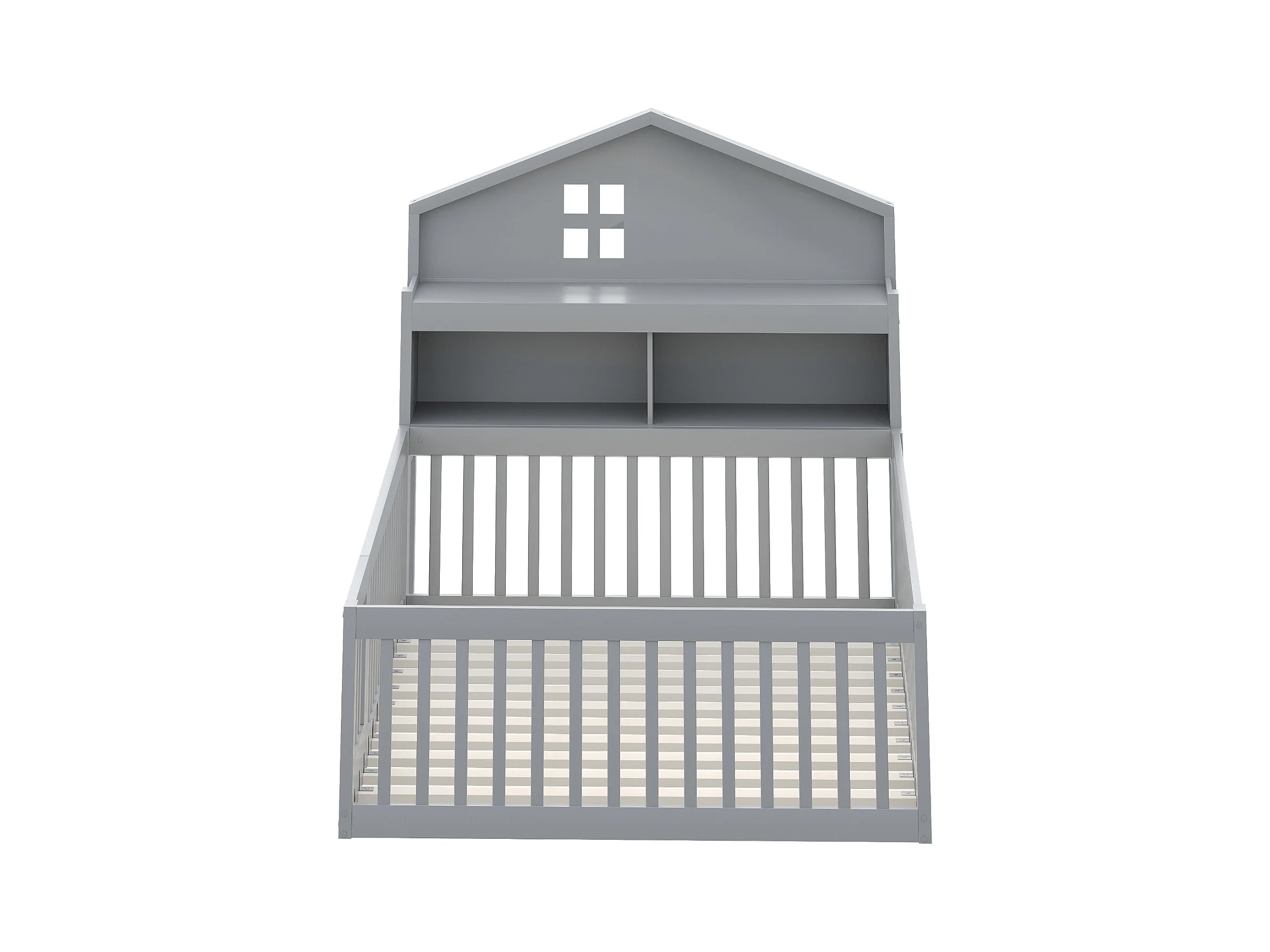 Lit enfant 140x200 cm, cadre en bois massif, lit-maison avec étagères, rangement, barrières de sécurité, porte, étagère à livres, sommier à lattes, gris