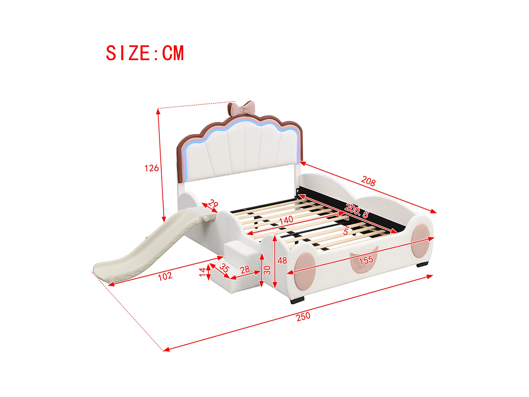 Lit enfant 140x200 cm papillon rose/blanc – LED multicolore avec télécommande, toboggan, échelle, PU