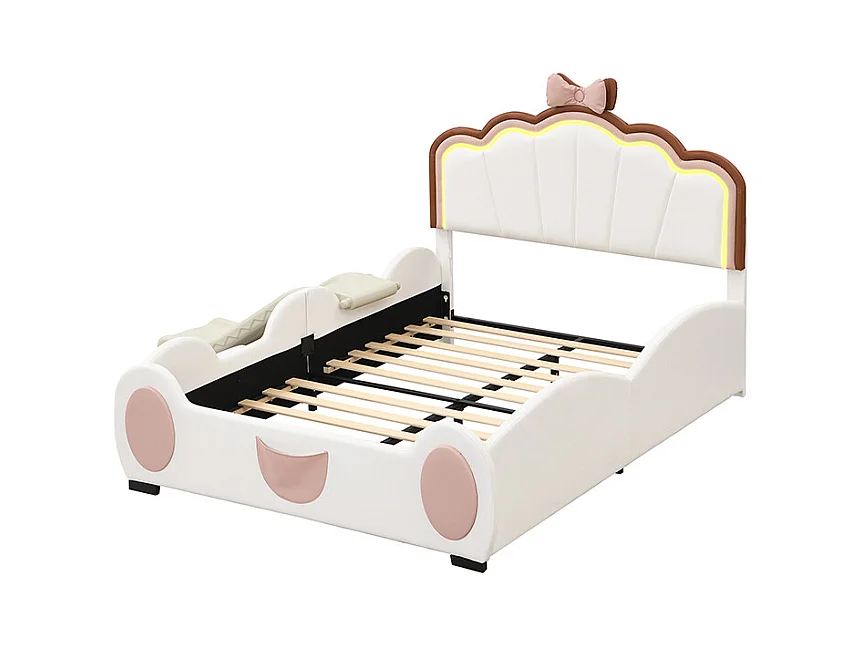 Lit enfant en similicuir avec LED - tête de lit en forme de couronne - 140x200cm - rose