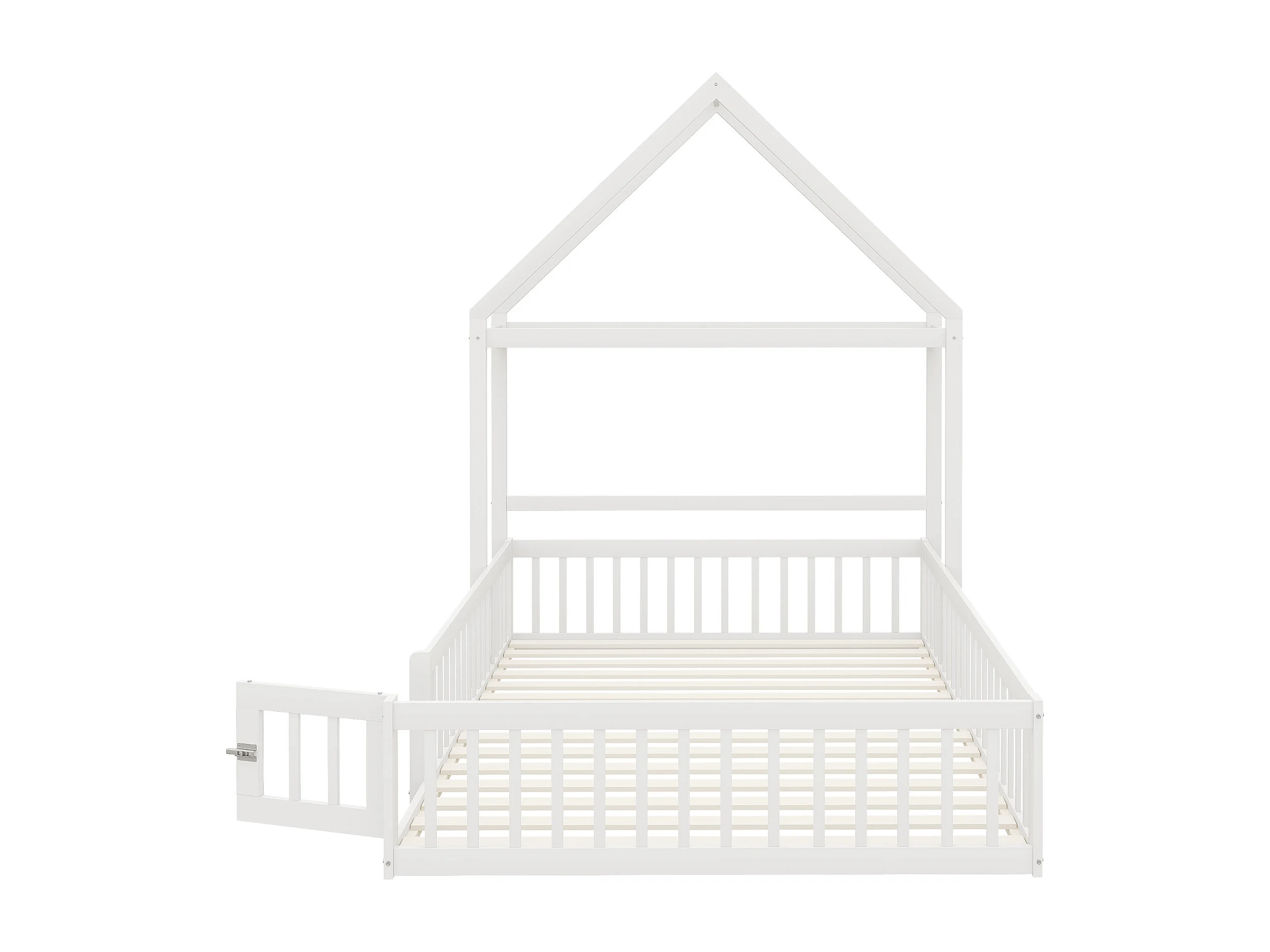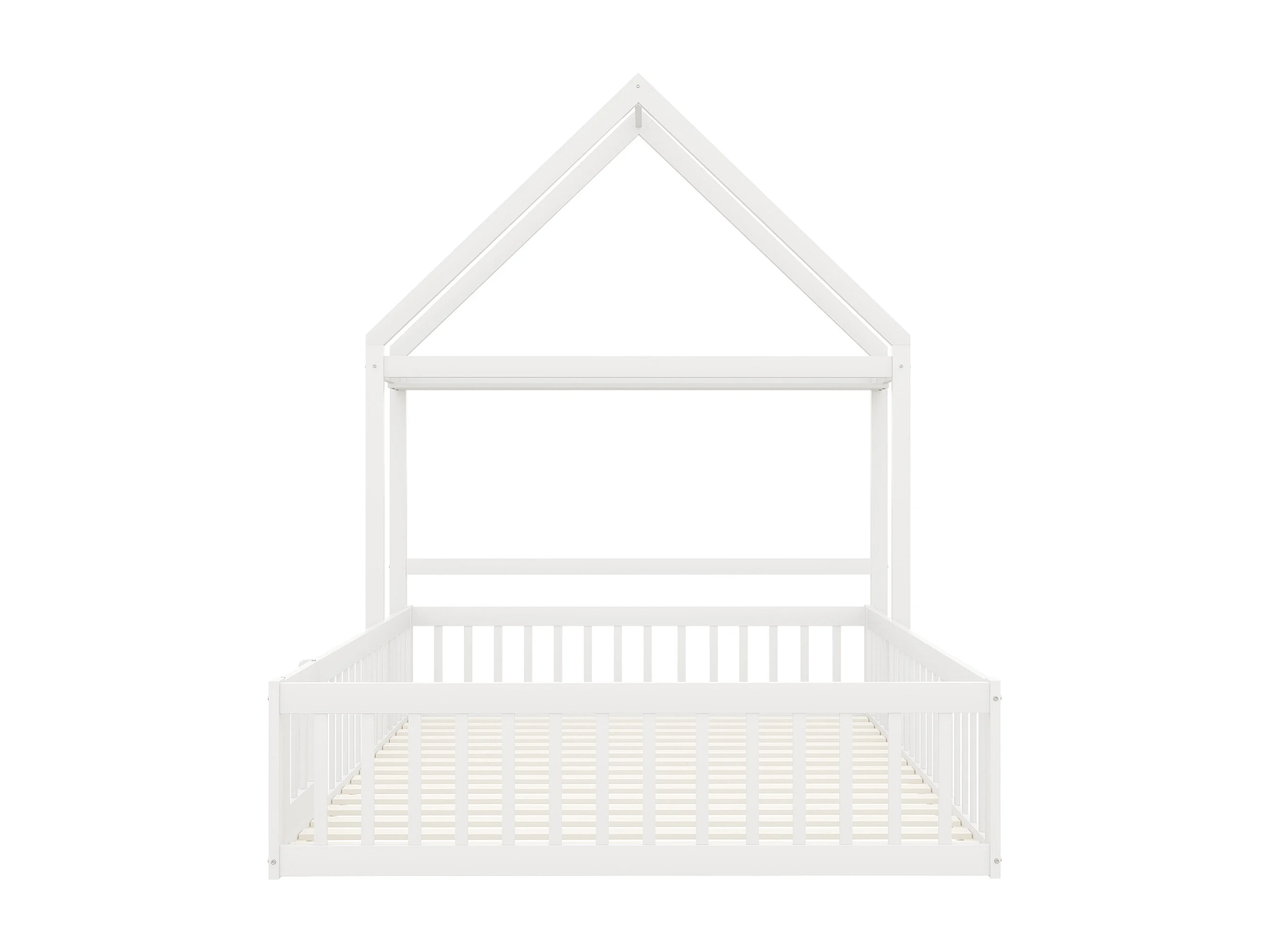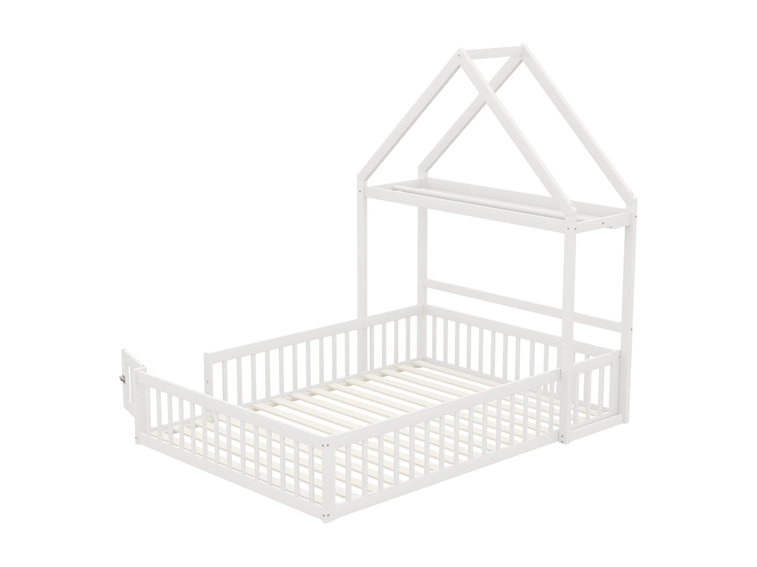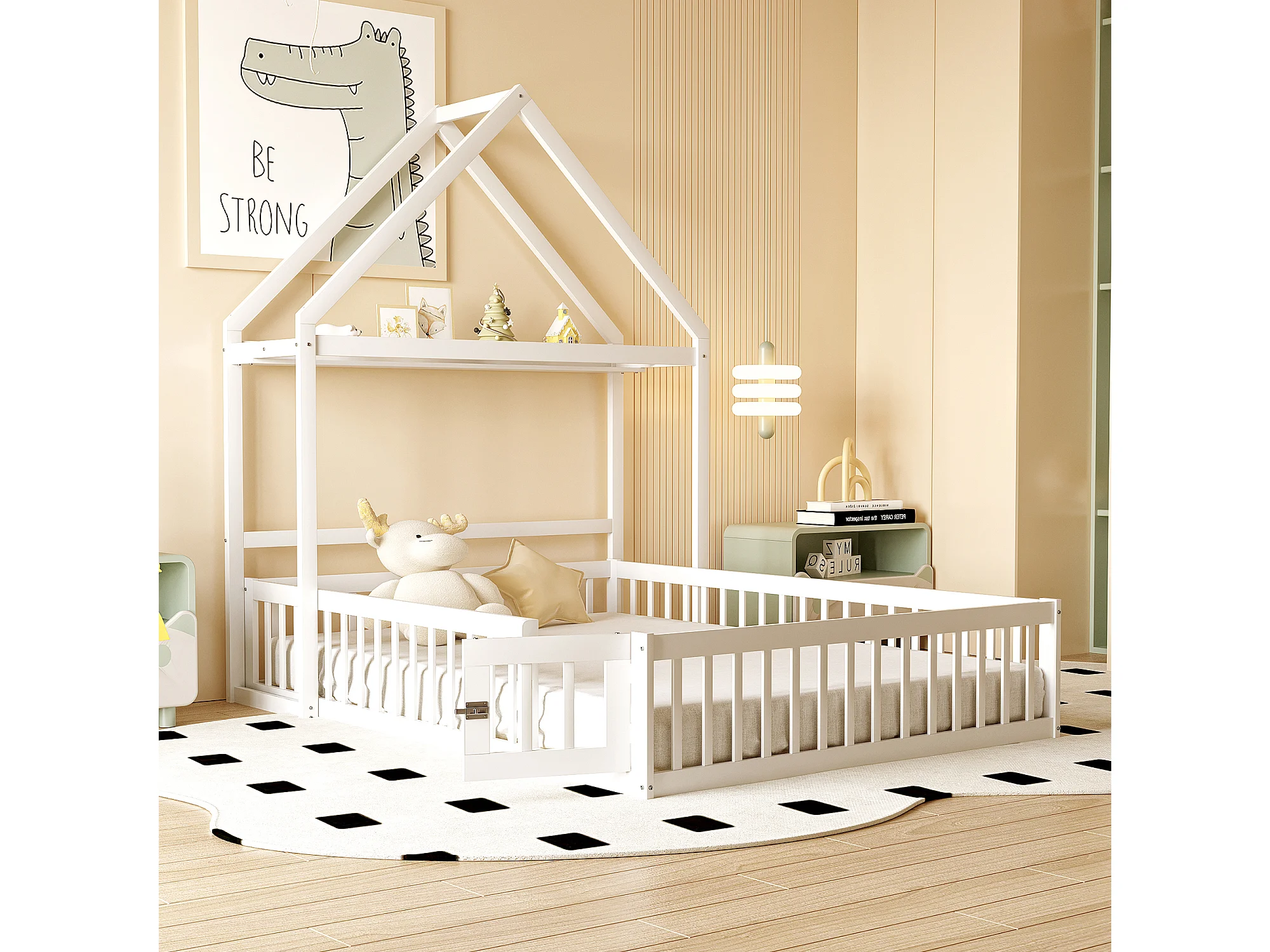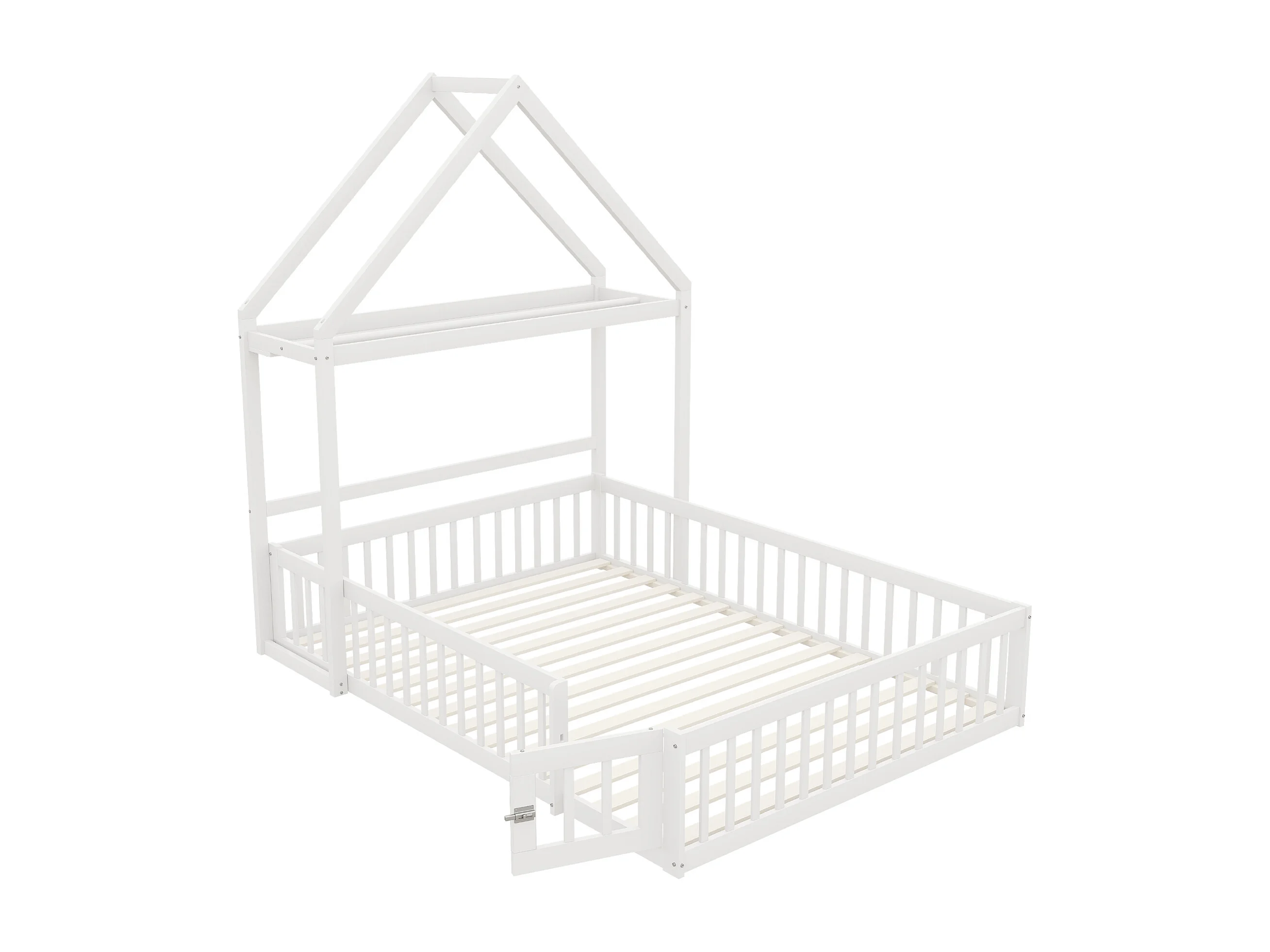 Lit enfant 140x200cm, lit cabane avec étagères de rangement, grille de protection, blanc, sans matelas