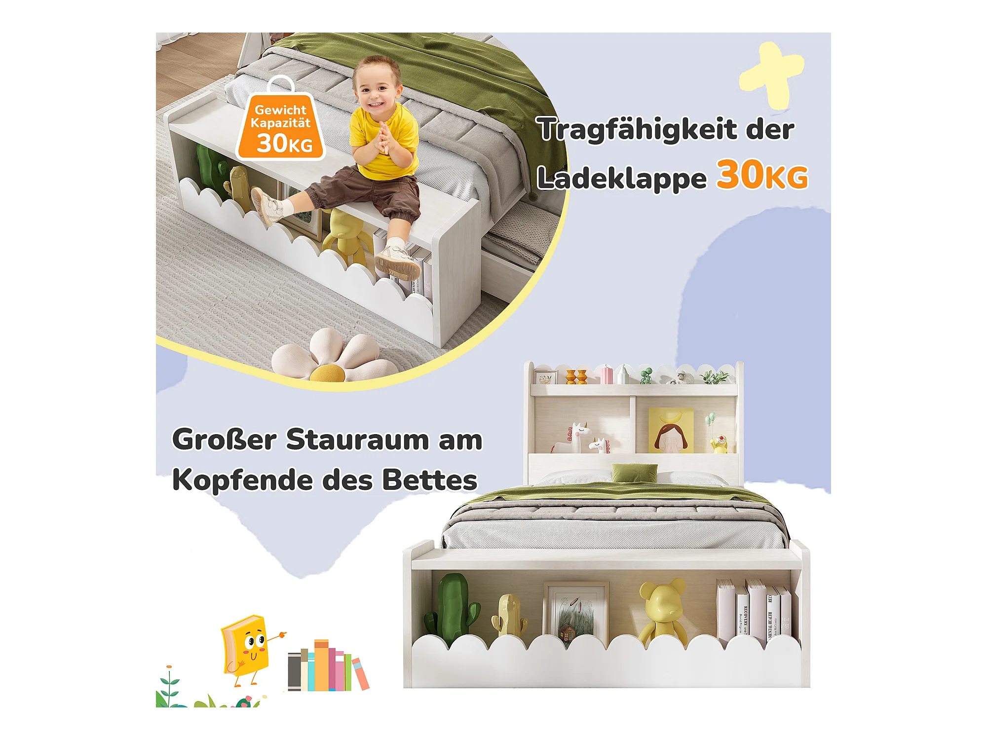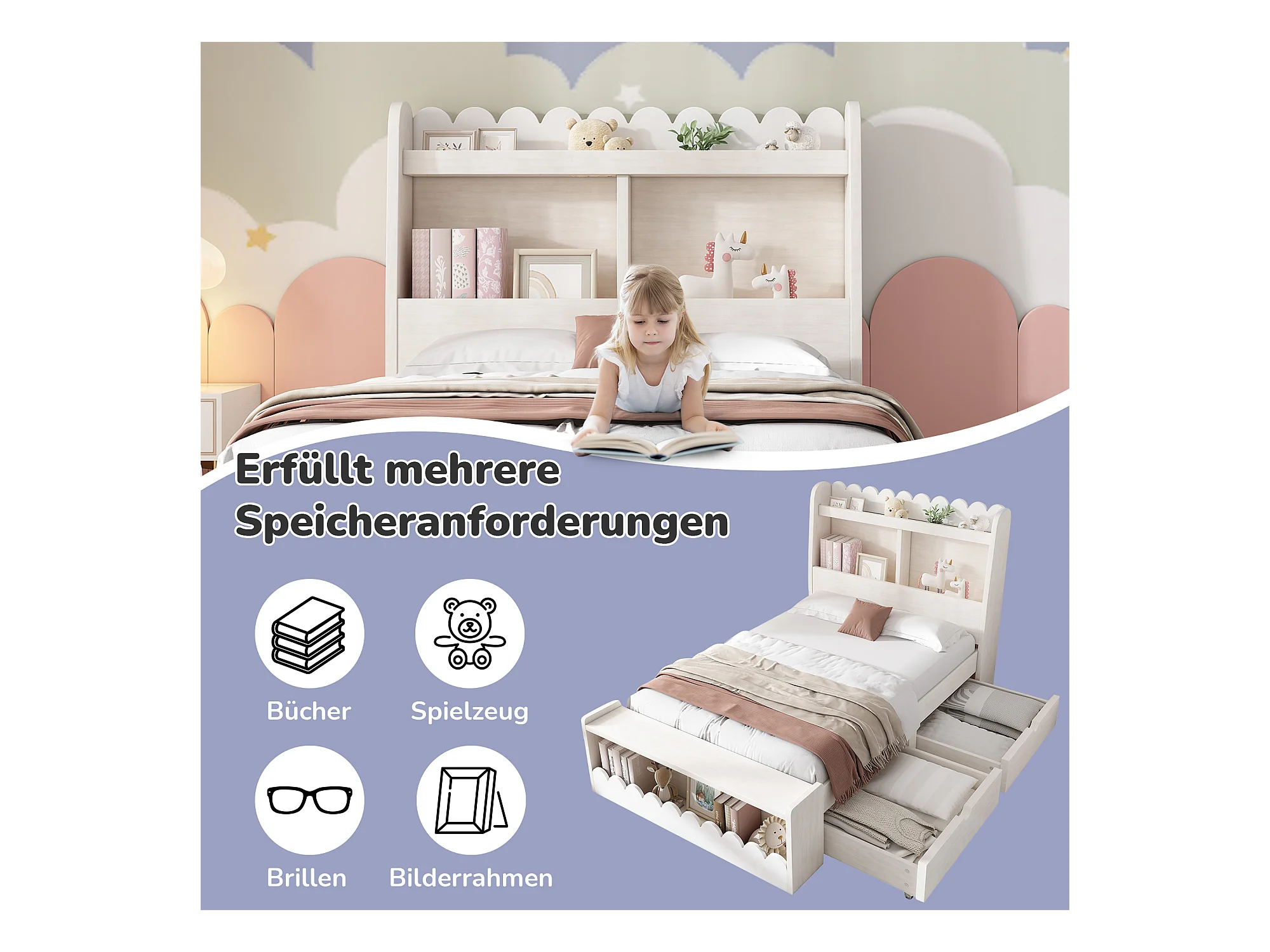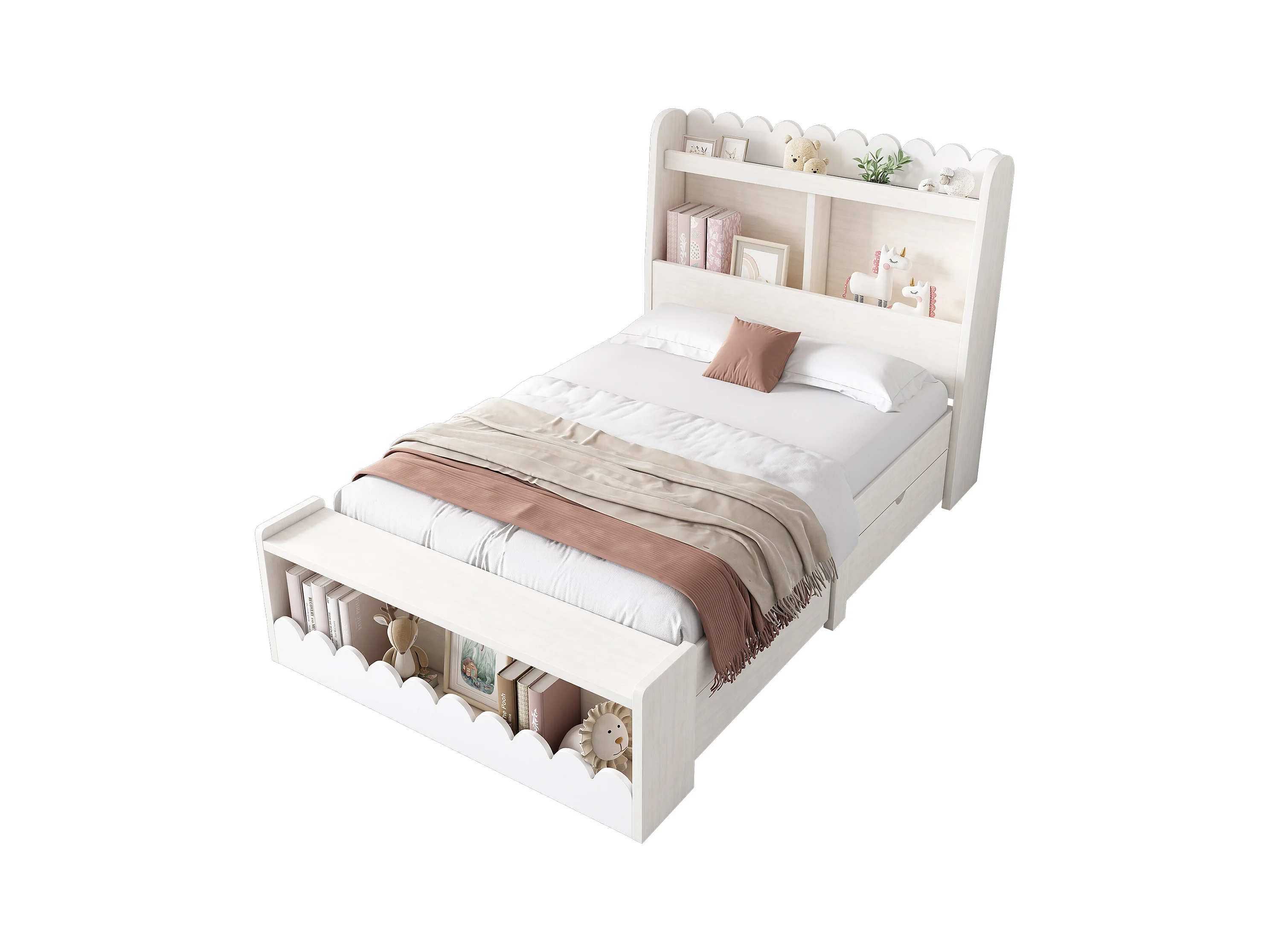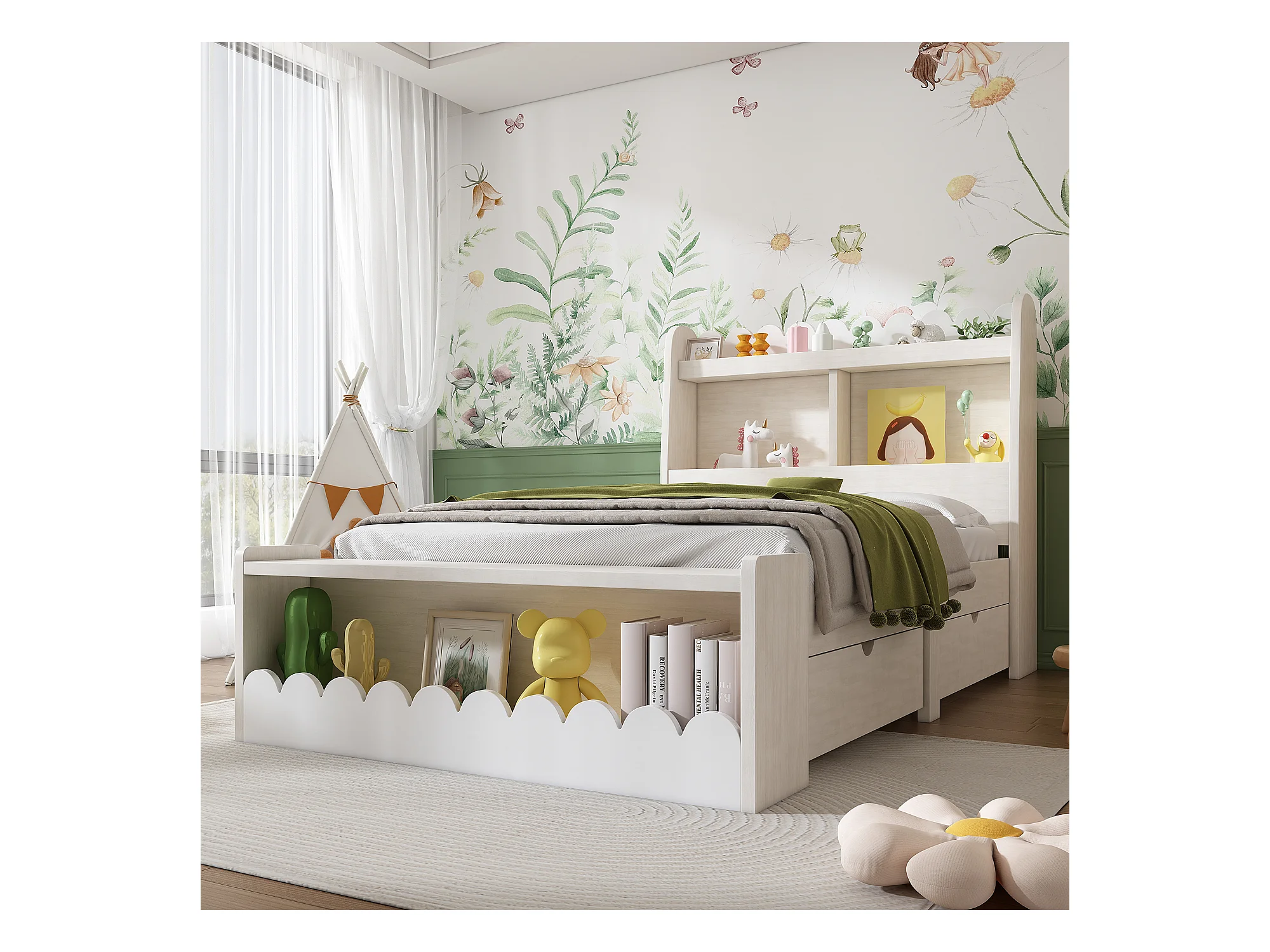 Lit enfant 90 x 190 cm avec 2 tiroirs, étagère et banc - Bois massif + MDF - Sommier à lattes - Chêne/blanc (sans matelas)