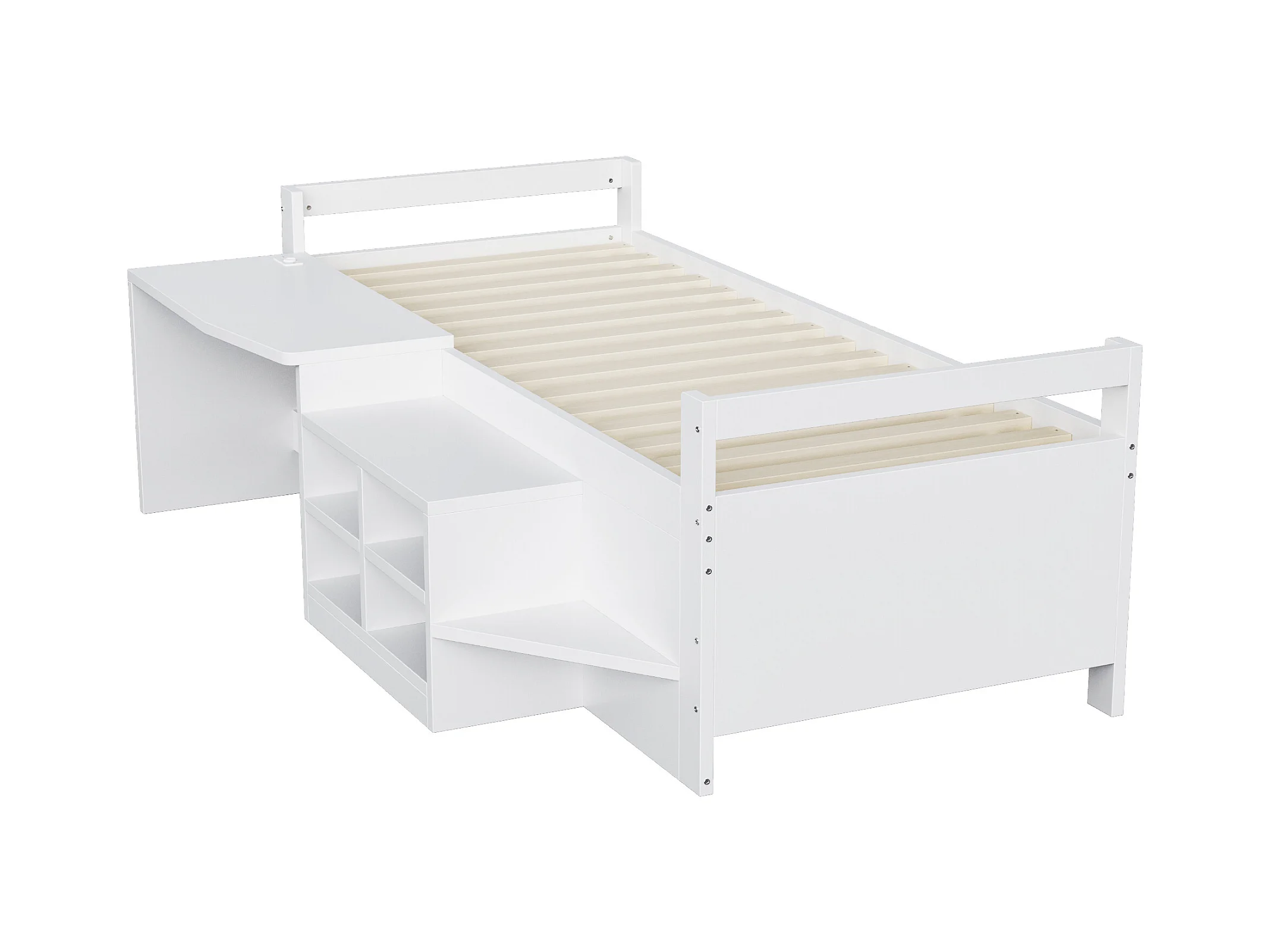 Lit enfant 90 x 200 cm avec étagères de rangement - Bois de pin + MDF - Sommier à lattes - Blanc (sans matelas)