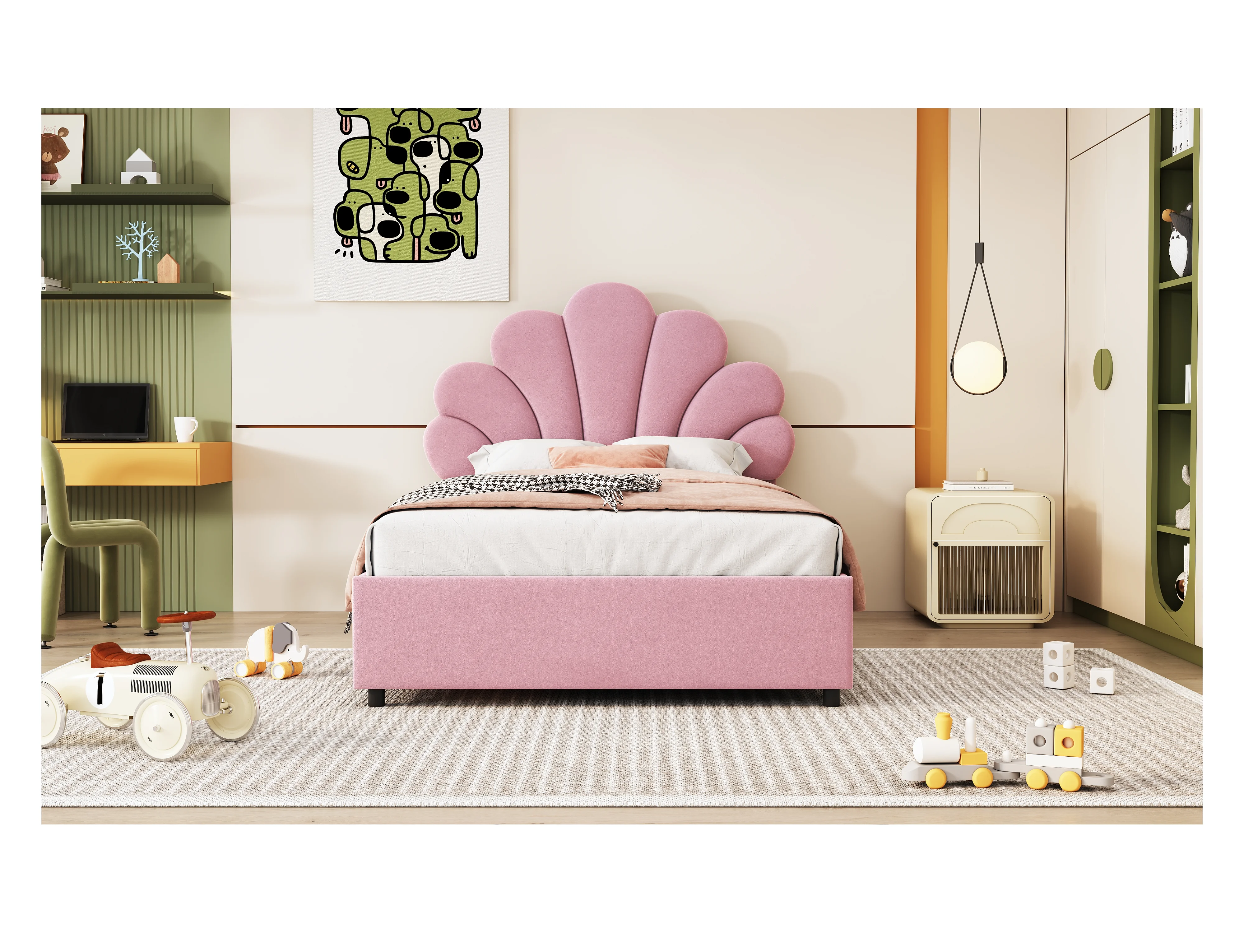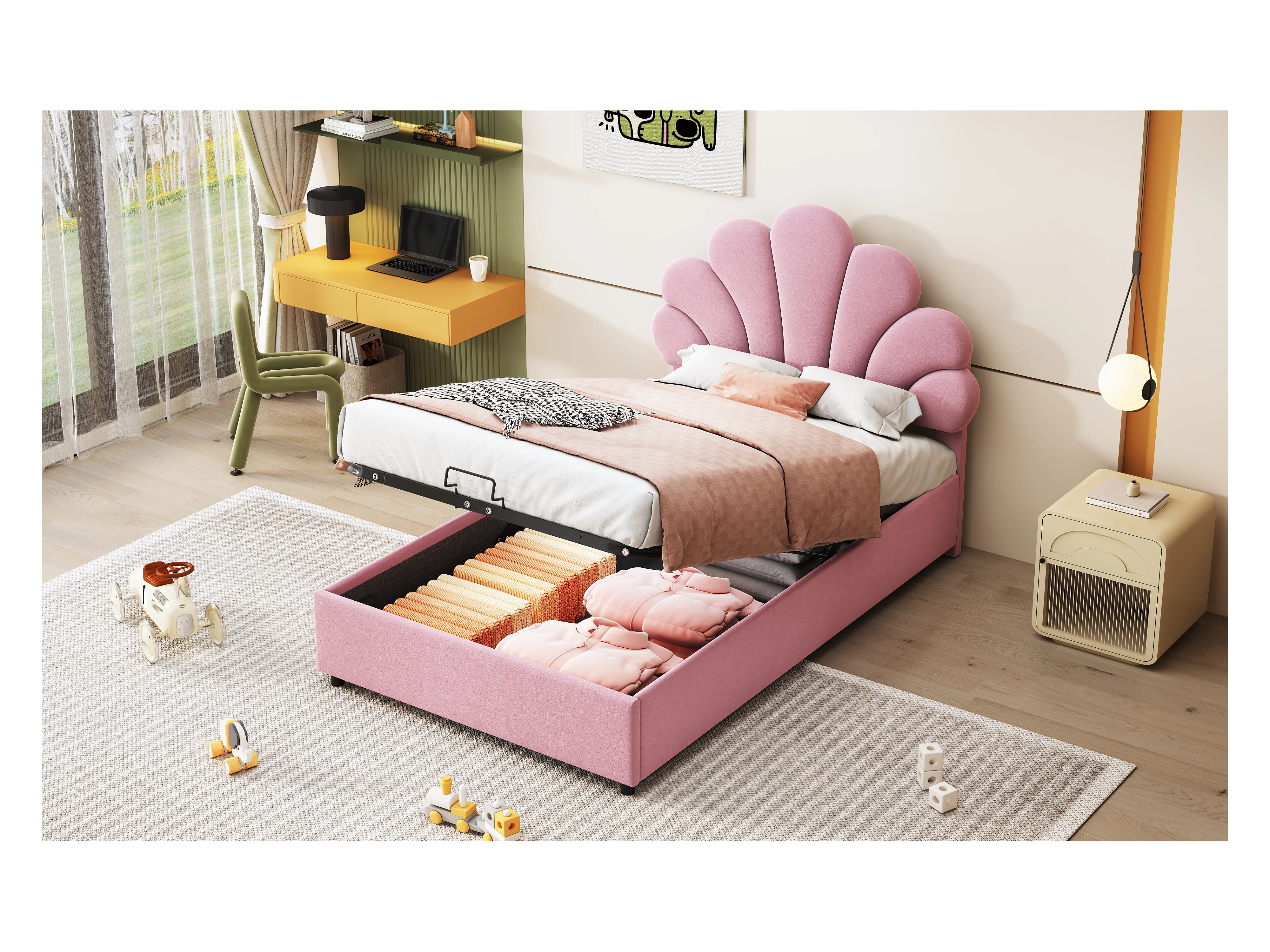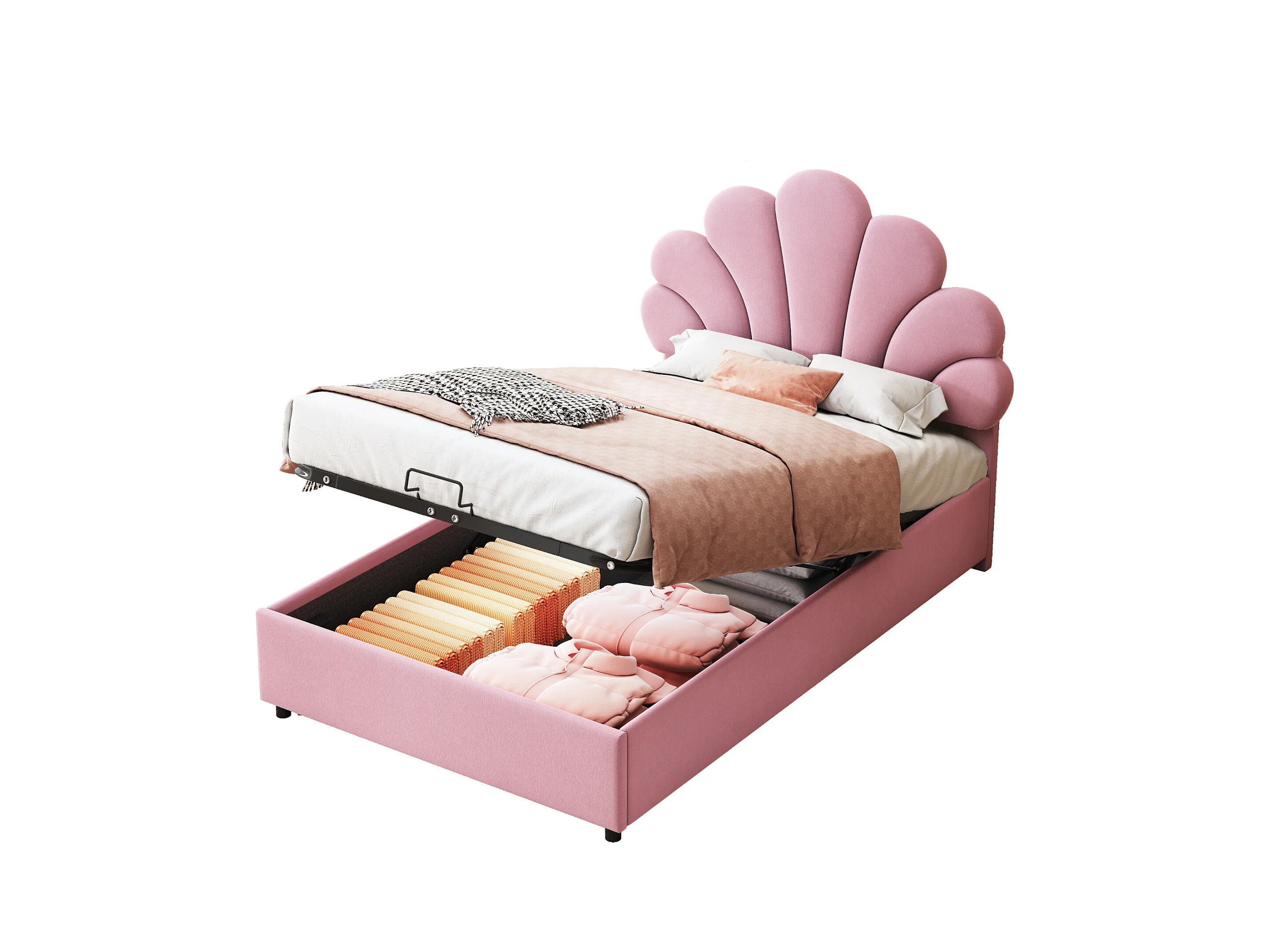 Lit enfant 90 x 200 cm, avec tête de lit fleurie, lattenrost, réglable et hydraulique, tissu velours rose (203x94x115 cm)