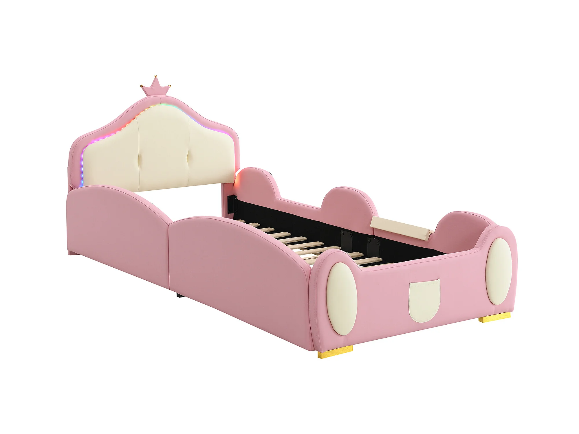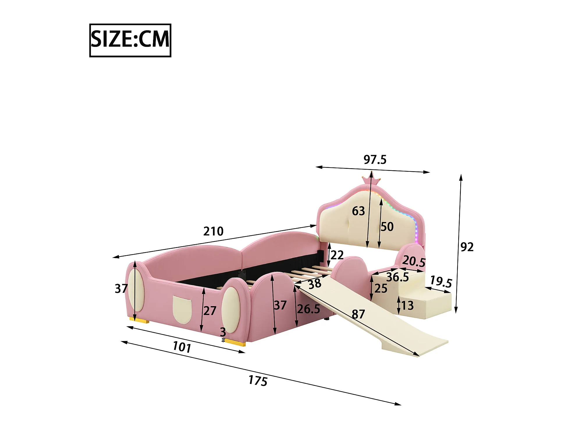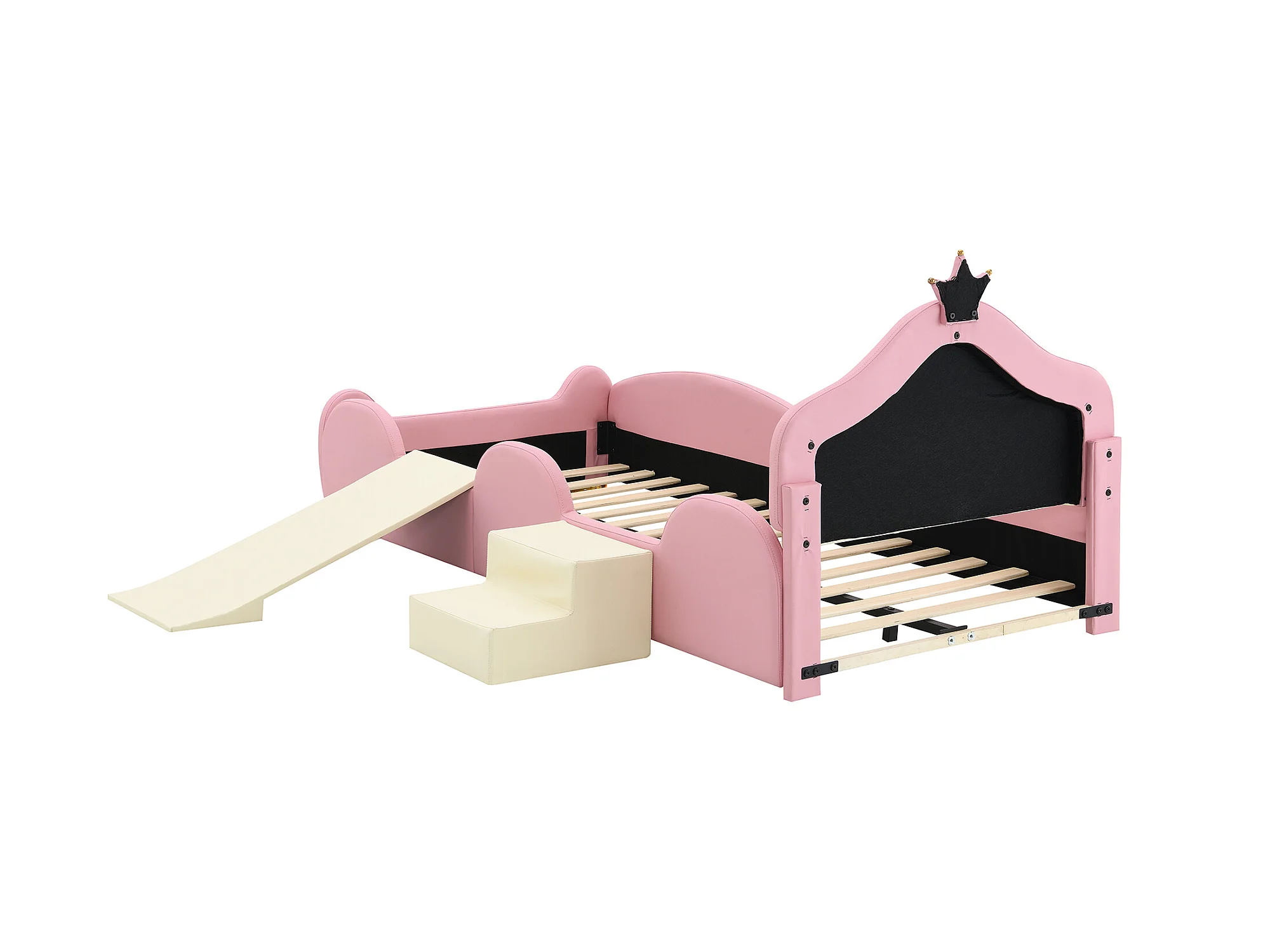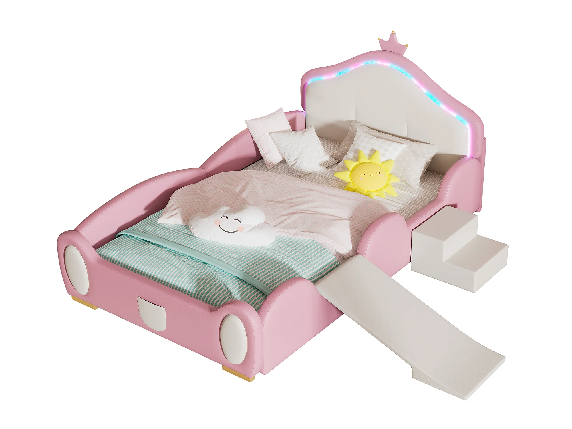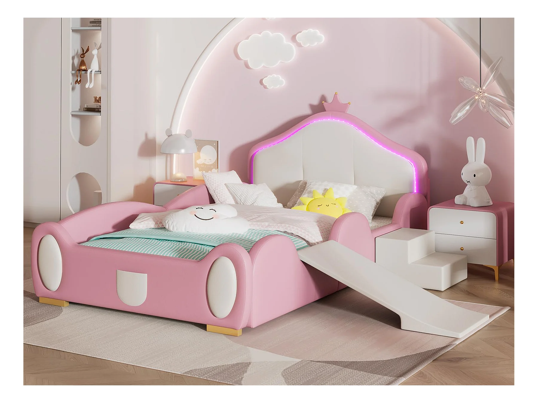 Lit enfant 90 x 200 cm avec toboggan et escalier, rembourré en cuir pu, LEDs, rose + beige
