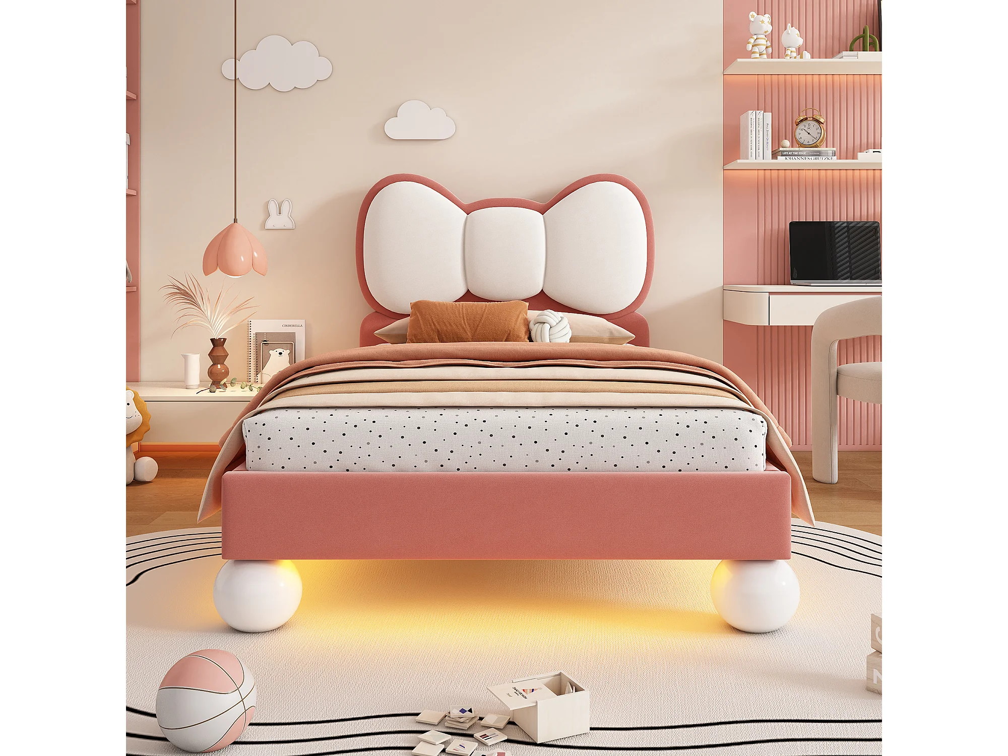 Lit enfant 90 x 200 cm - Lit simple avec LED et tête de lit bombée - velours rose - sans matelas