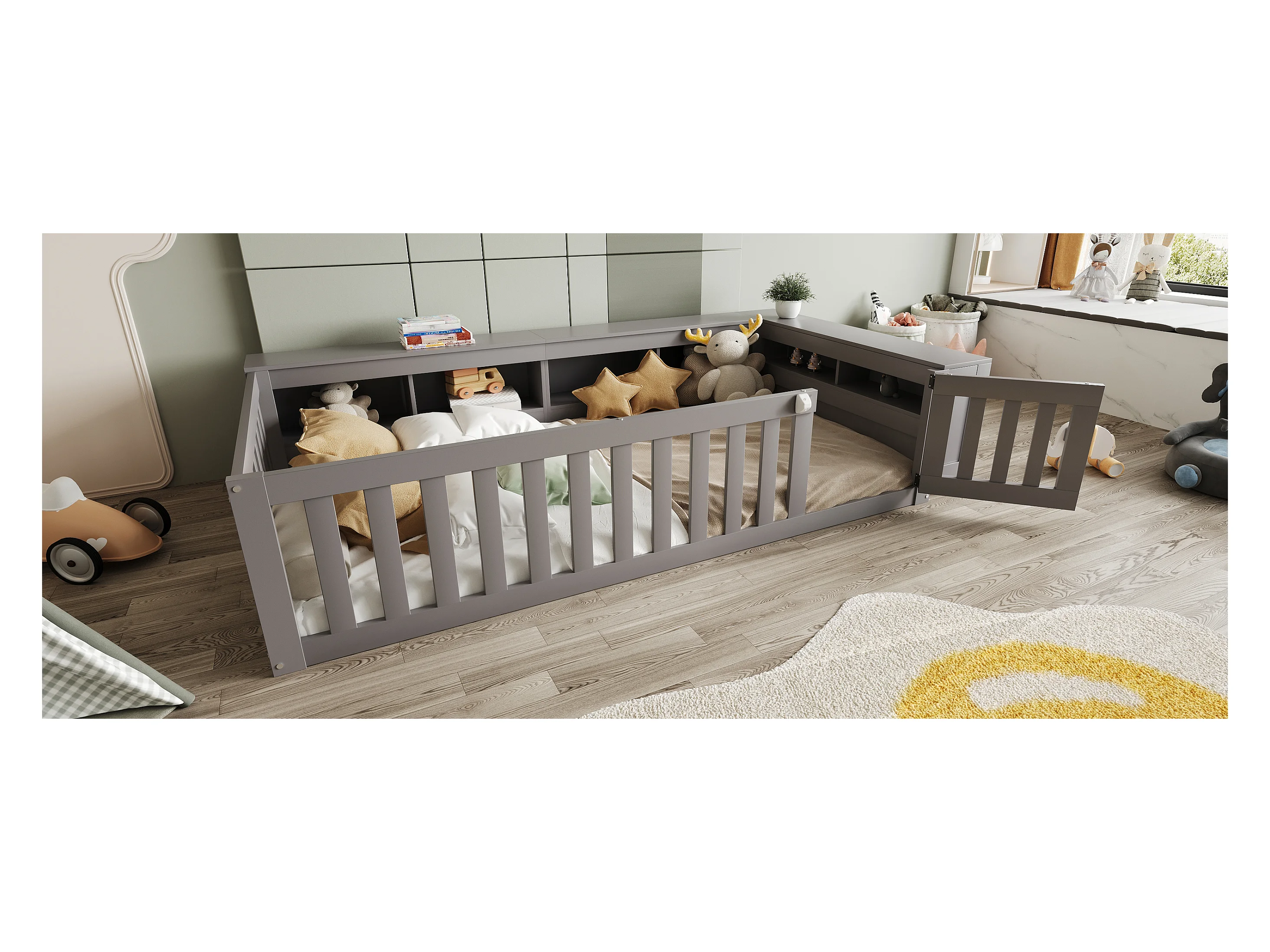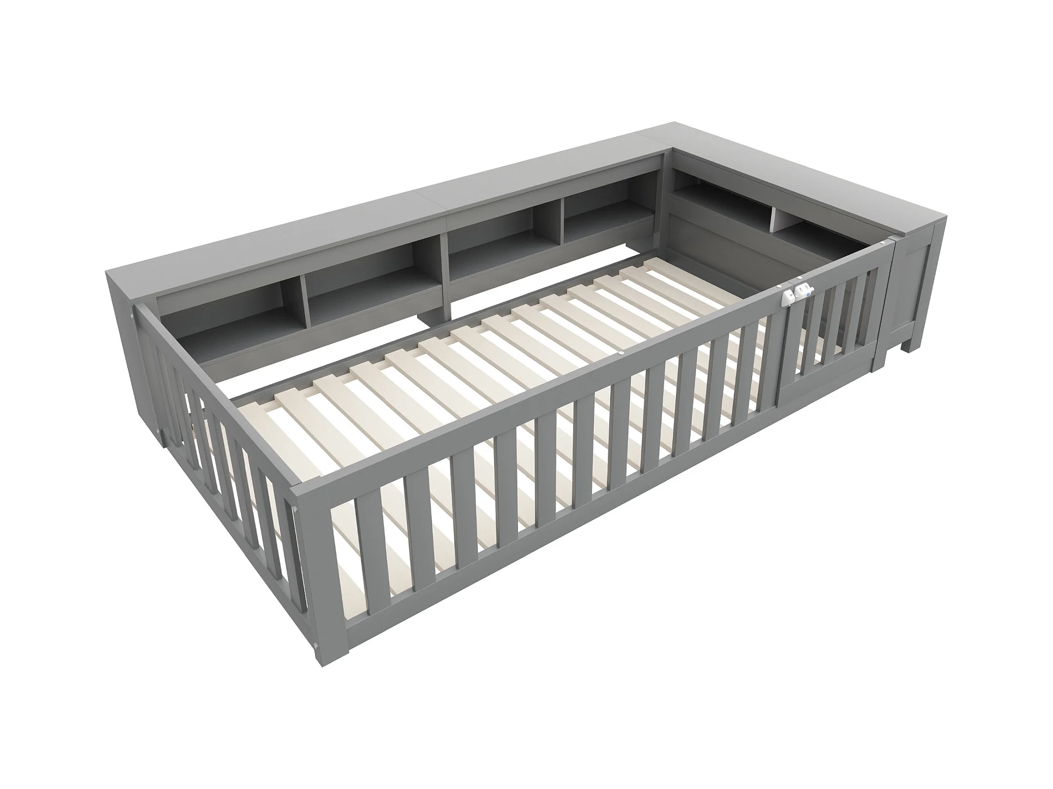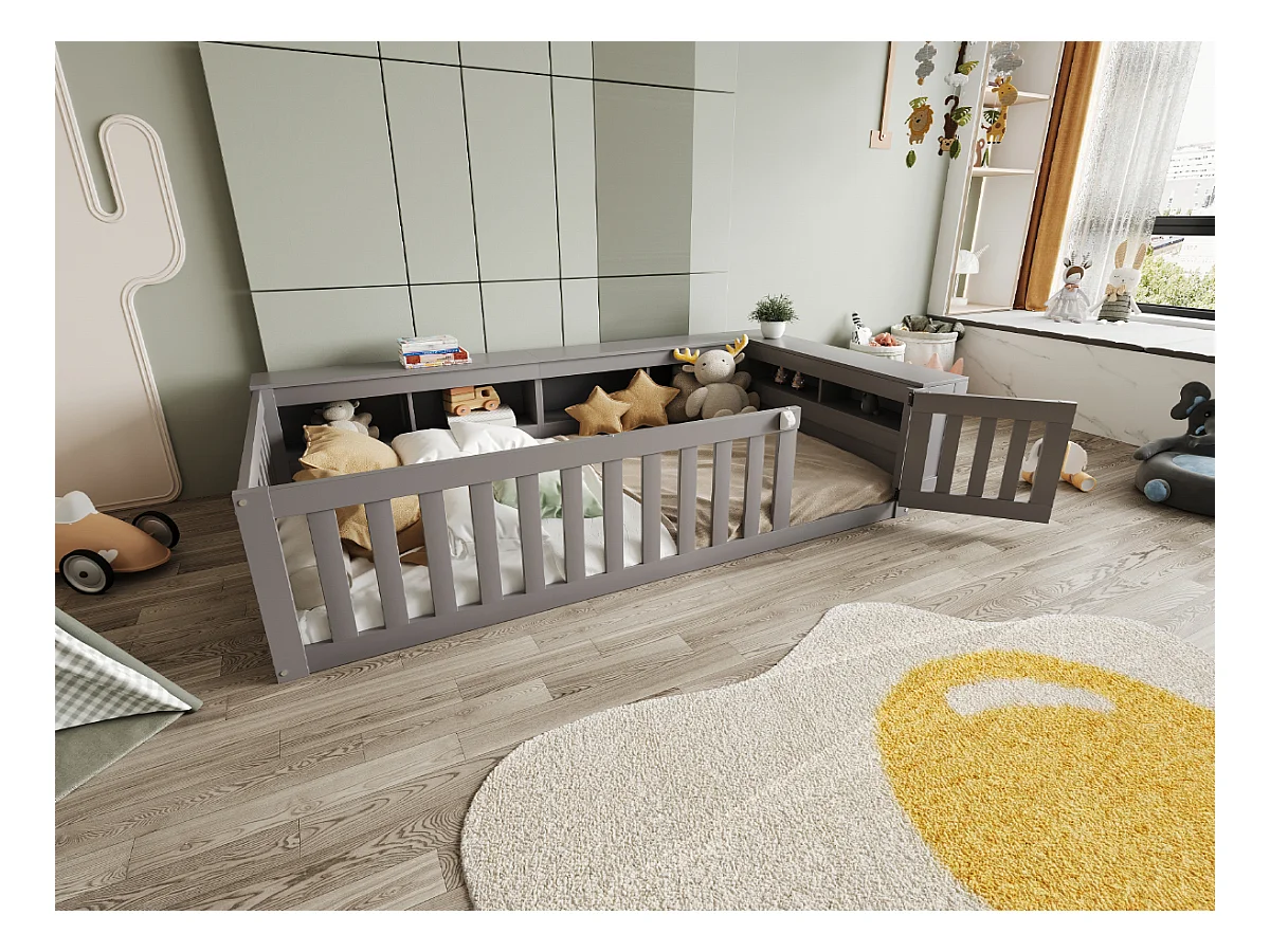 Lit enfant 90x200, avec toit, fenêtres, rangements et barrière de sécurité, bois massif, gris (222.6x112x45 cm)