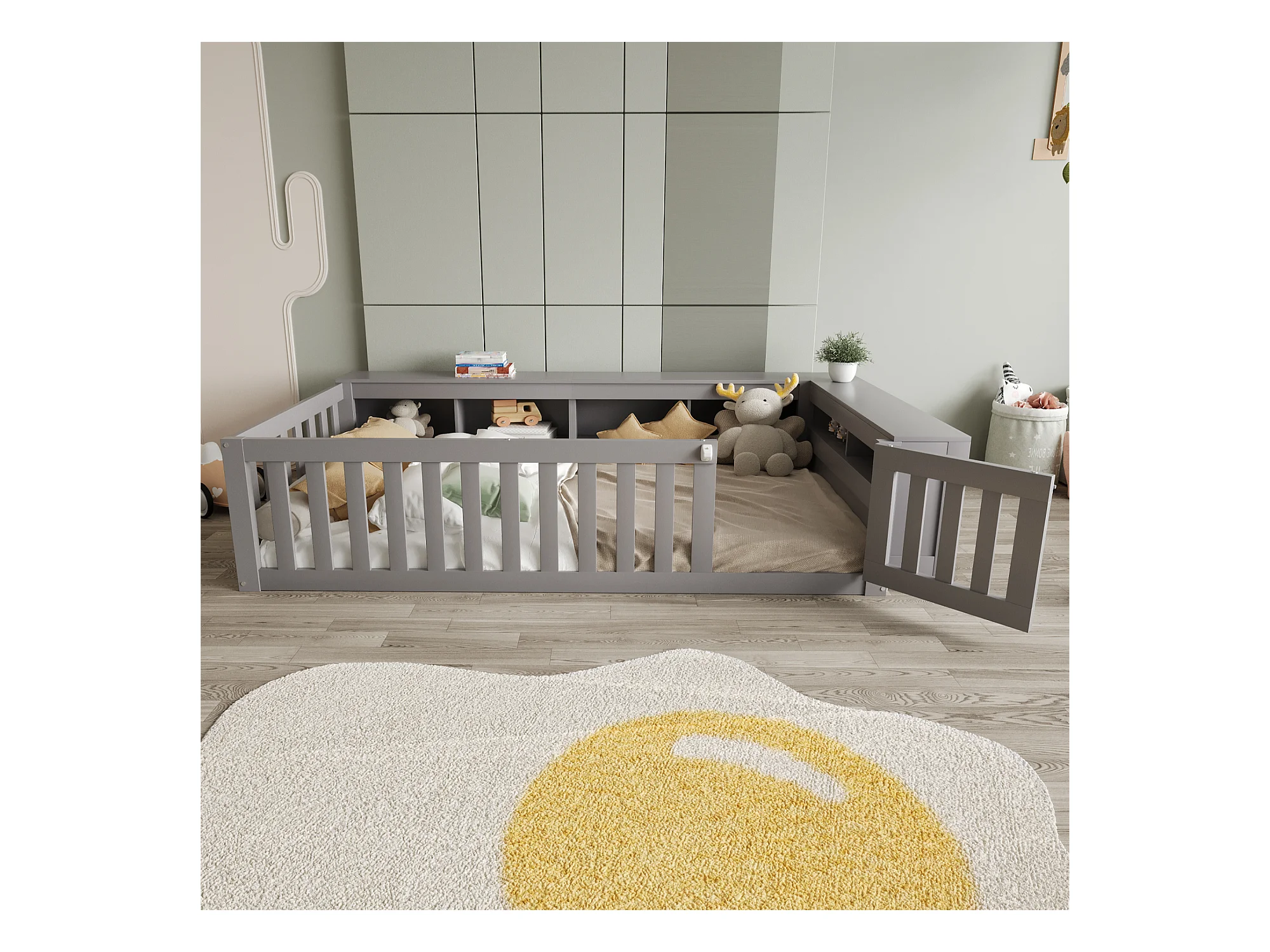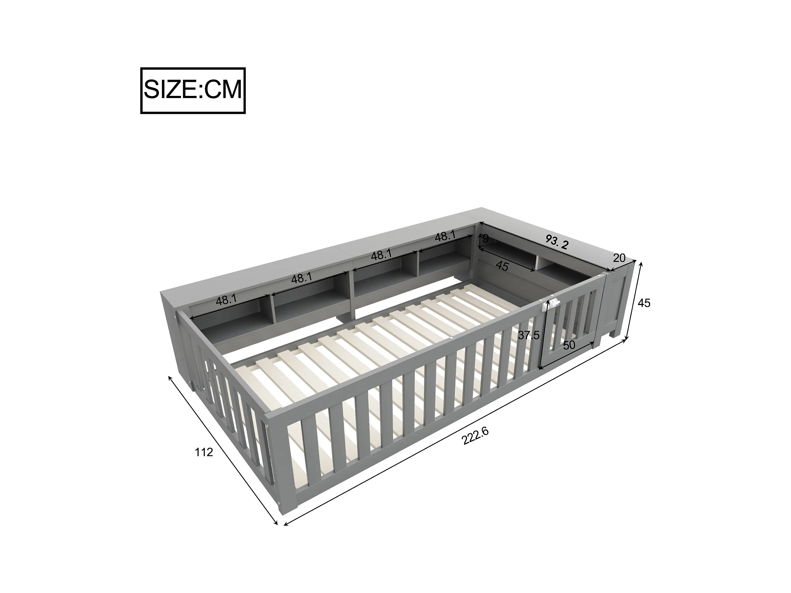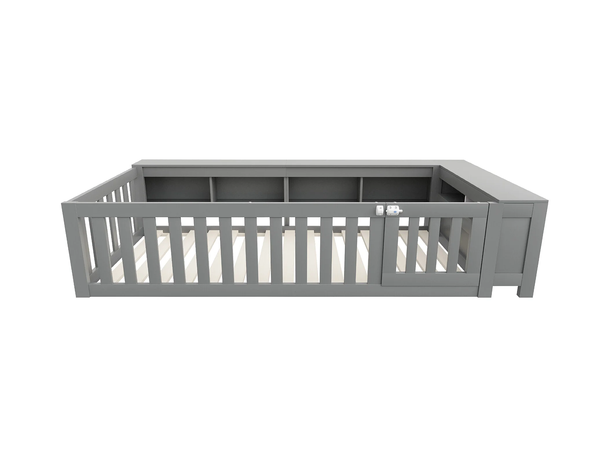 Lit enfant 90x200, avec toit, fenêtres, rangements et barrière de sécurité, bois massif, gris (222.6x112x45 cm)