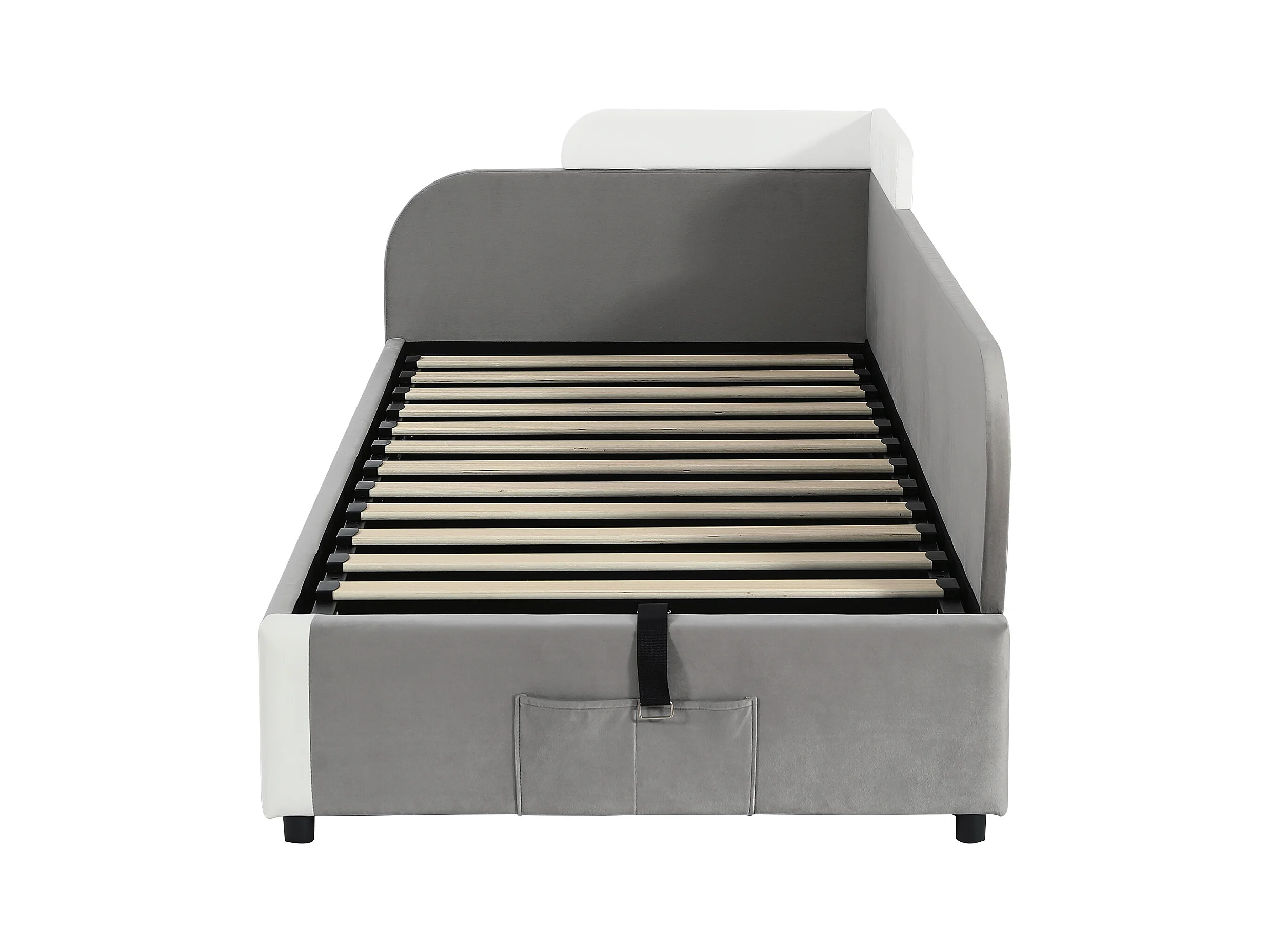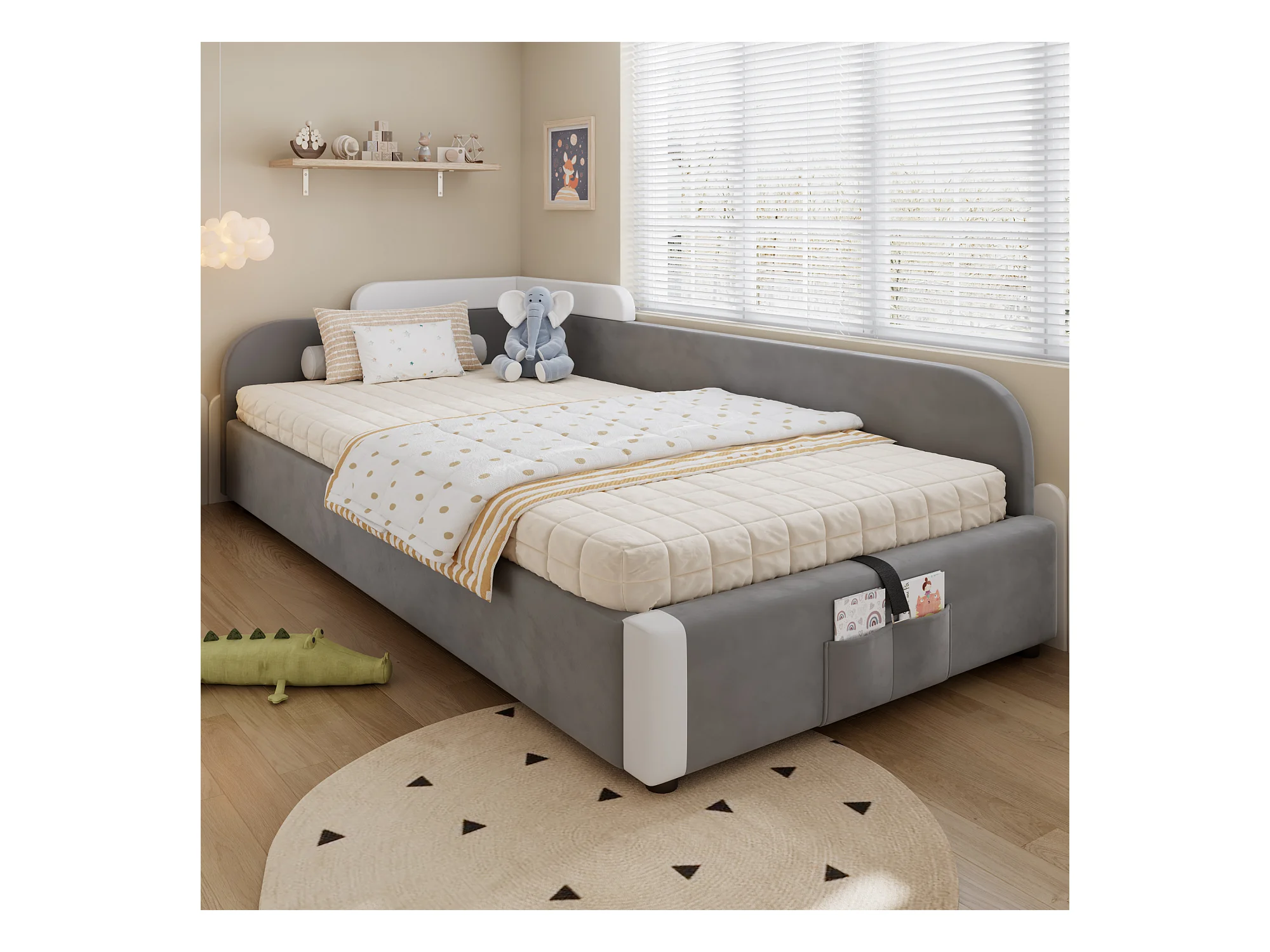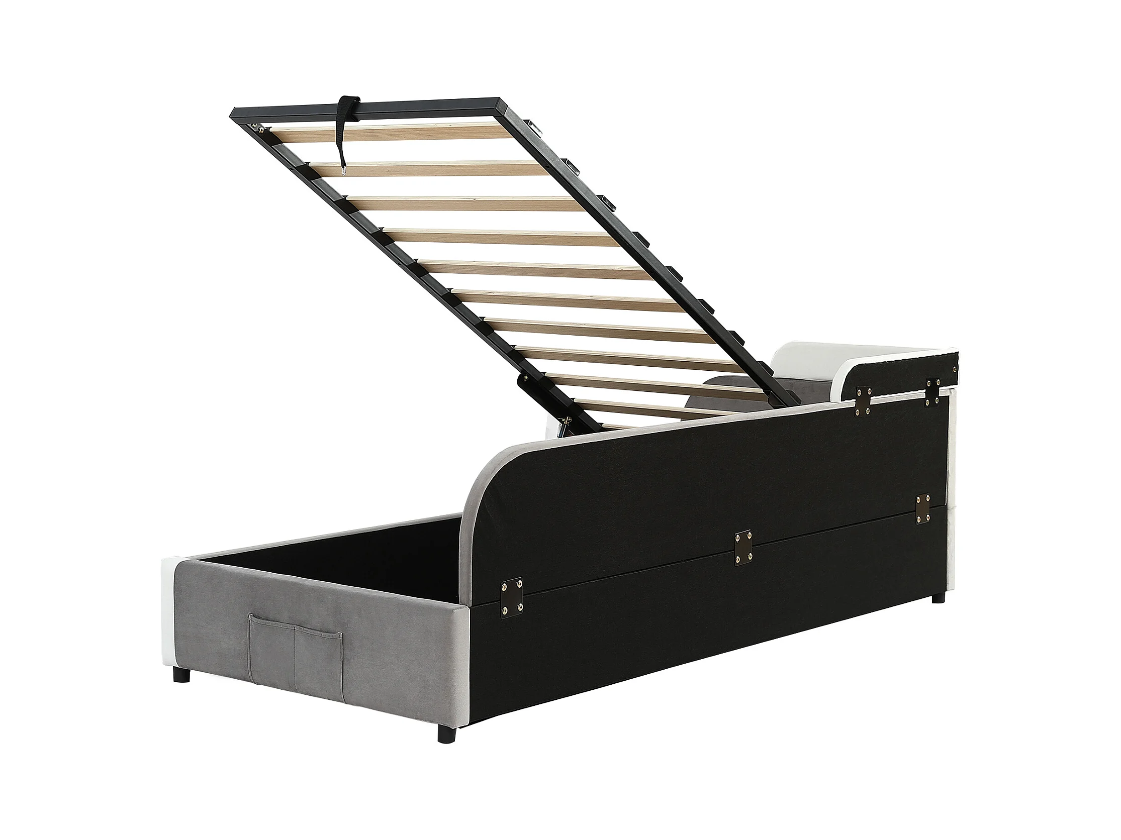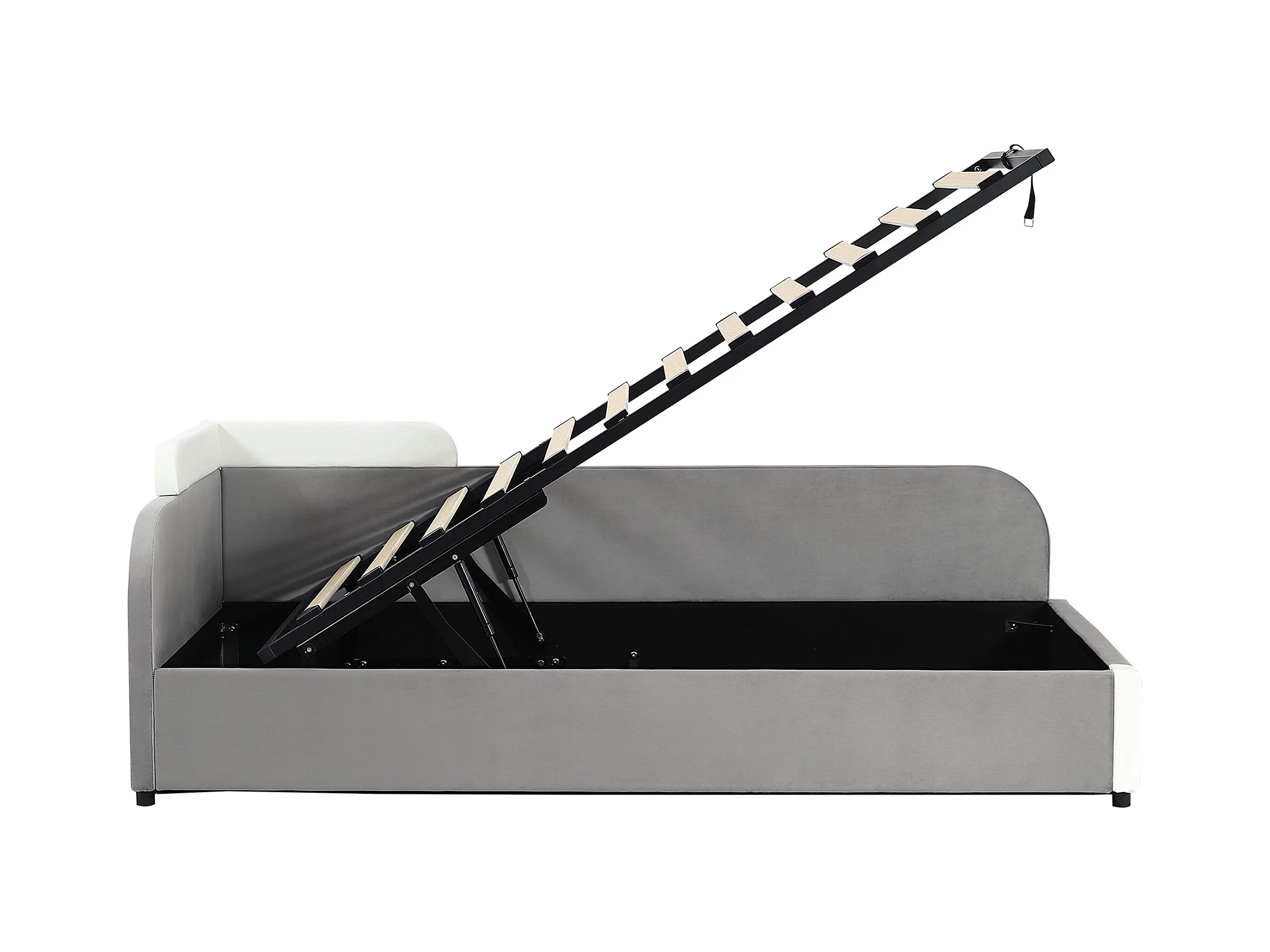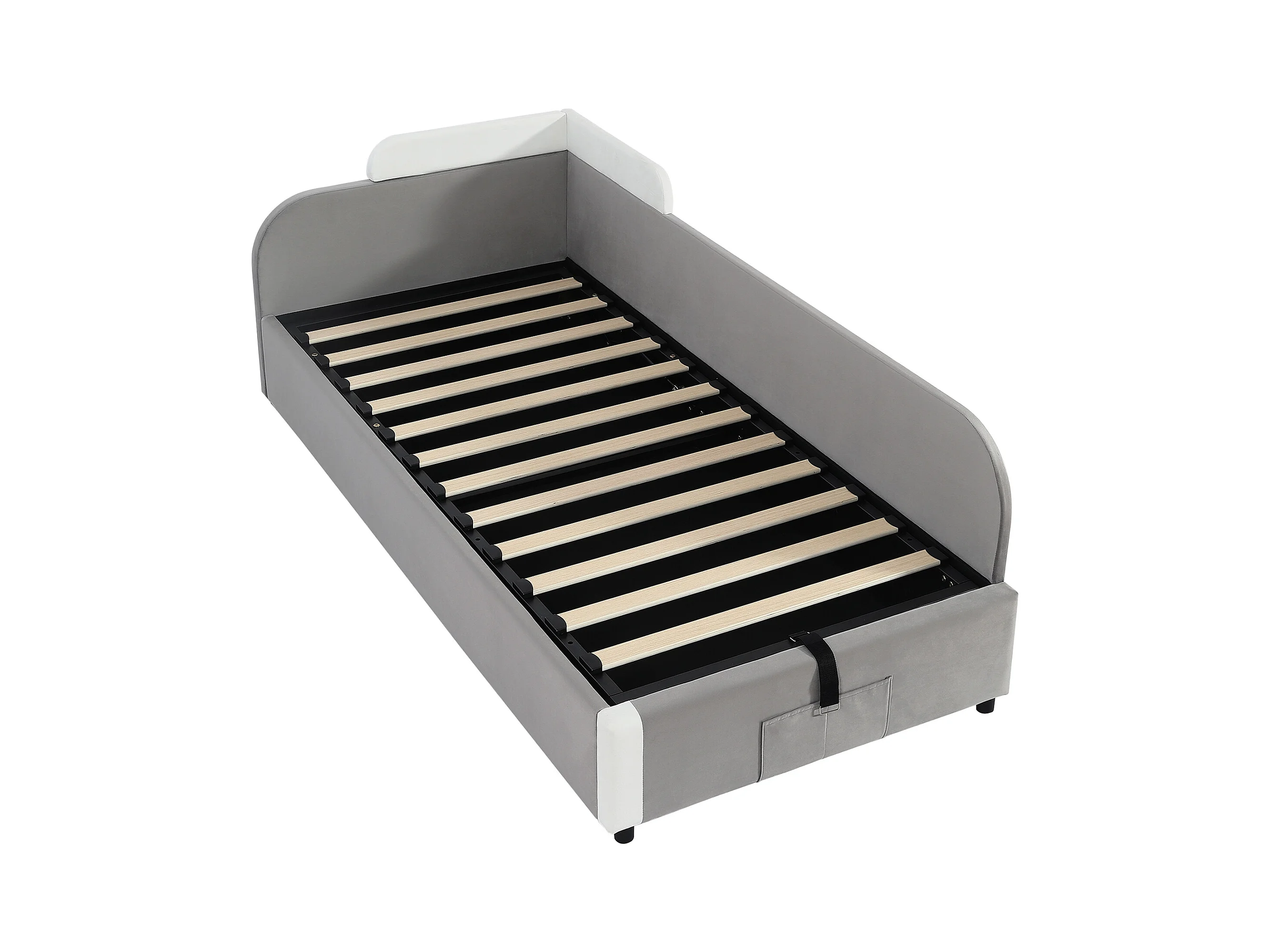 Lit enfant 90x200 cm avec rangement, côté droit, velours gris - sans matelas
