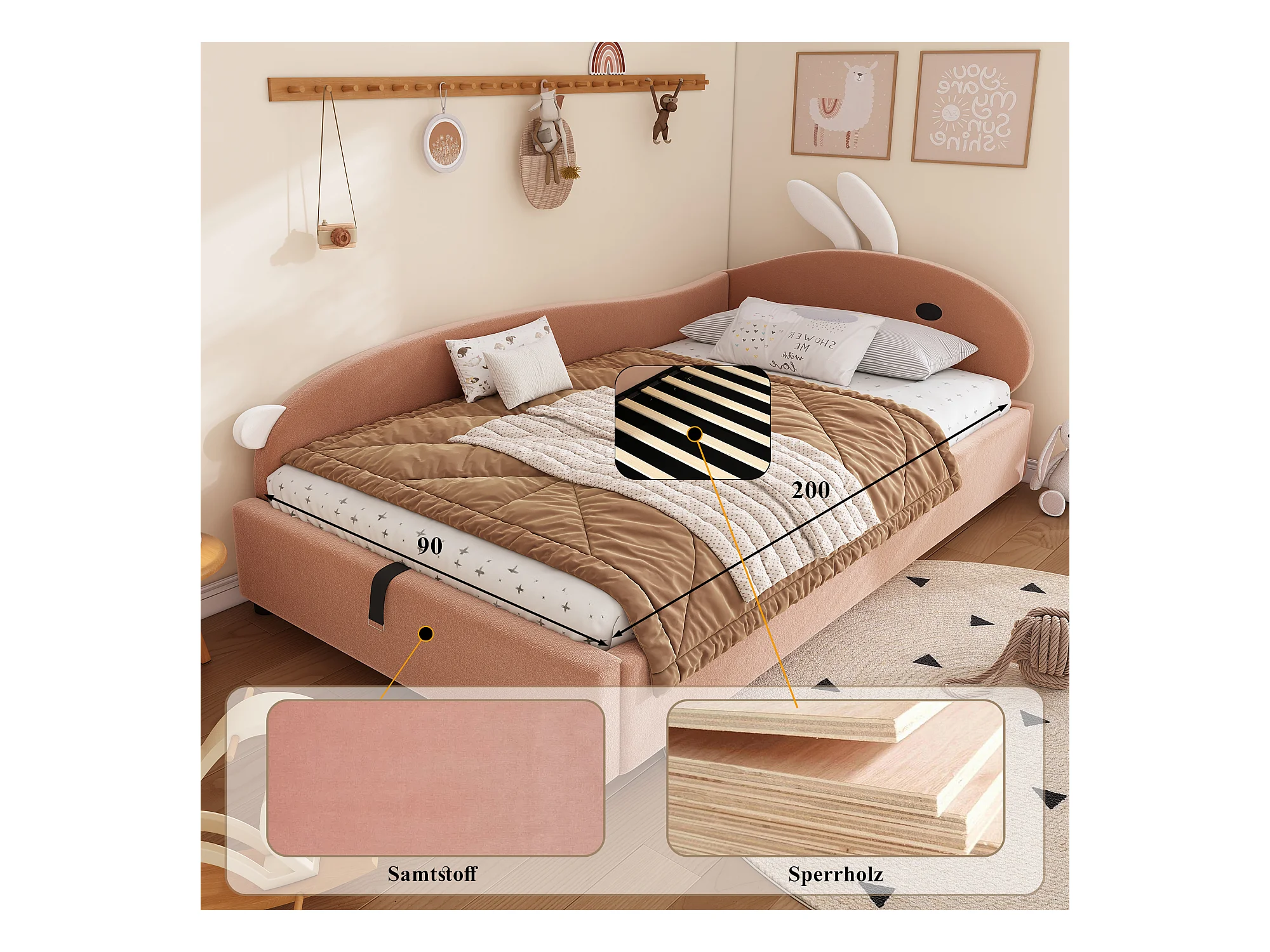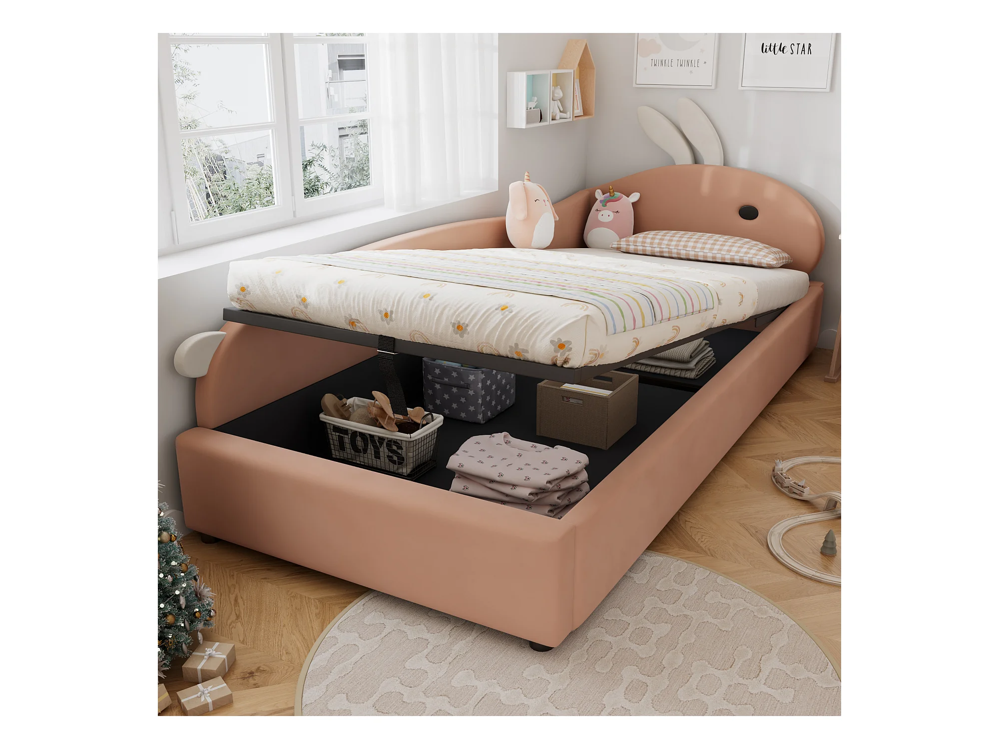 Lit enfant 90x200 cm, avec rangement hydraulique, tête de lit en forme de lapin, tissu en velours, gris et blanc, 205x93.5x92 cm