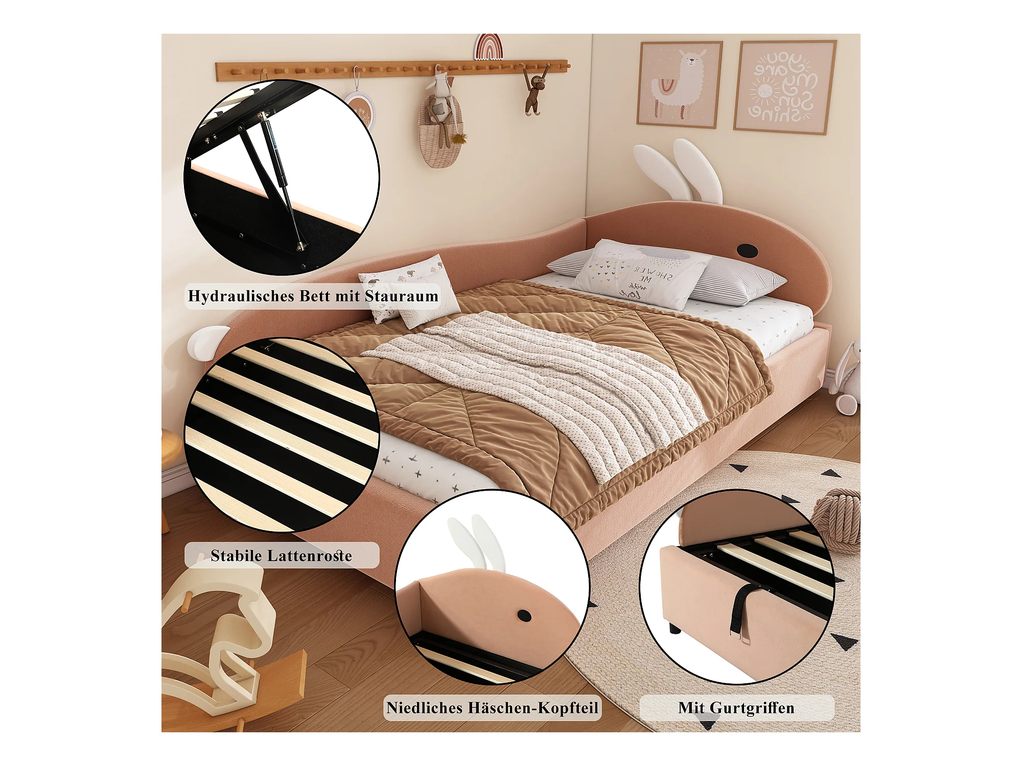 Lit pour enfant 90x200 cm, avec tête de lit en forme de lapin, système hydraulique de rangement, tissu en velours, gris et blanc (205x93.5x92 cm)