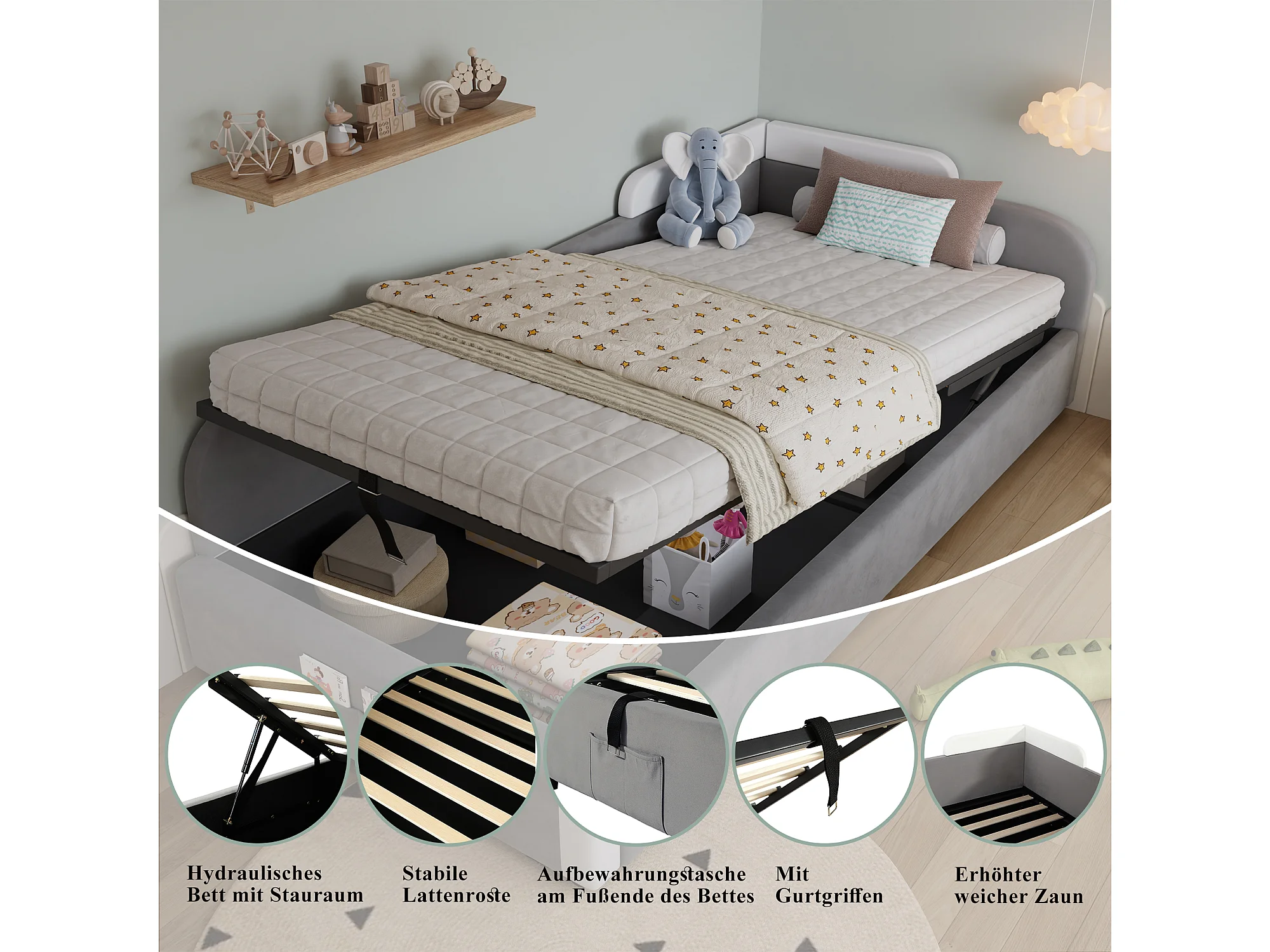 Lit enfant 90x200 cm, avec rangement hydraulique, tissu en velours, barrières de sécurité, gris (205x93.5x71 cm)