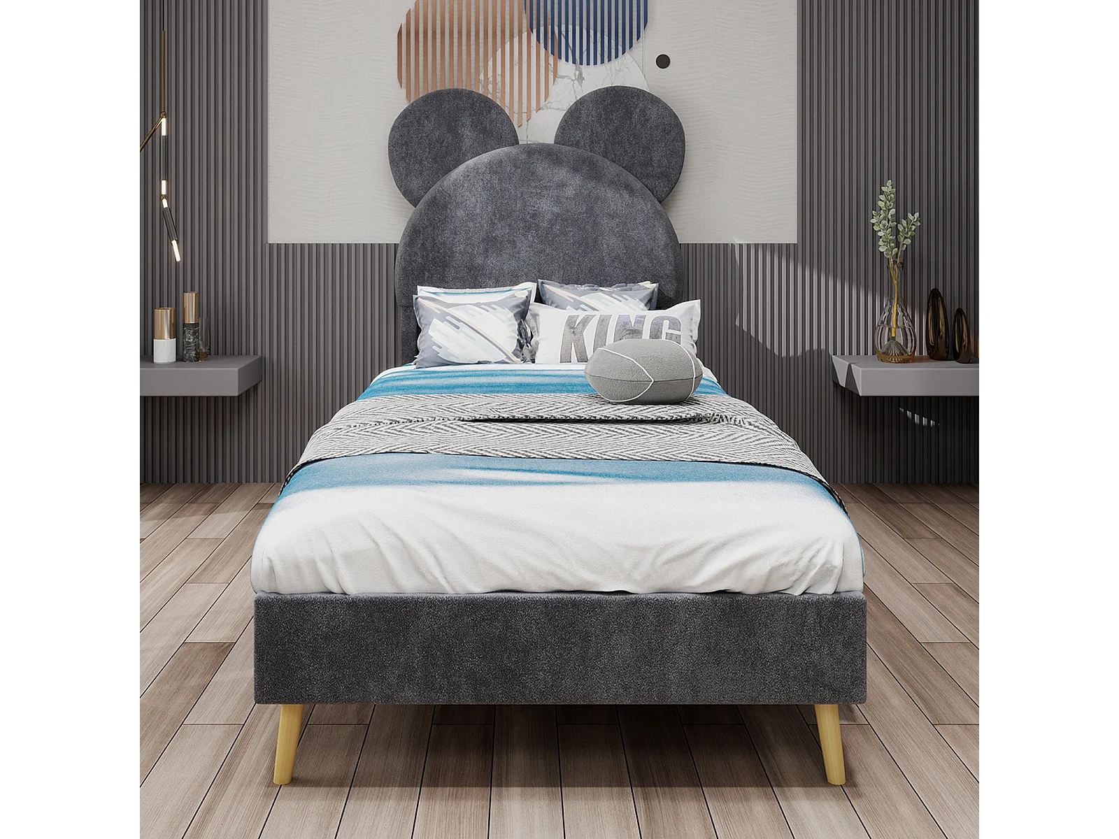 Lit enfant 90x200 cm avec tête de lit dessin animé et sommier à lattes - velours gris (sans matelas)