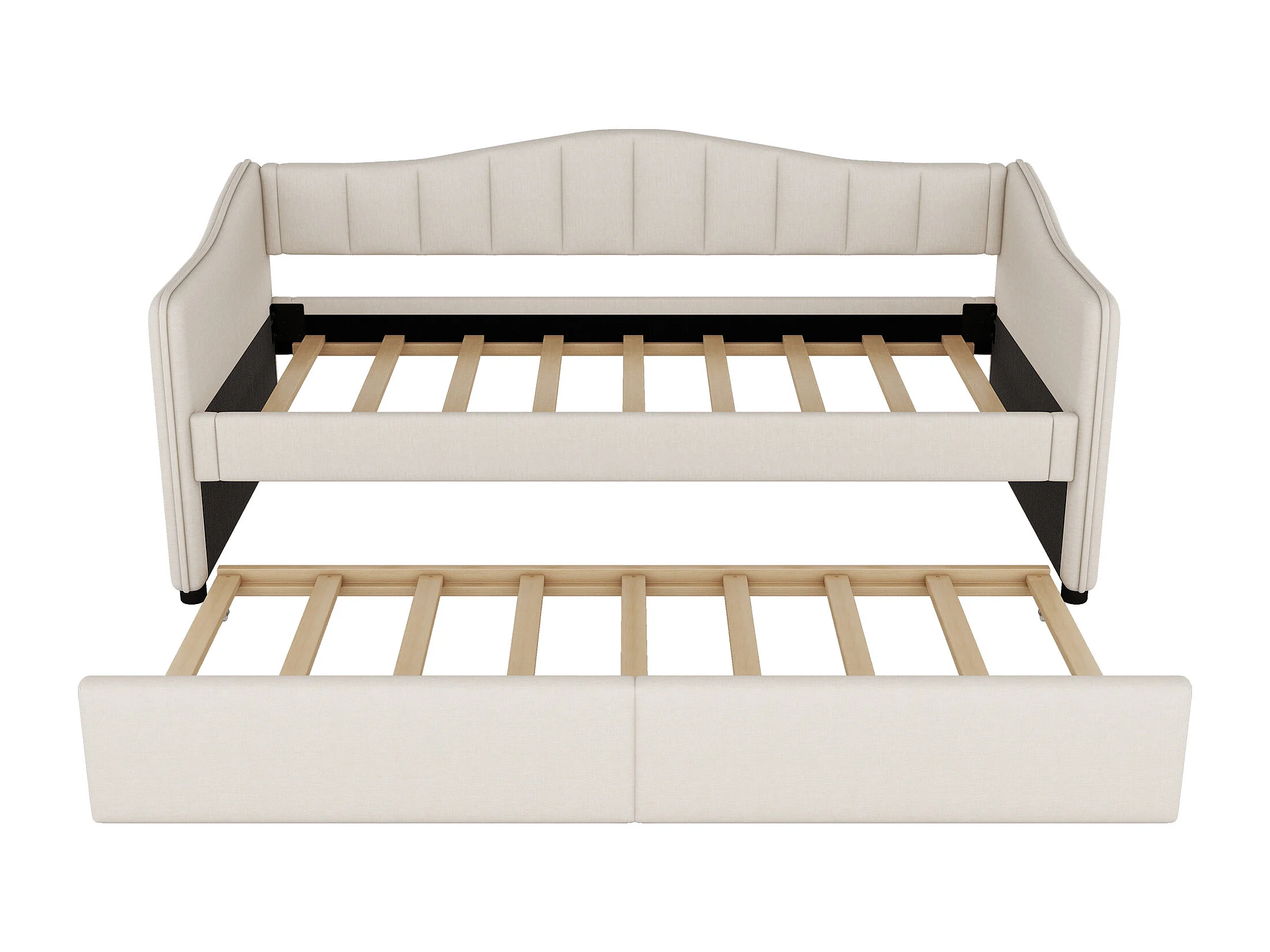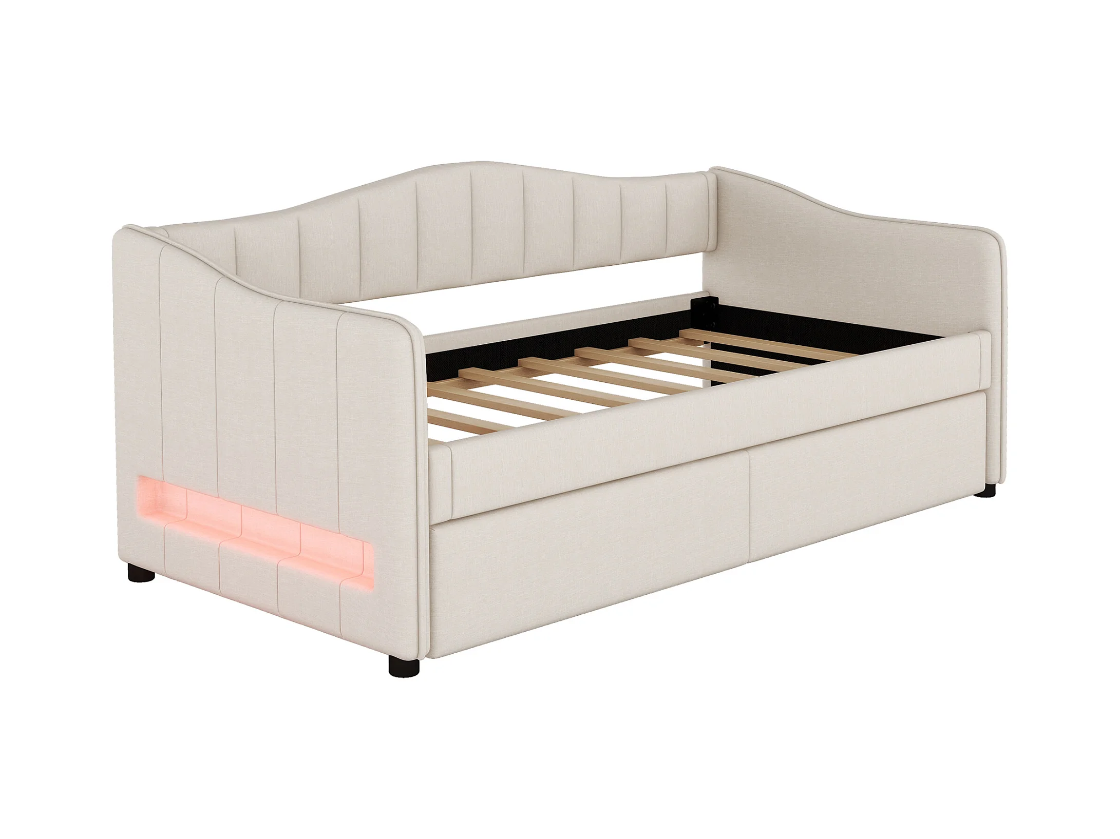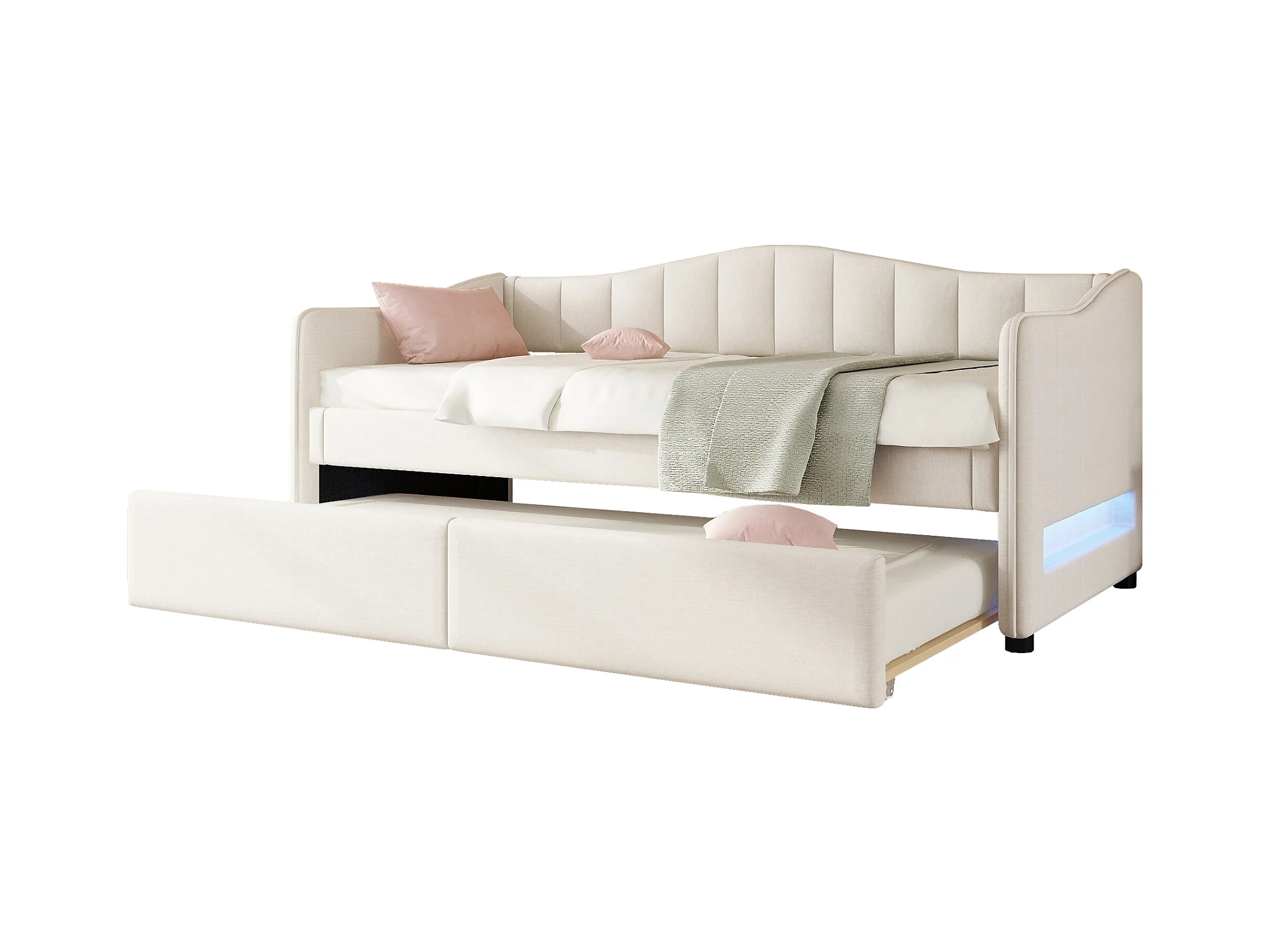 Lit enfant 90x200 cm beige avec LED, lit adulte en lin avec lit gigogne, sans matelas