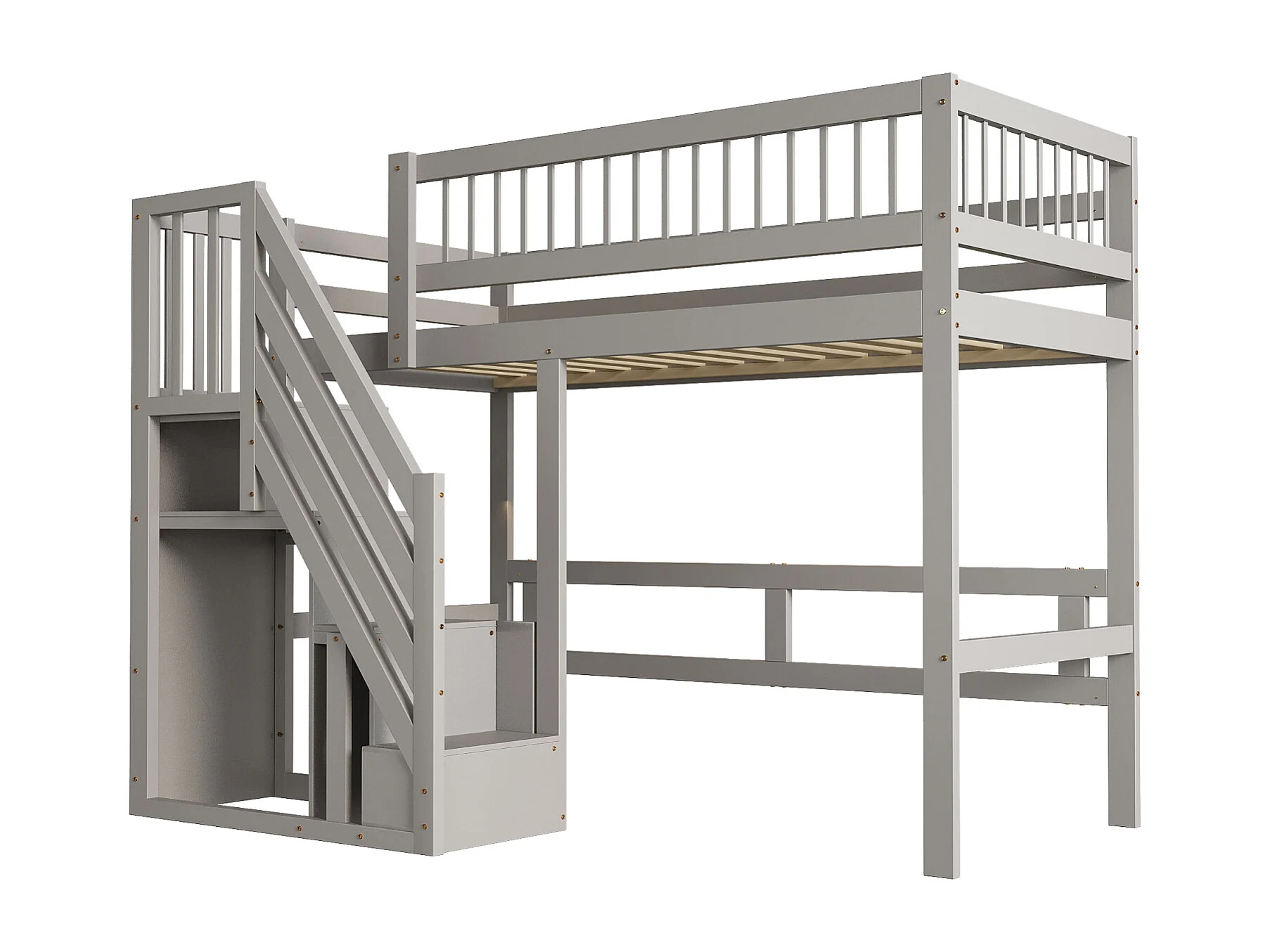 Lit enfant 90x200 cm en bois massif gris avec escalier et rangement intégré – lit pratique et solide pour enfants et adolescents