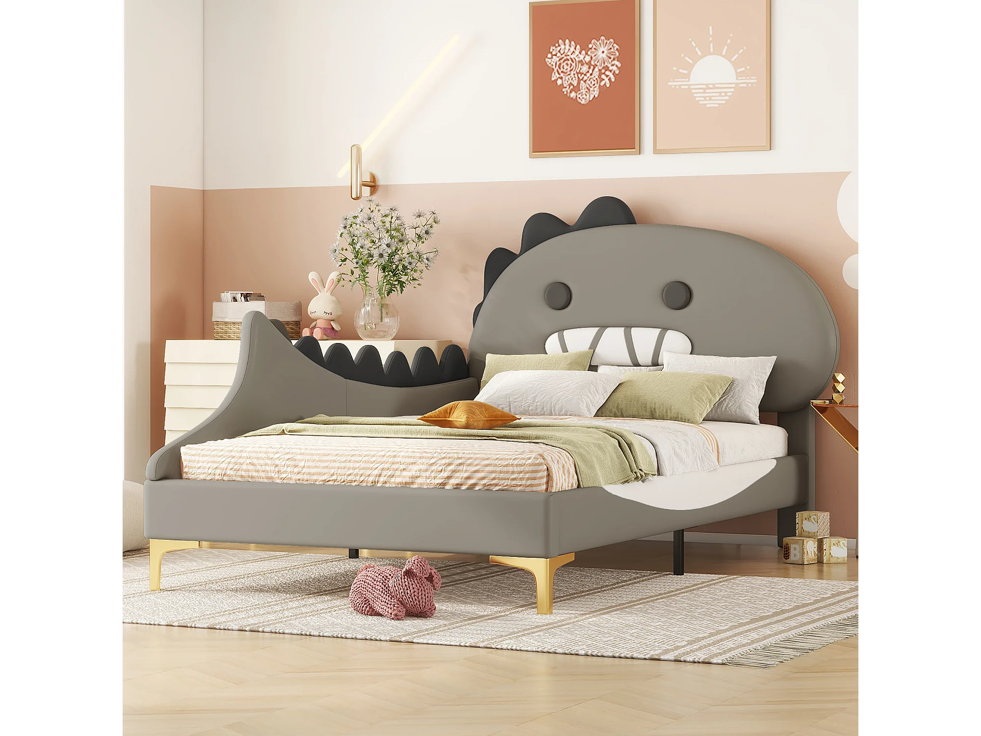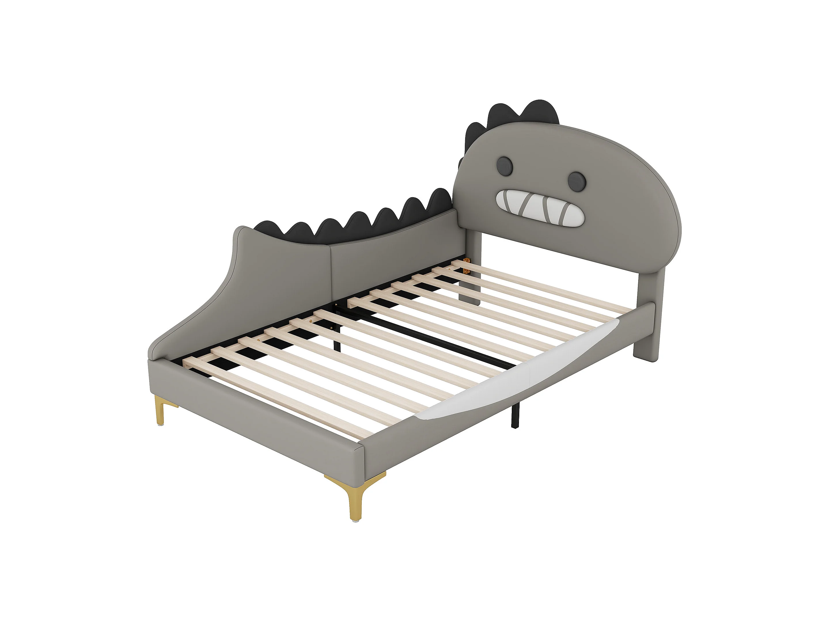 Lit enfant 90x200 cm, forme dinosaure, flachbett, PU, gris (209x94x110 cm)