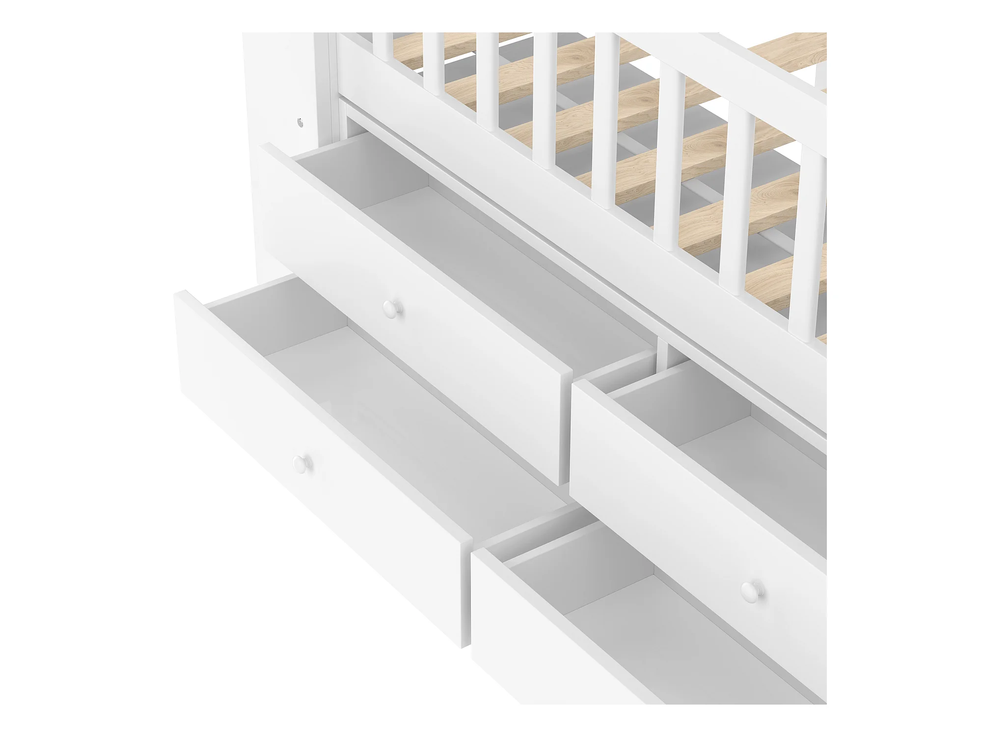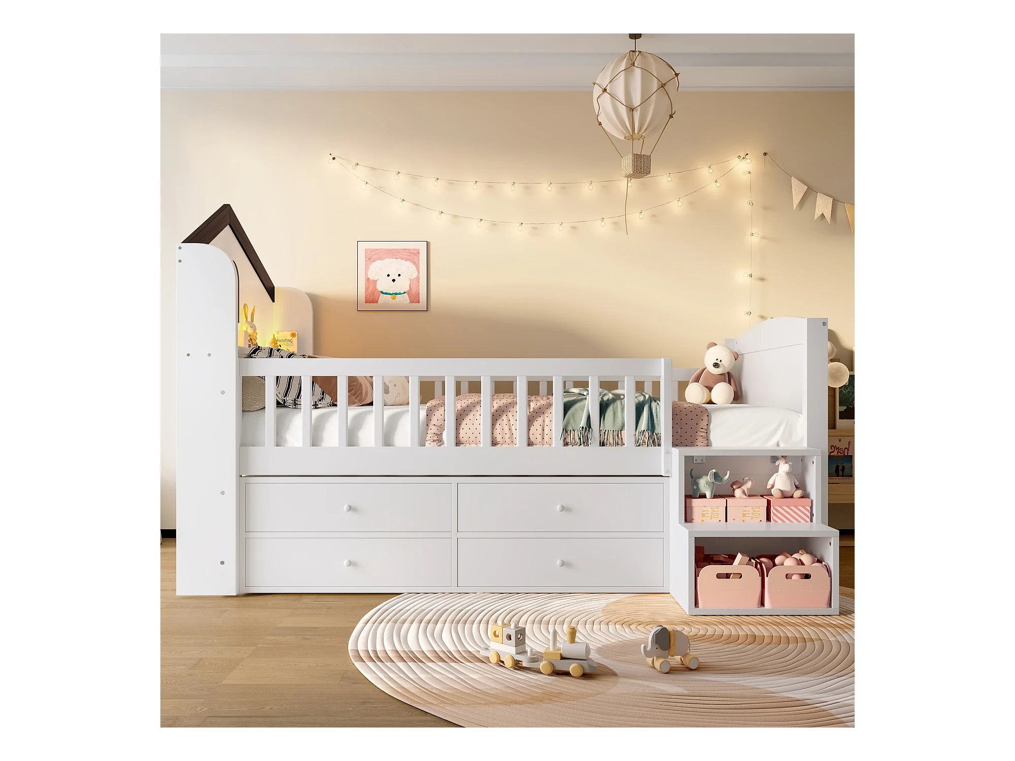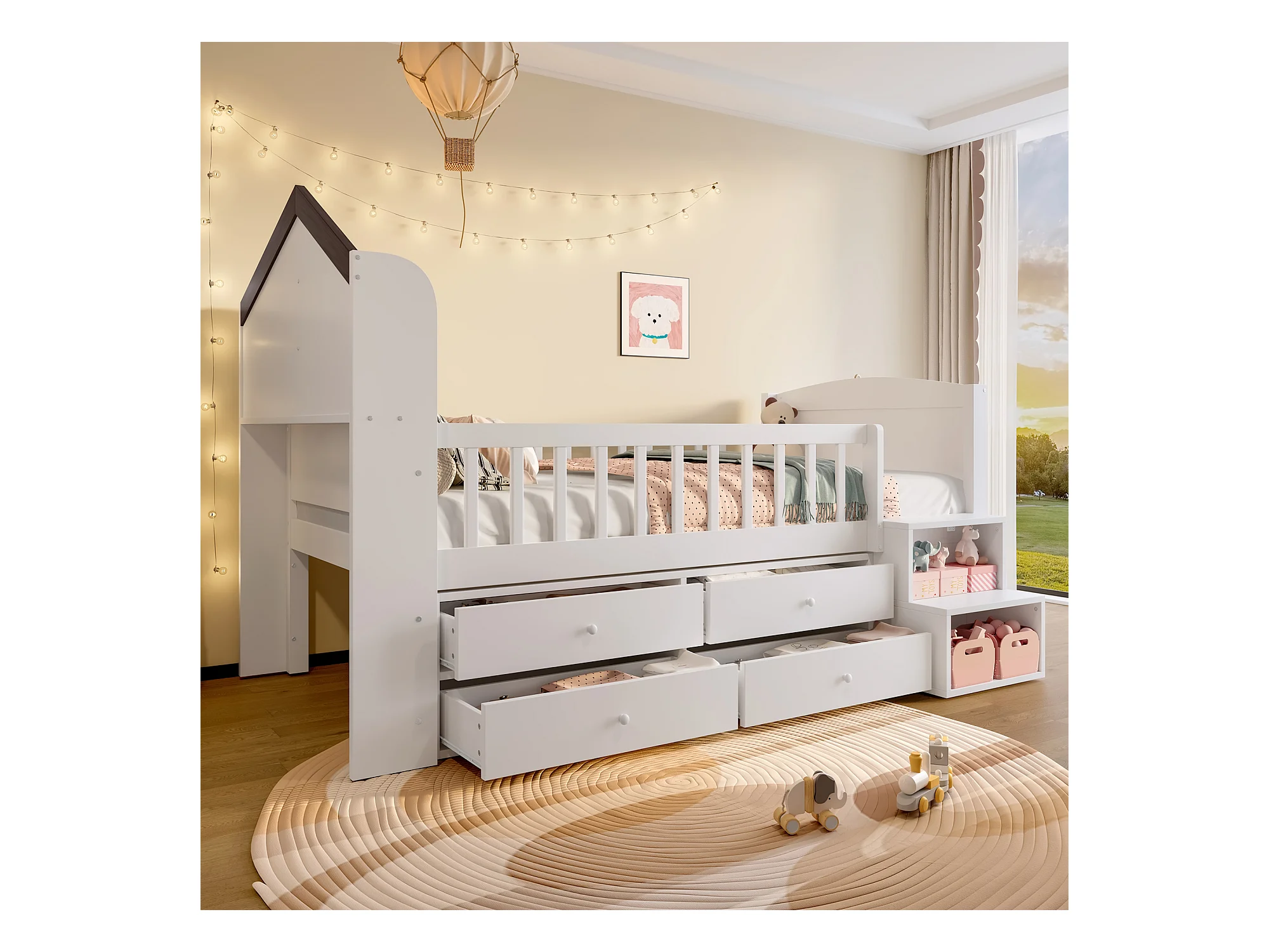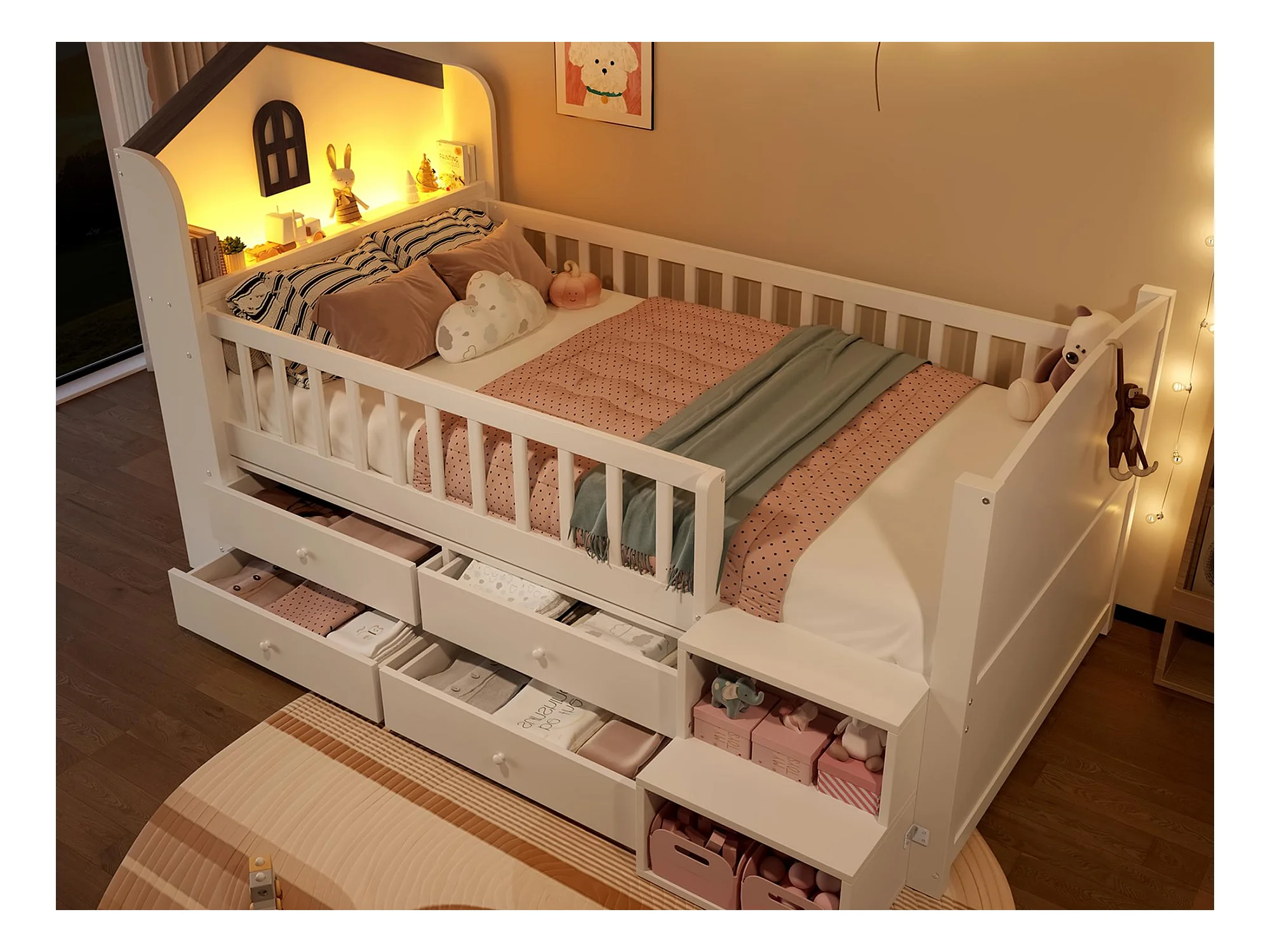 Lit enfant 90x200cm - 4 tiroirs - Bande lumineuse LED - Avec échelle de rangement - Blanc (matelas non inclus)