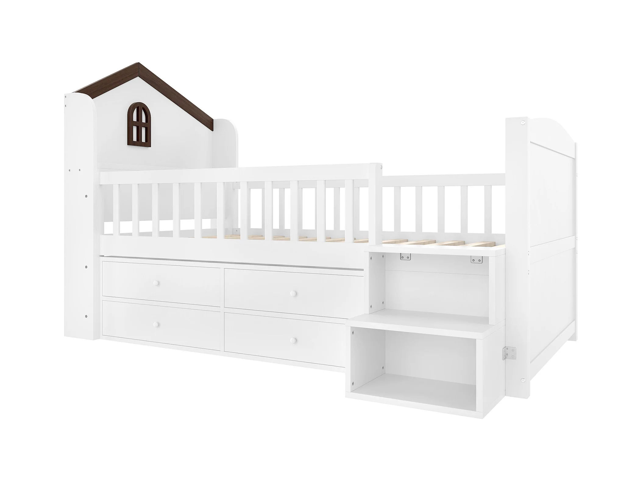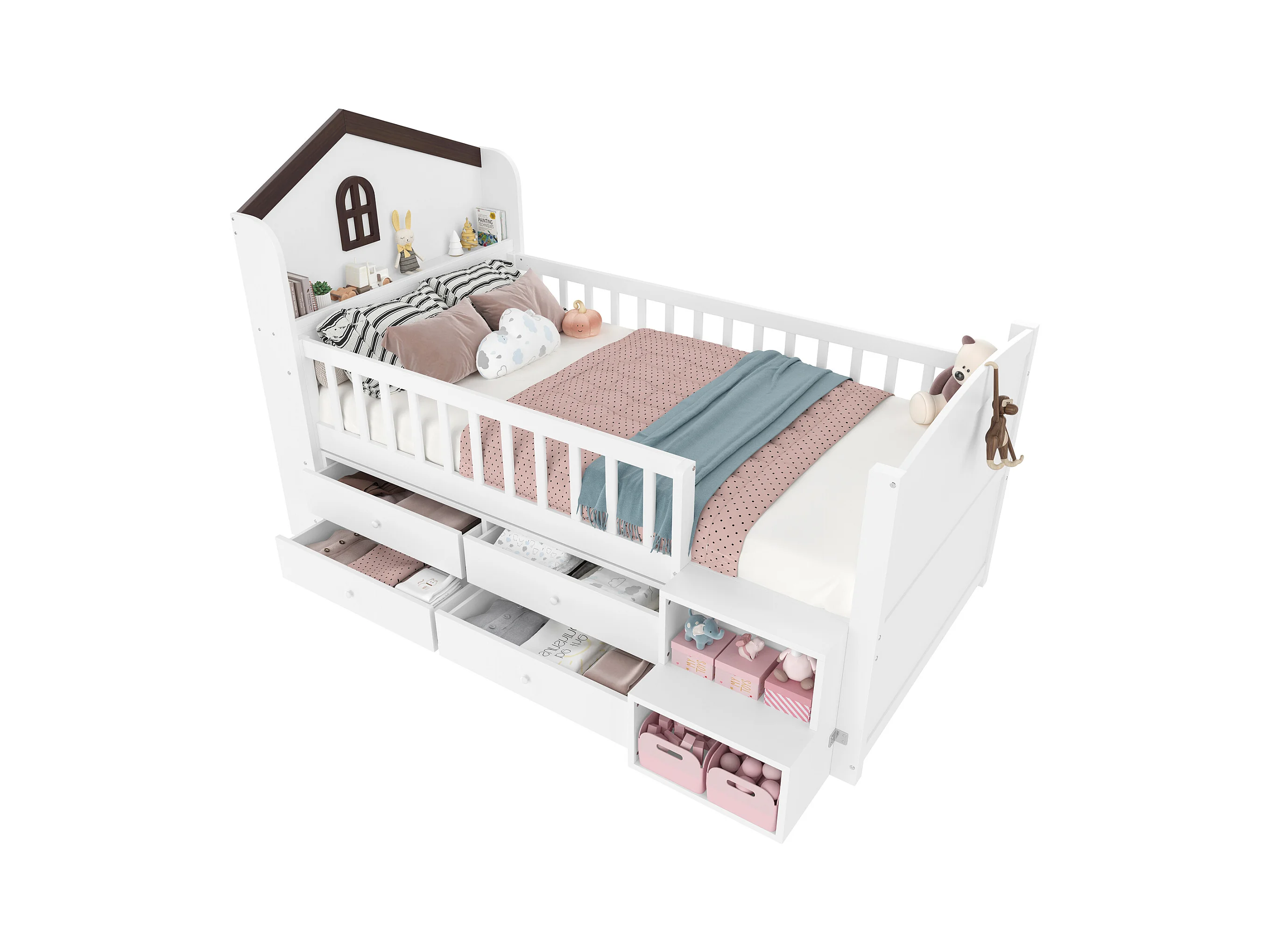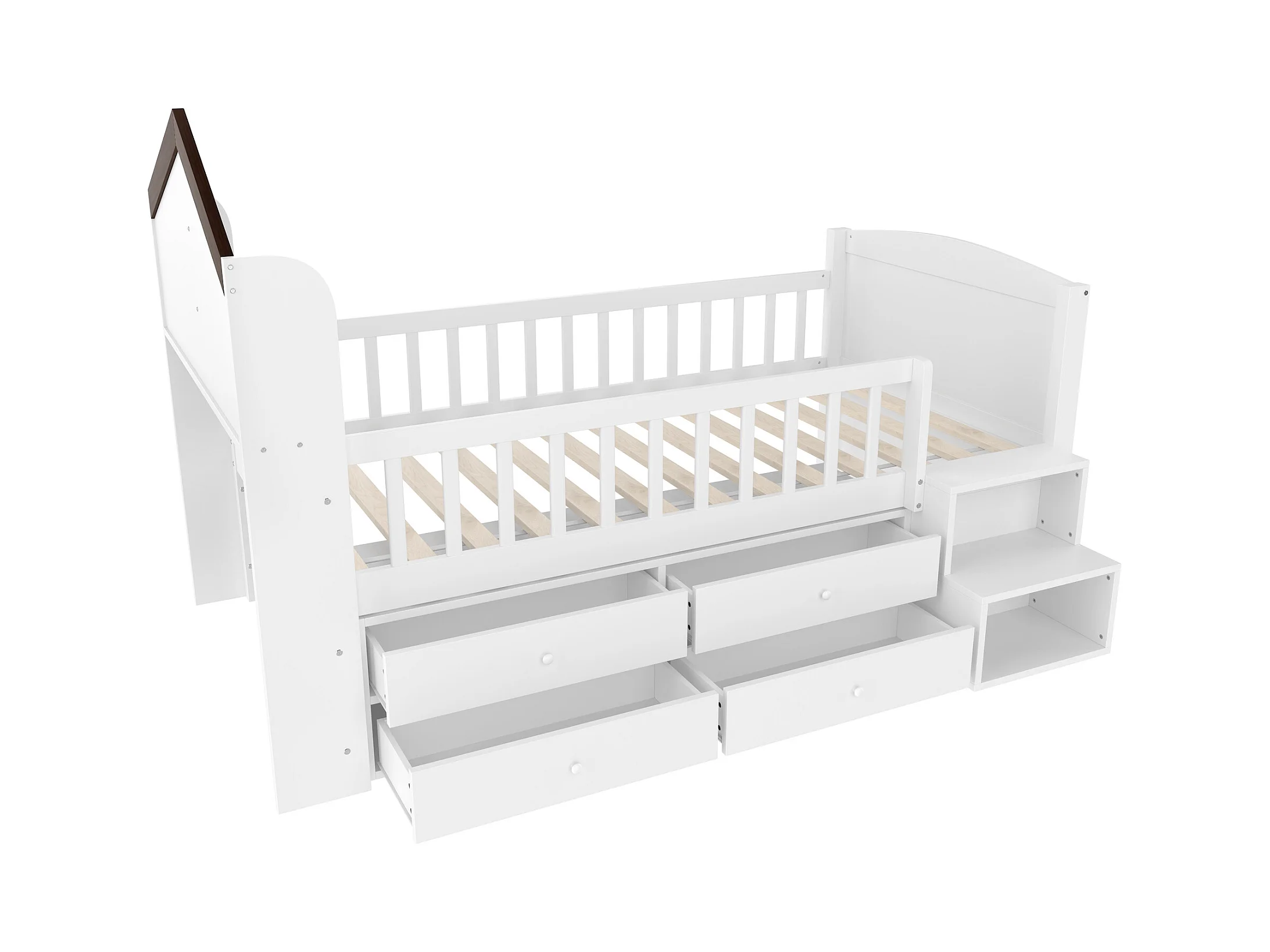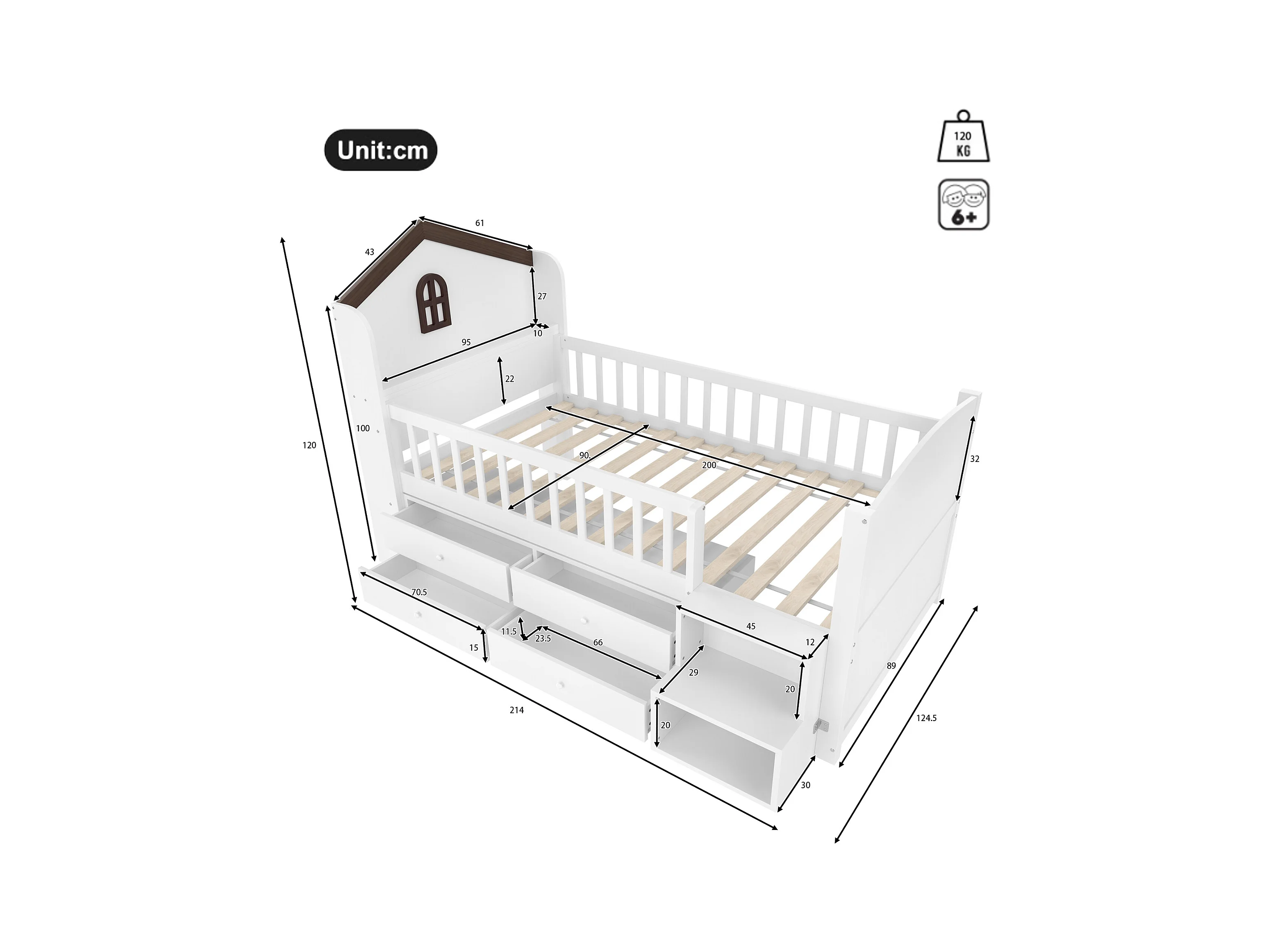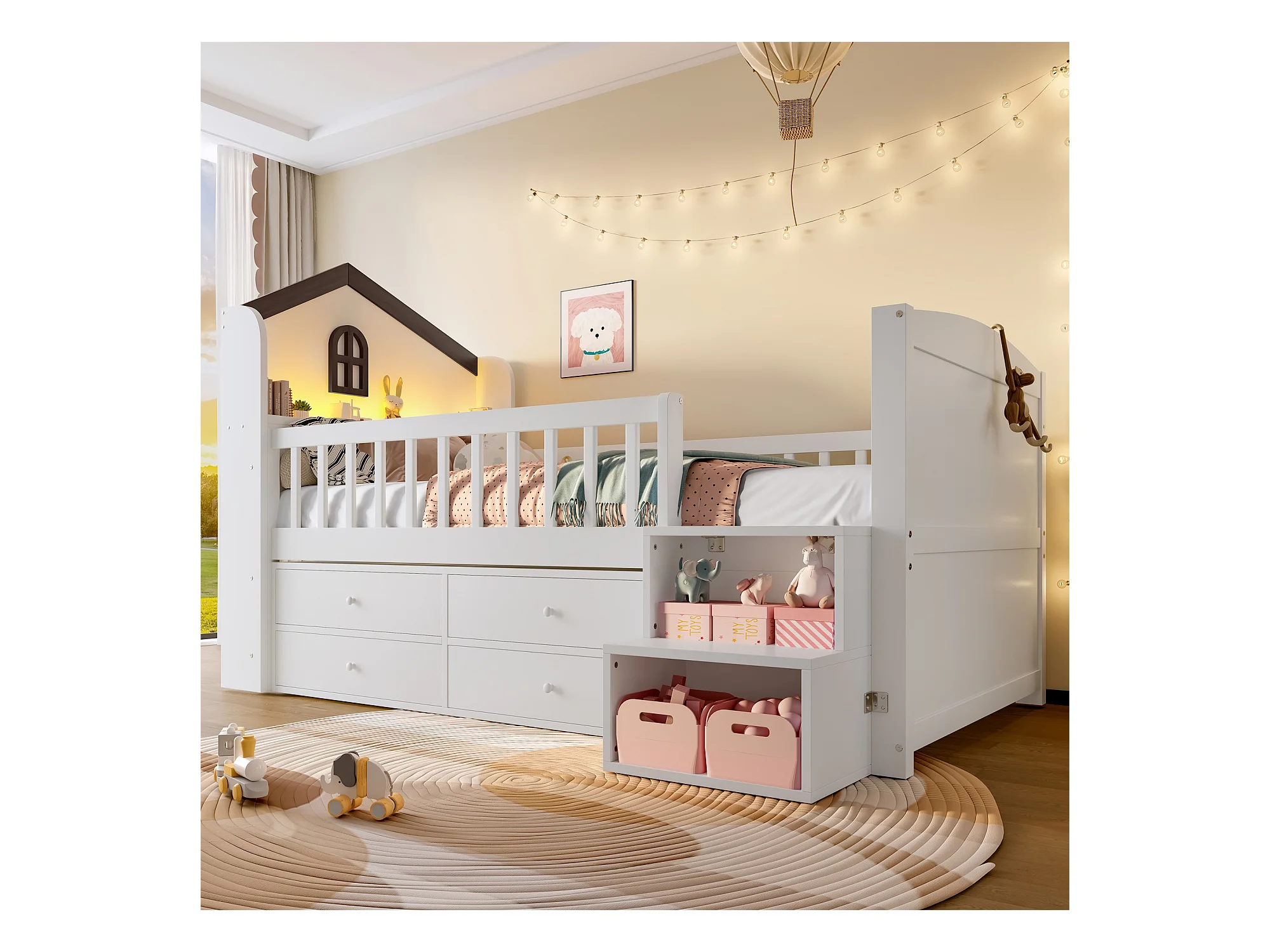 Lit enfant 90x200cm - 4 tiroirs - Bande lumineuse LED - Avec échelle de rangement - Blanc (matelas non inclus)
