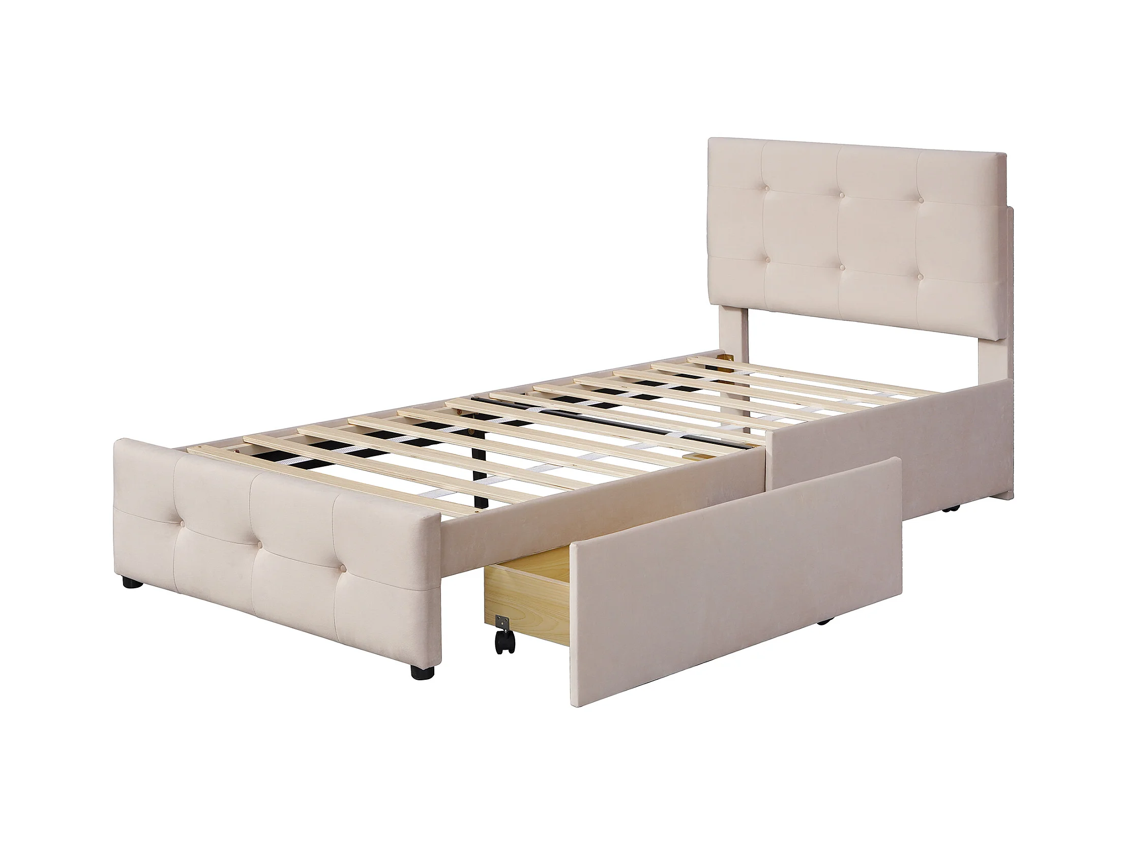 Lit enfant 90x200cm avec 2 tiroirs et tête de lit réglable en hauteur,tissu en velours beige, sans matelas