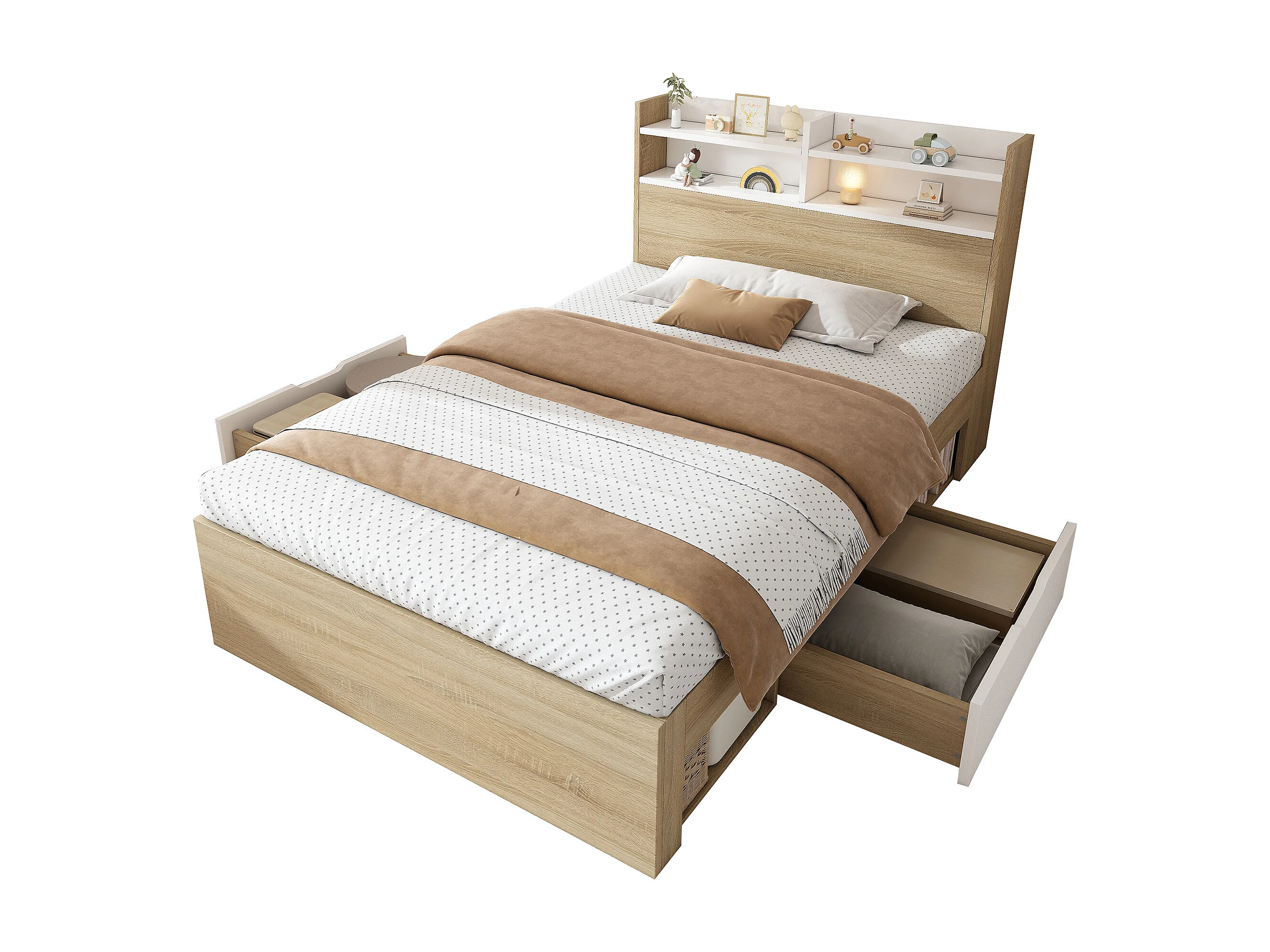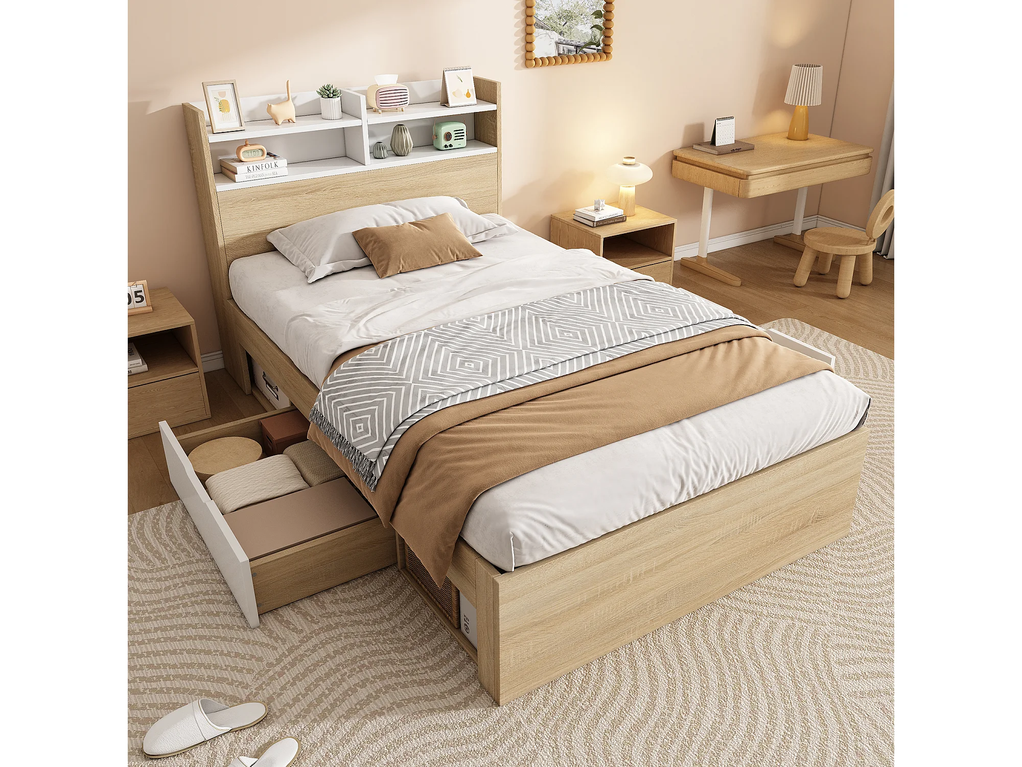 Lit simple 90x200 avec tête de lit avec rangements, avec tiroirs et niches, en bois, blanc et chêne (Sans matelas)