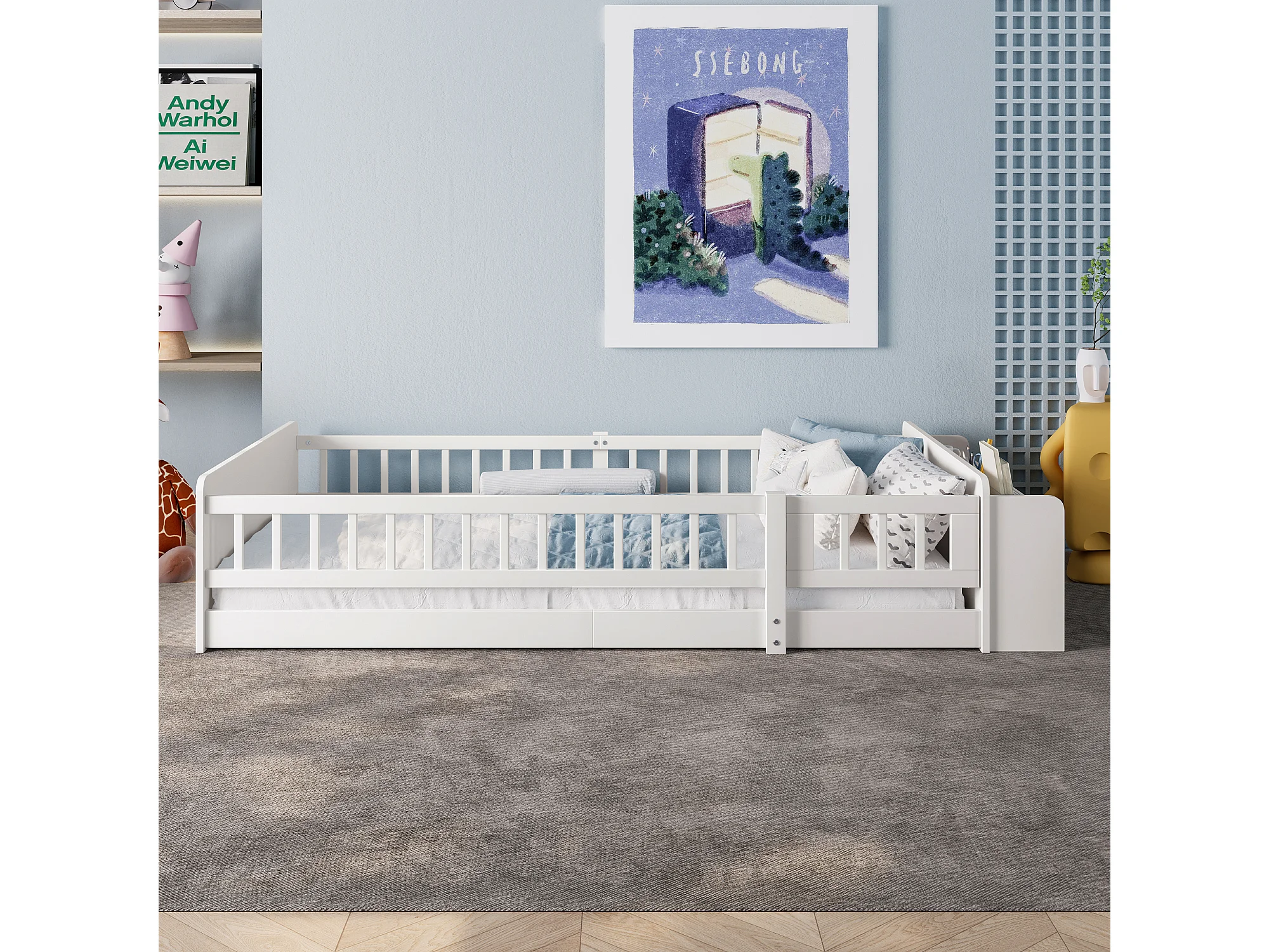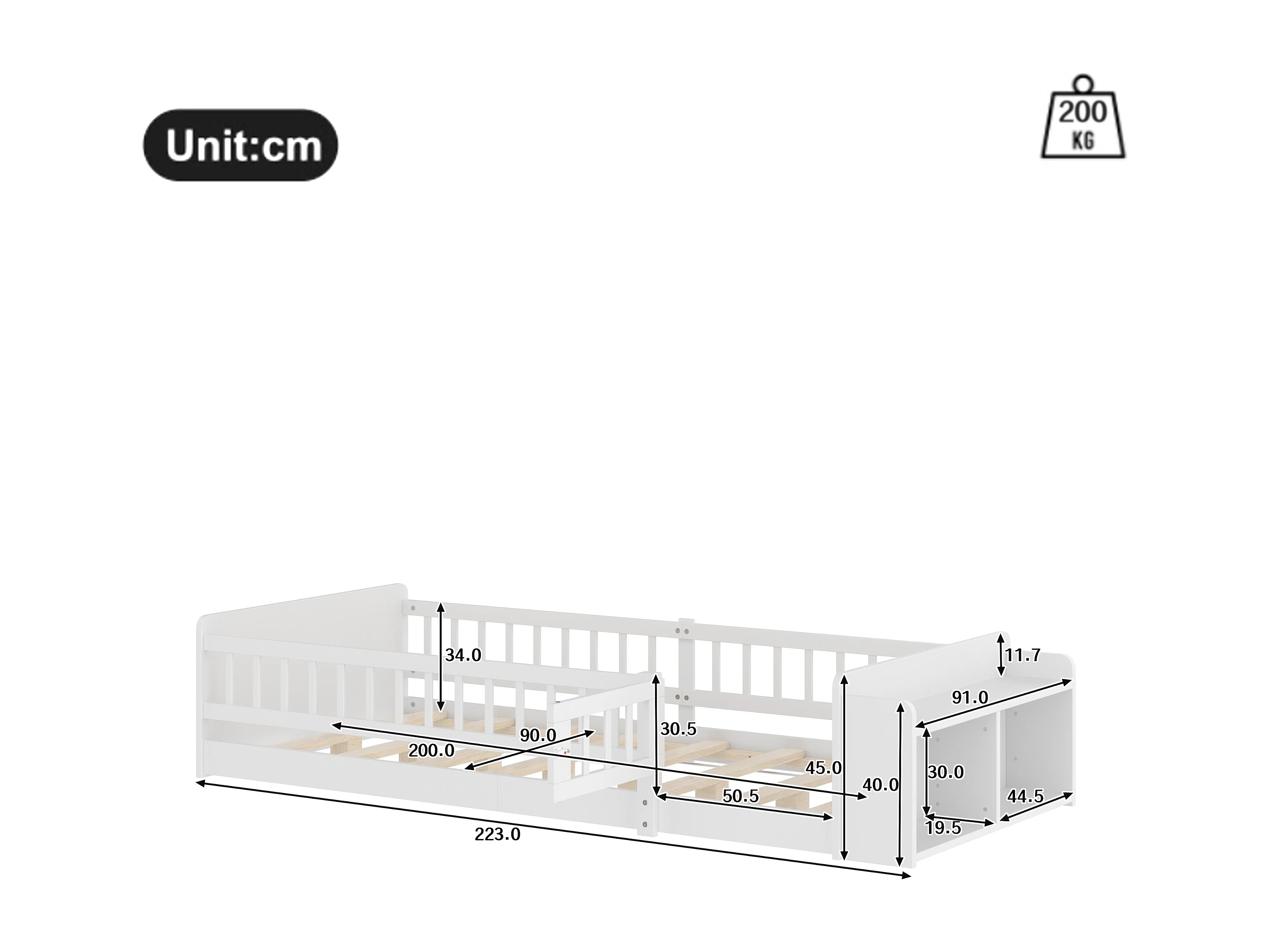 Lit enfant 90x200cm en Pin Naturel, blanc, Sécurité et étagères Intégré, sans matelas