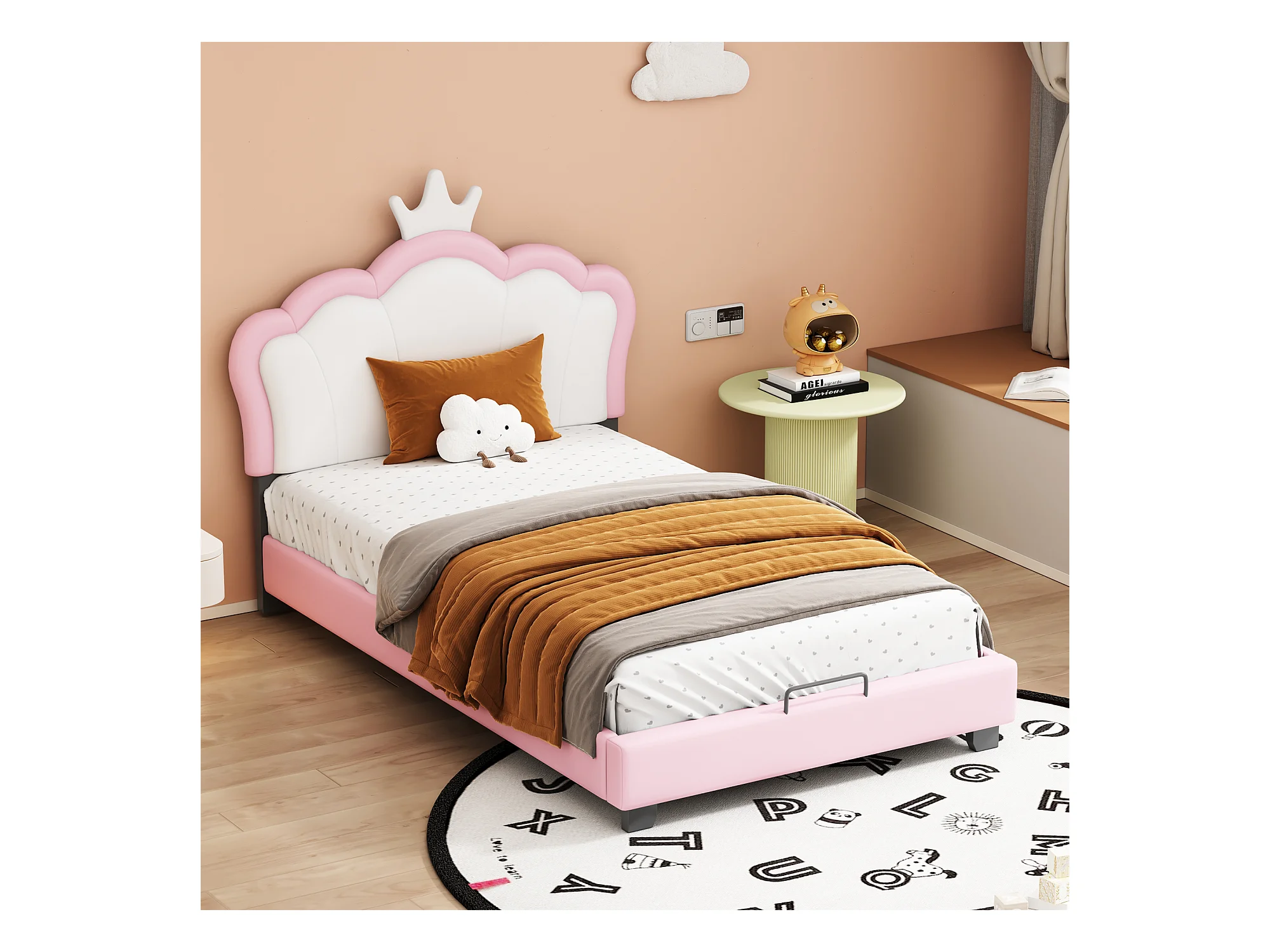 Lit enfant 90x200cm, tête de lit couronne, sommier à lattes, revêtement simili cuir rose (208x92x112cm)