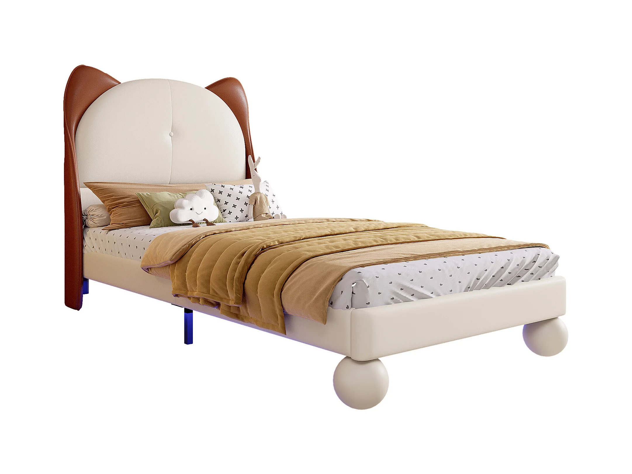 Lit enfant 90x20cm avec éclairage LED, tête de lit oreilles de chat, beige + jaune marron, PU