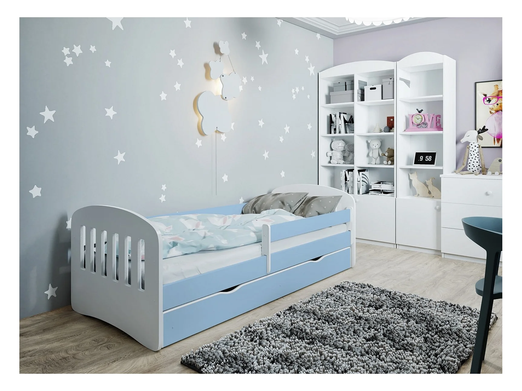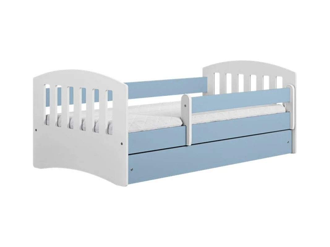 Lit enfant avec barrière de sécurité amovible bleu Klaky-Matelas mousse-80x160-Tiroirs Avec tiroir