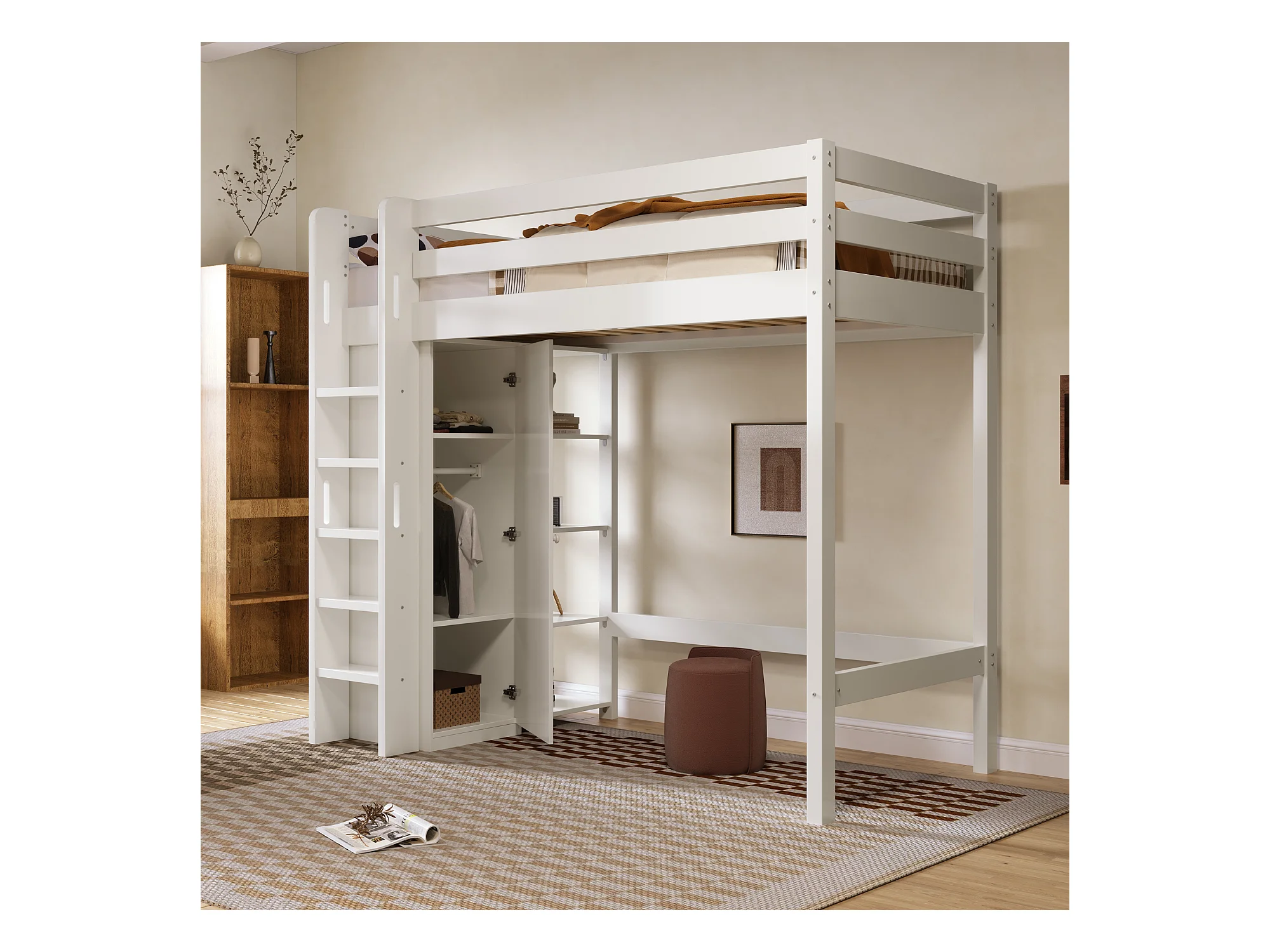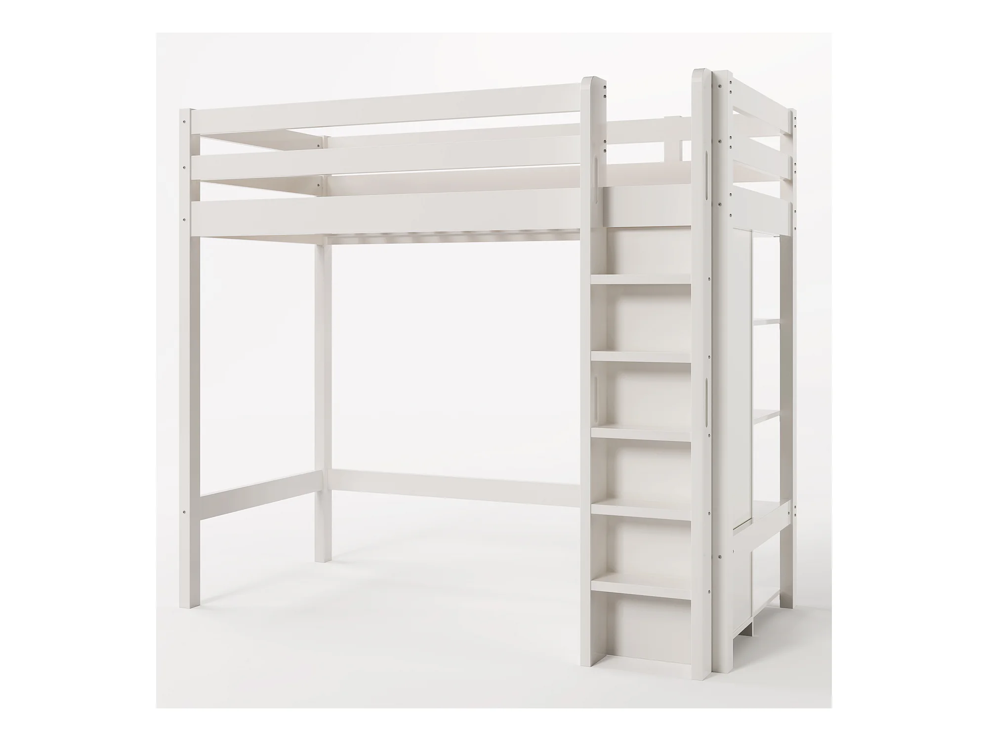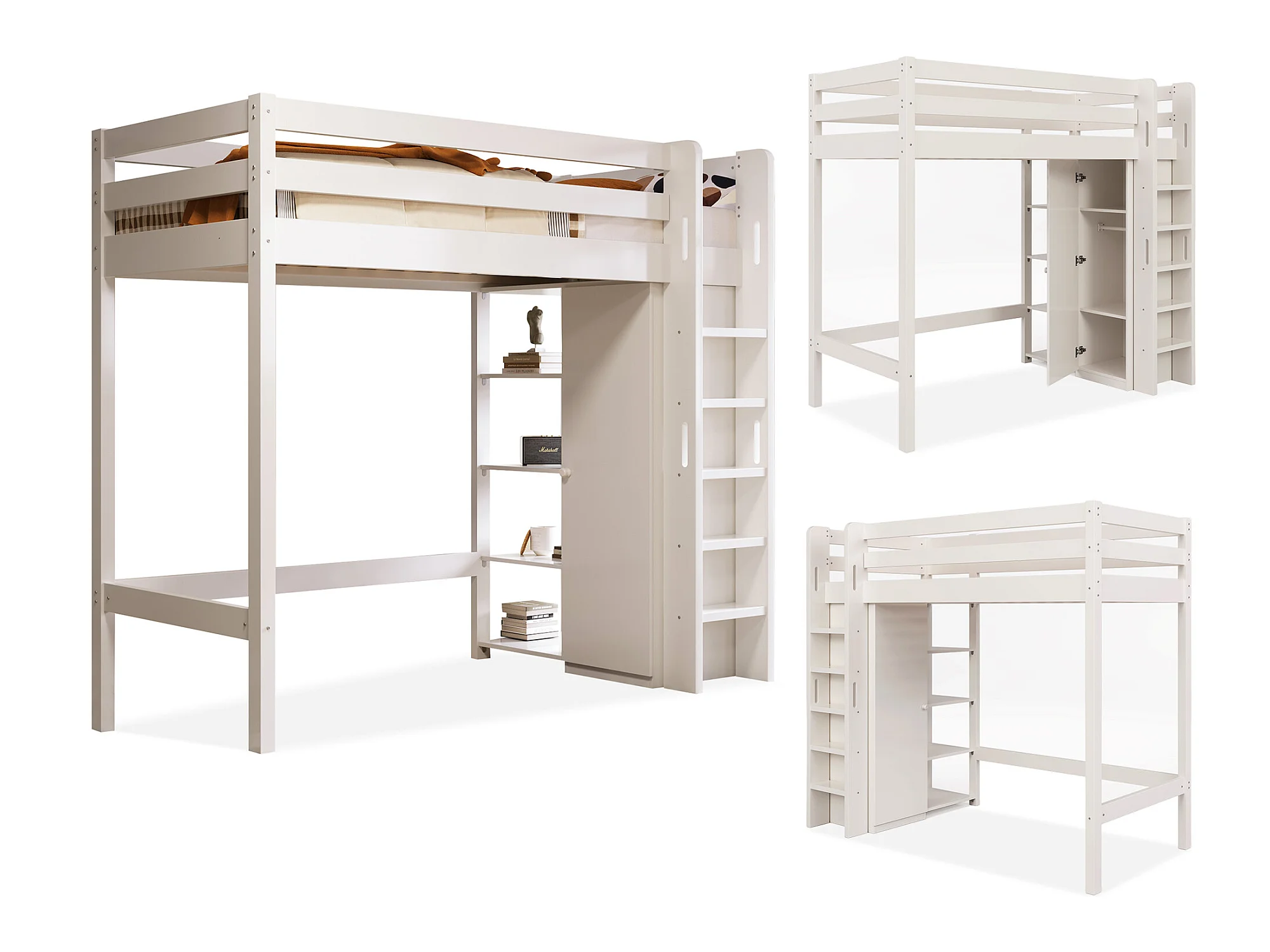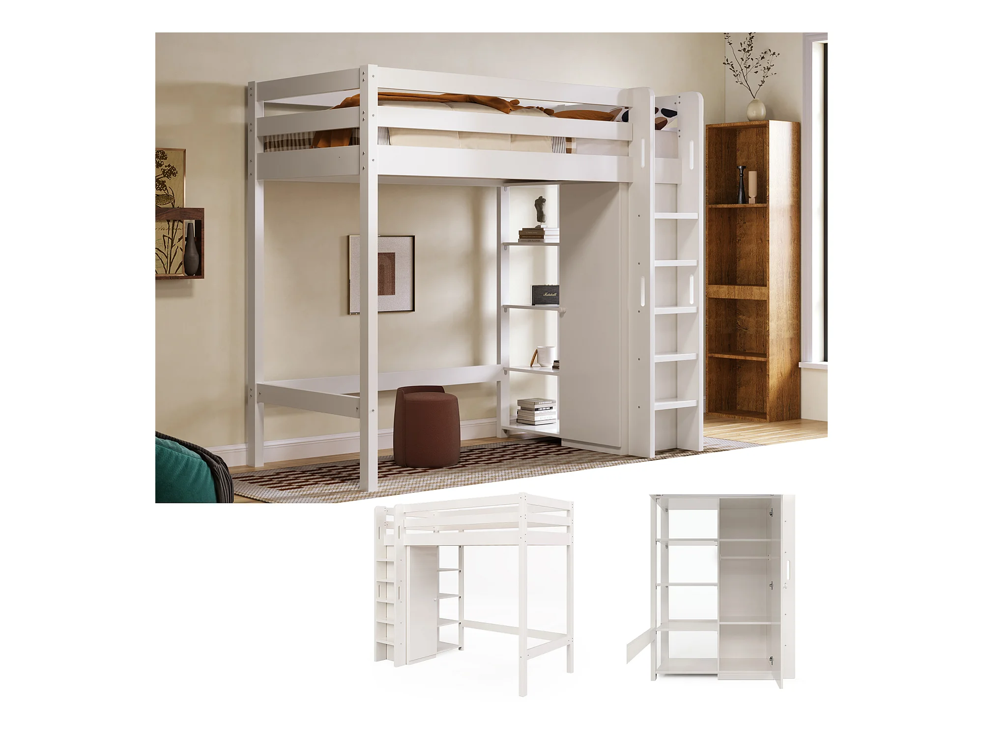 Lit enfant avec mezzanine, armoire et 6 étagères, lit simple 90x200 cm - 208x110x186 (lxlxh), blanc
