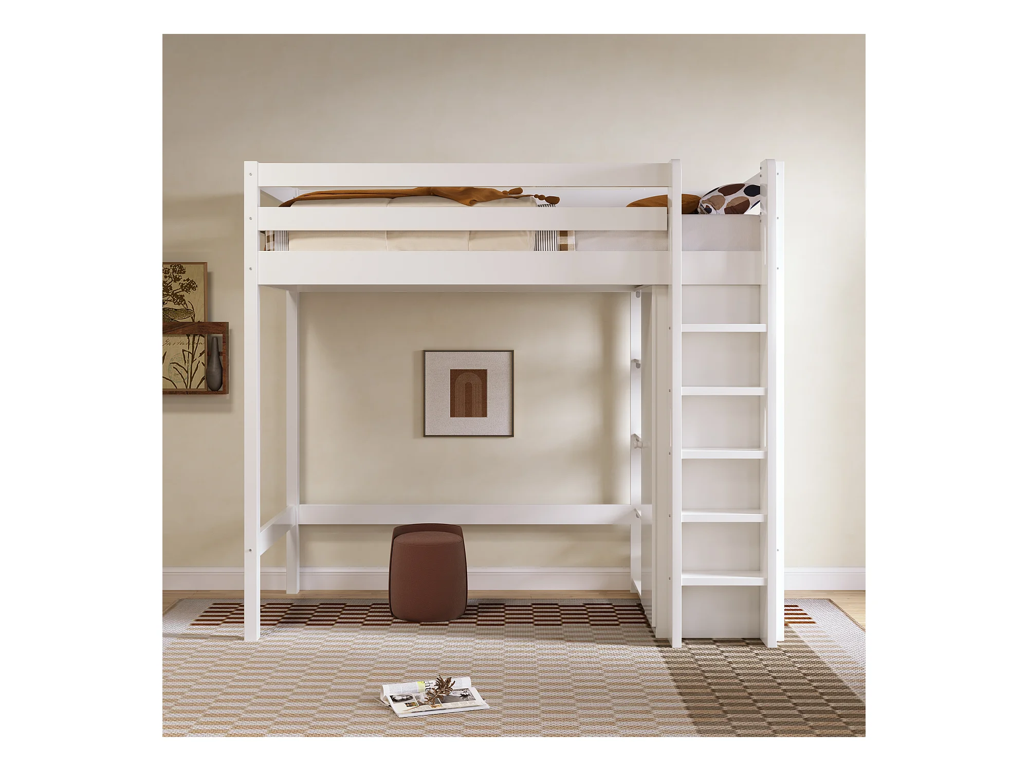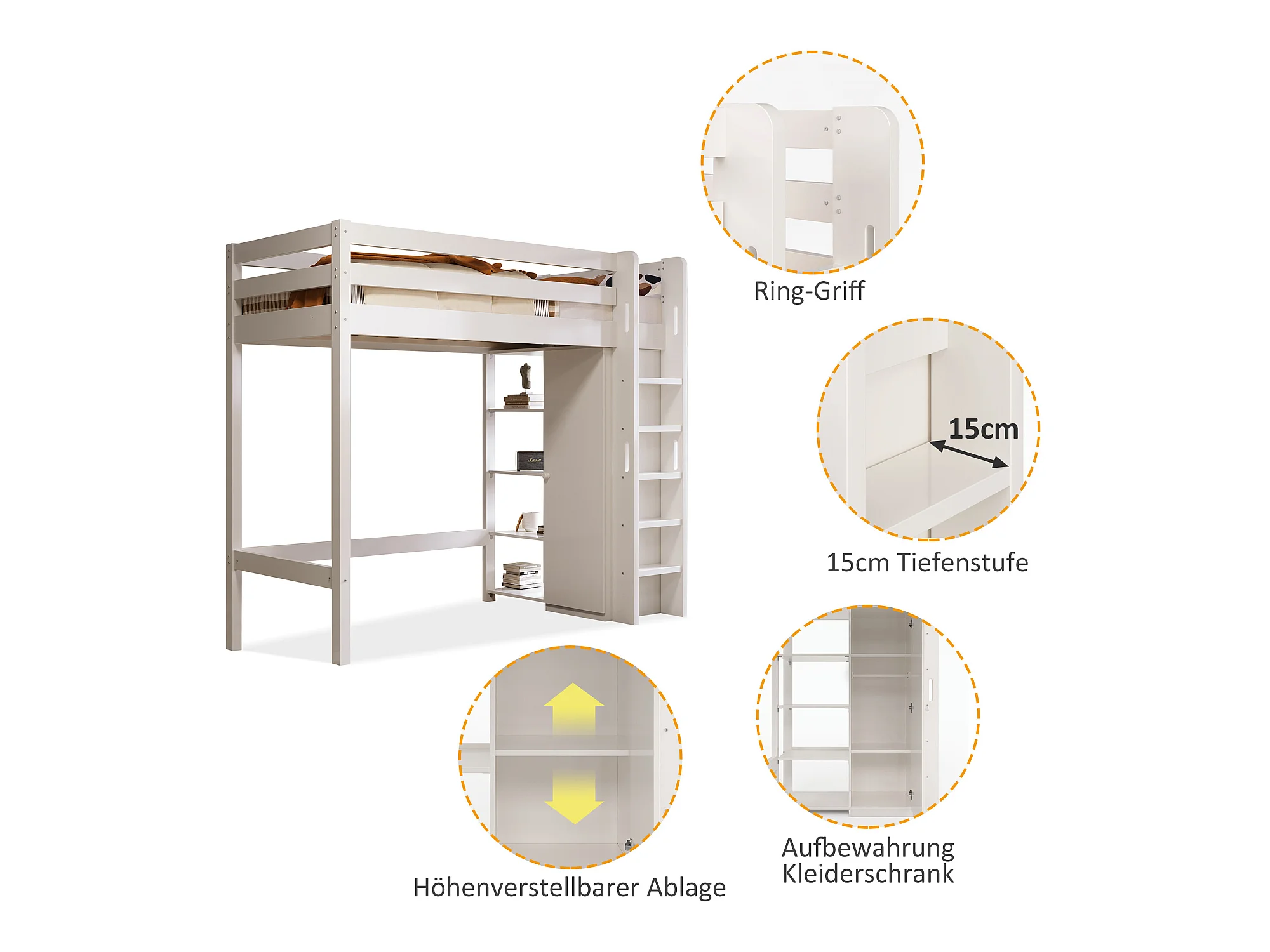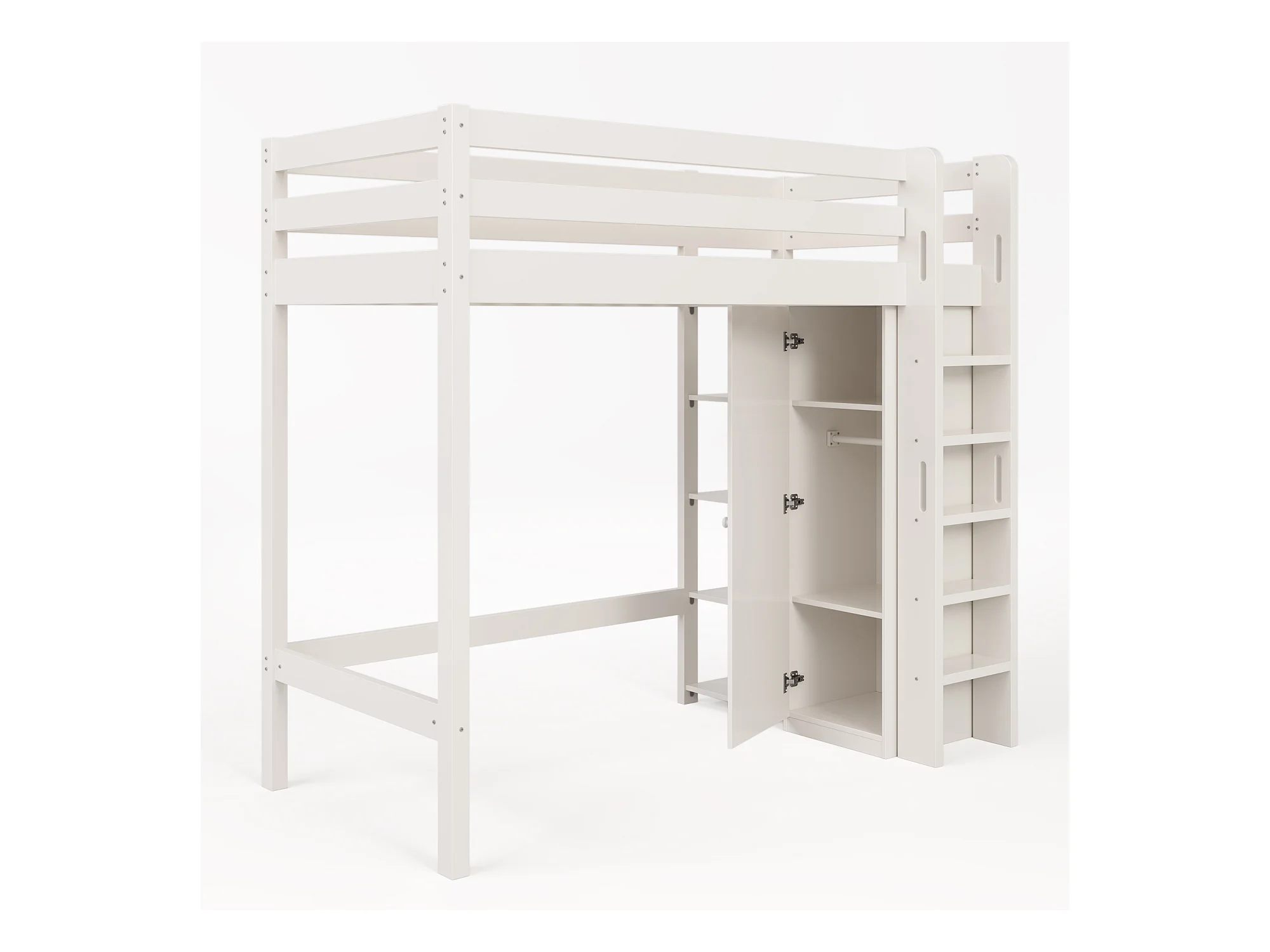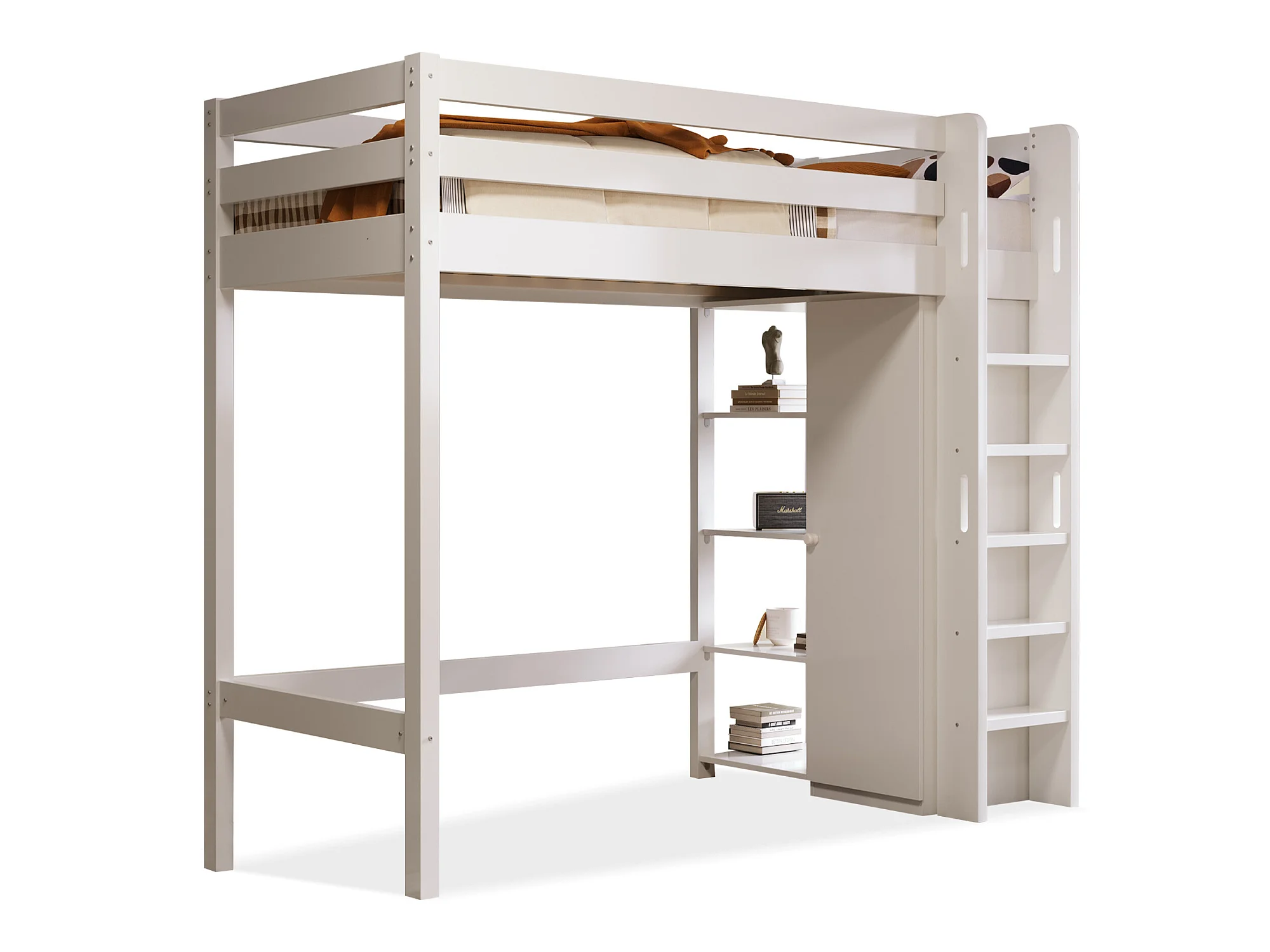Lit enfant avec mezzanine, armoire et 6 étagères, lit simple 90x200 cm - 208x110x186 (lxlxh), blanc