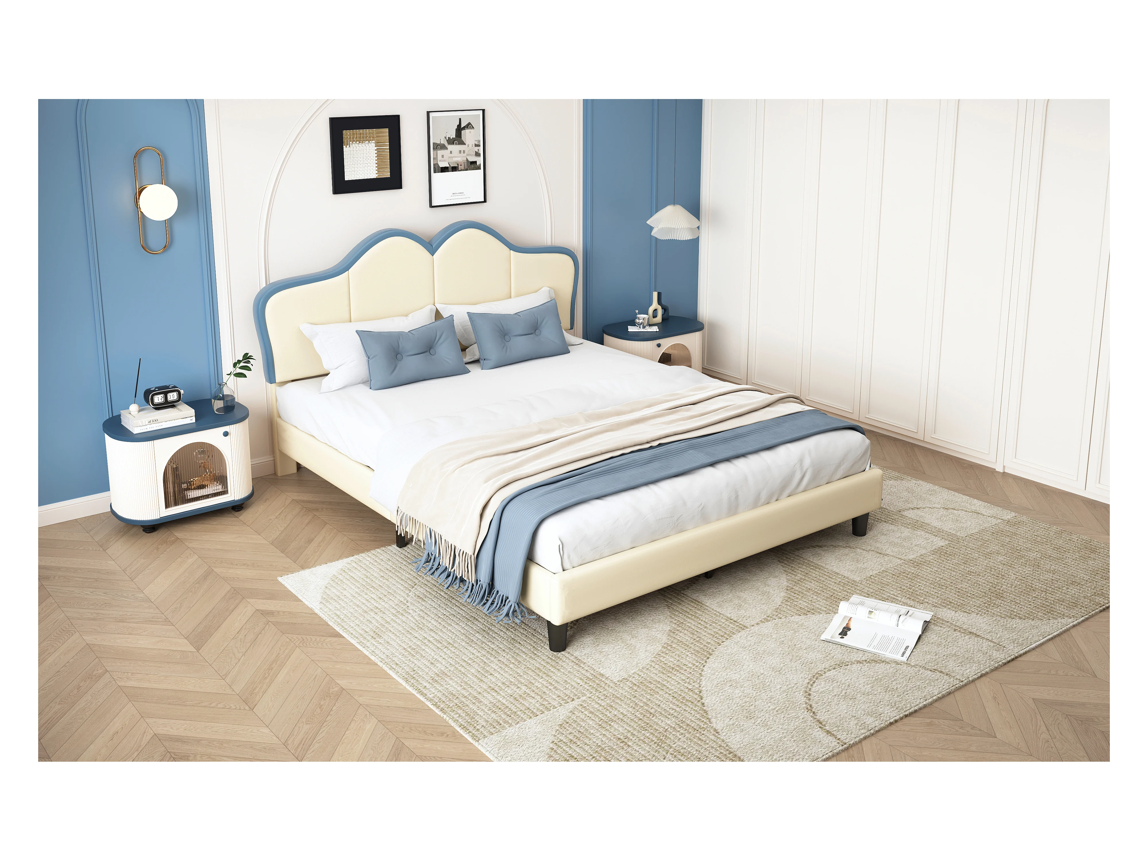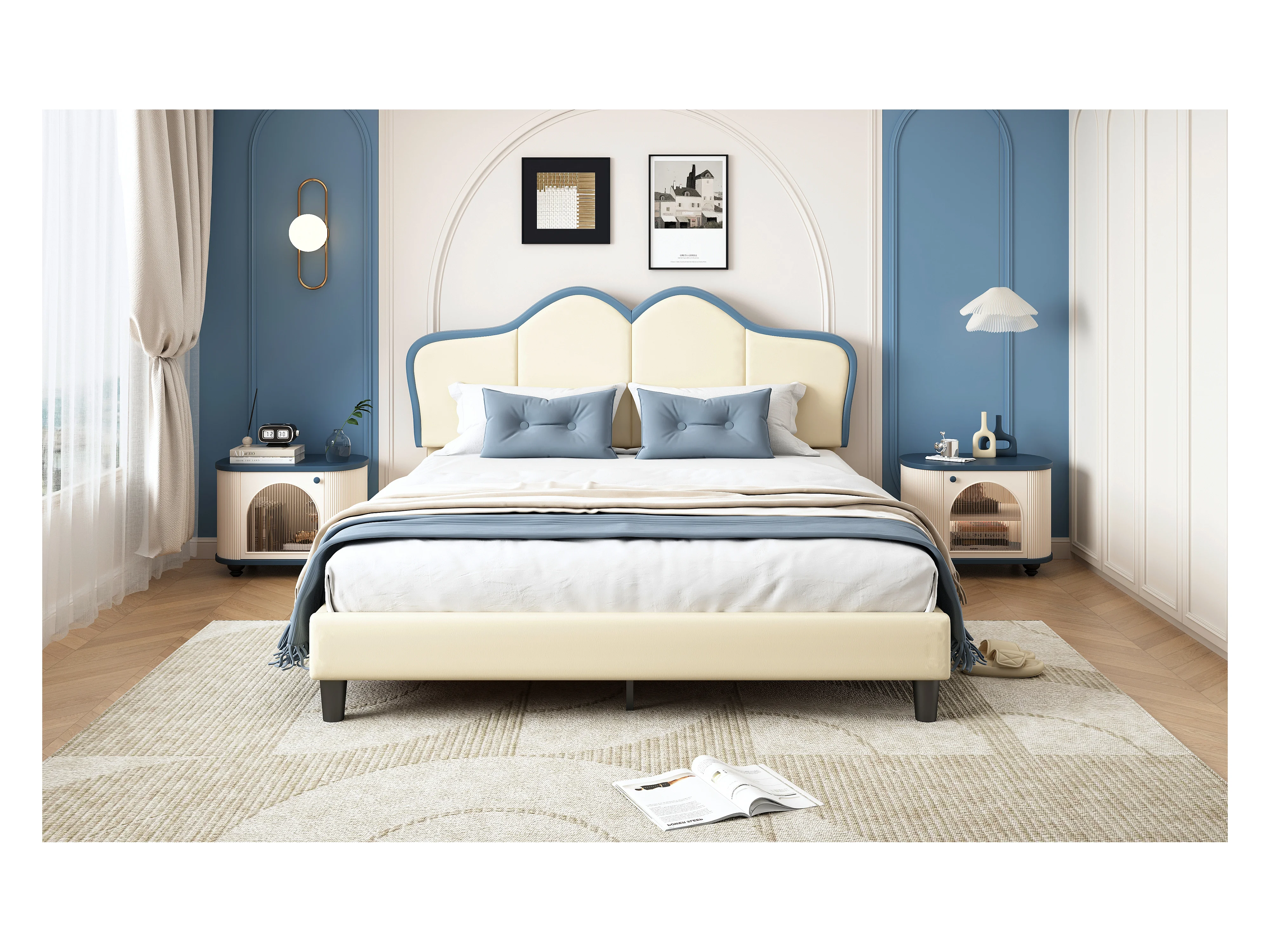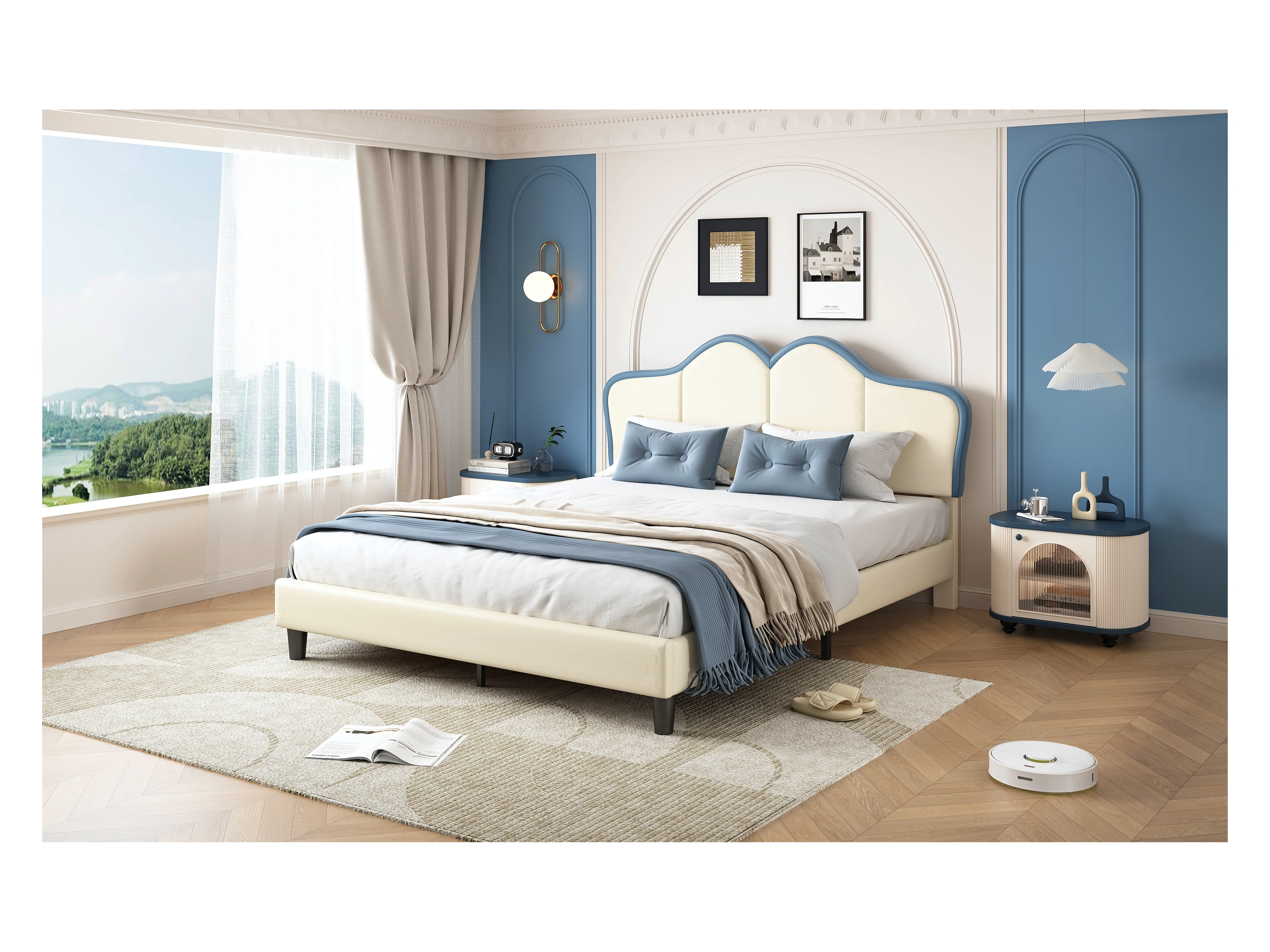 Lit enfant avec protection, tête de lit élégante, pieds stables, PU et bois, blanc + bleu, 140x200cm