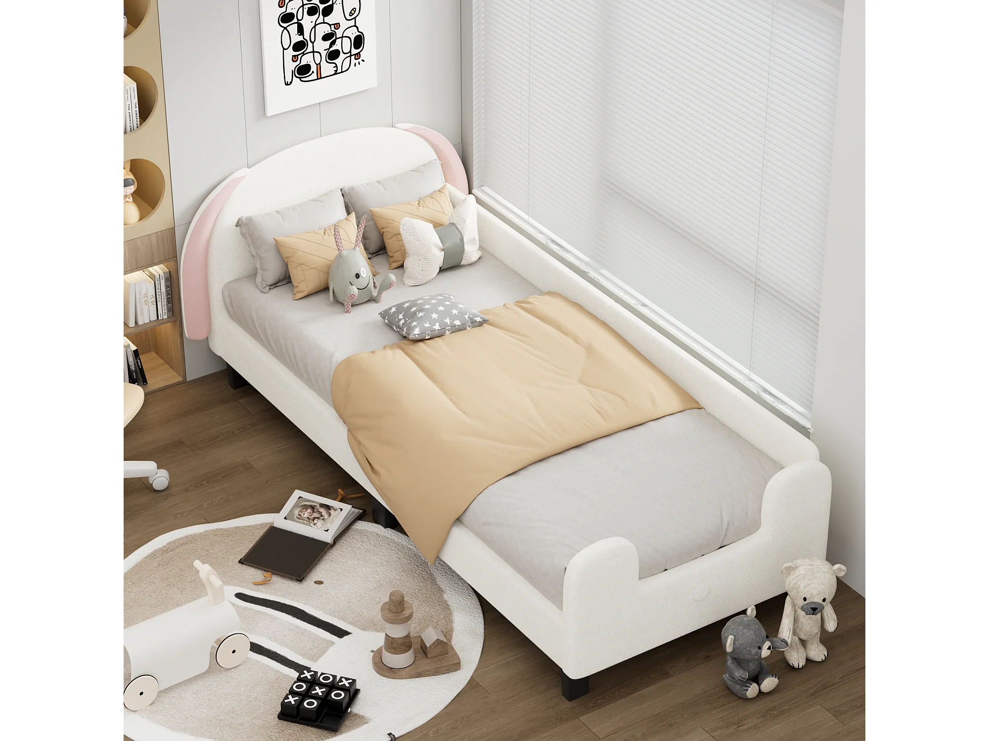 Lit enfant avec tête de lit - 90 x 200 cm - tissu Sherpa - sommier à lattes - blanc + rose
