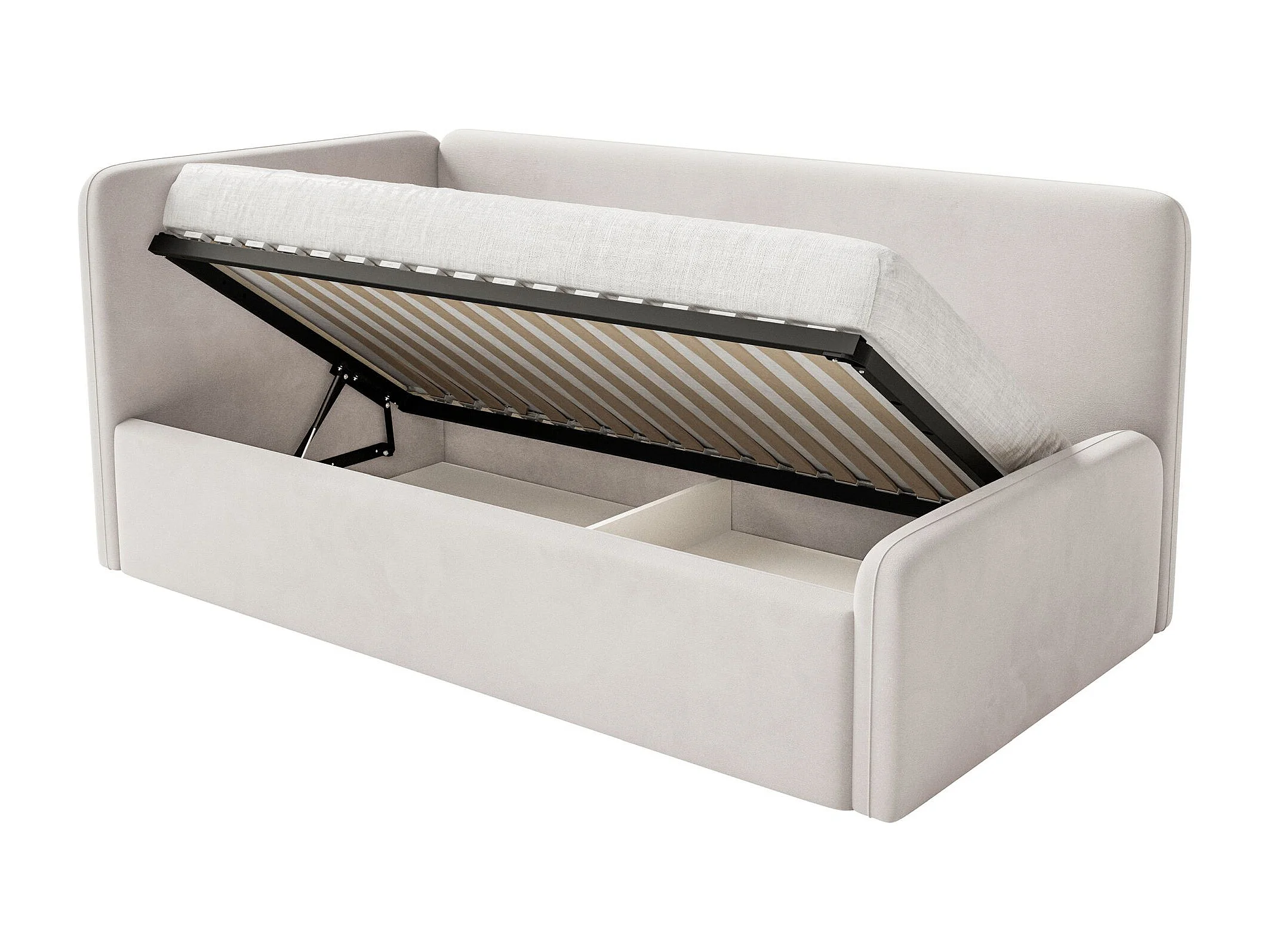 Lit enfant avec tête de lit à gauche – coffre de rangement et barrière de sécurité – beige clair – 90x200 cm – FANKO