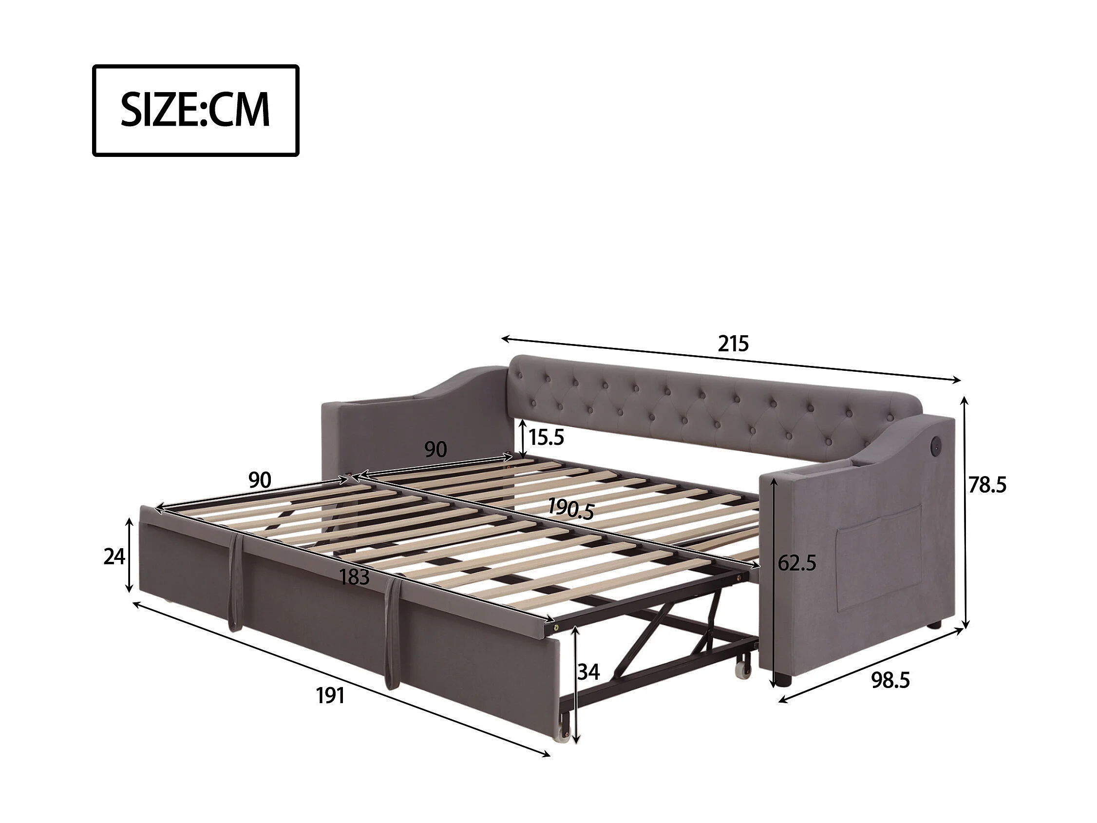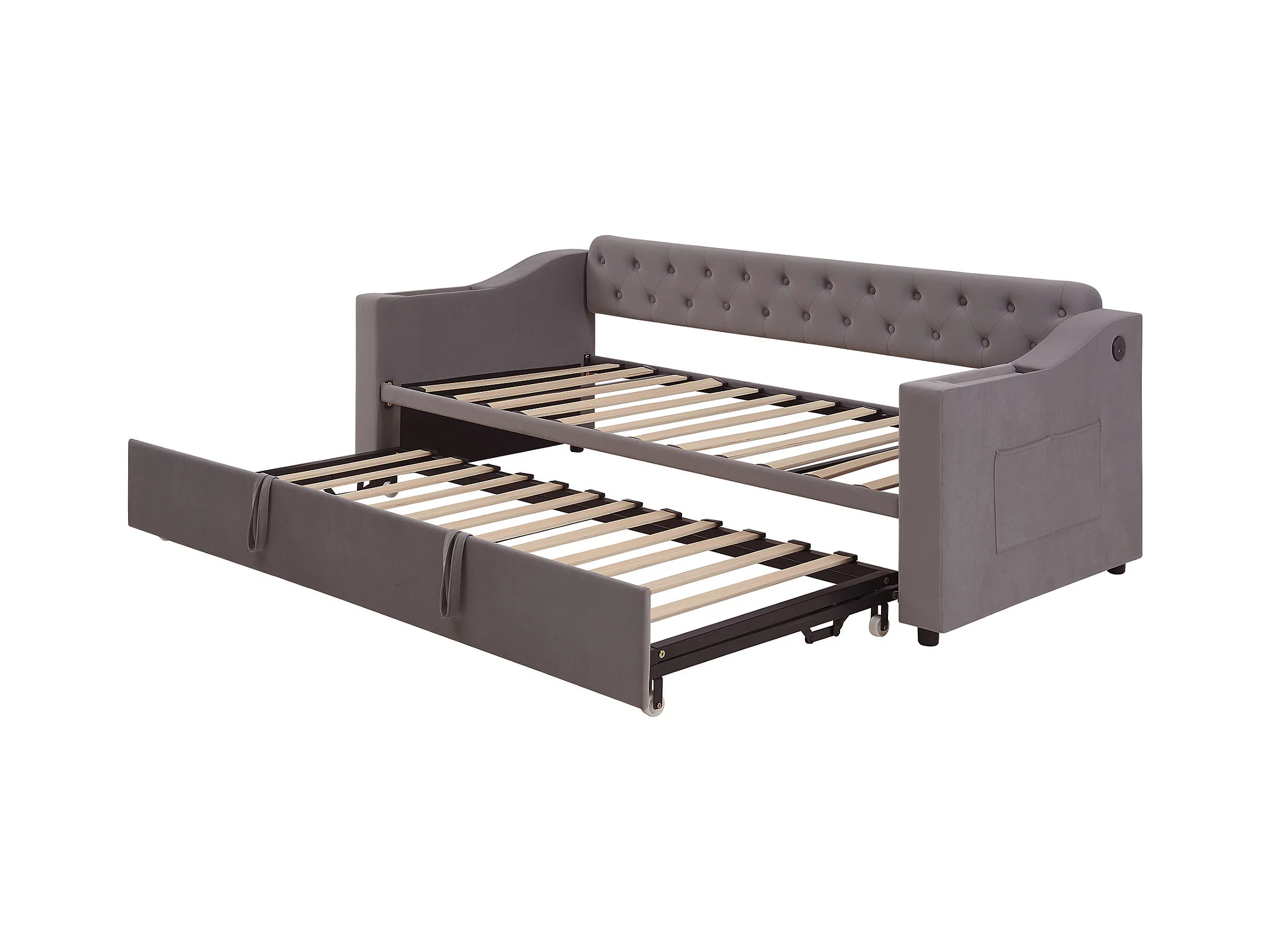 Lit enfant banquette 90/180x190cm gris en velours convertible, avec ports USB et prise secteur, sans matelas
