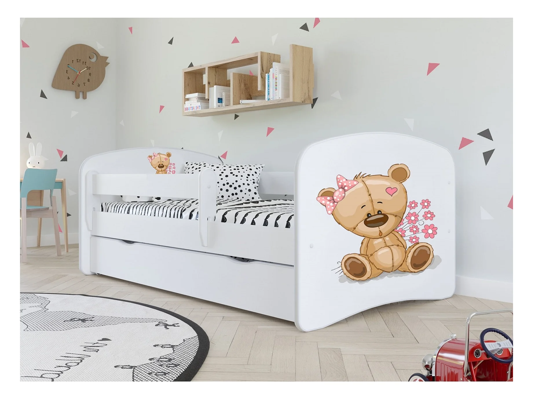 Lit enfant blanc ourson et fleurs avec sommiers et barrière de sécurité amovible Drimy-70x140