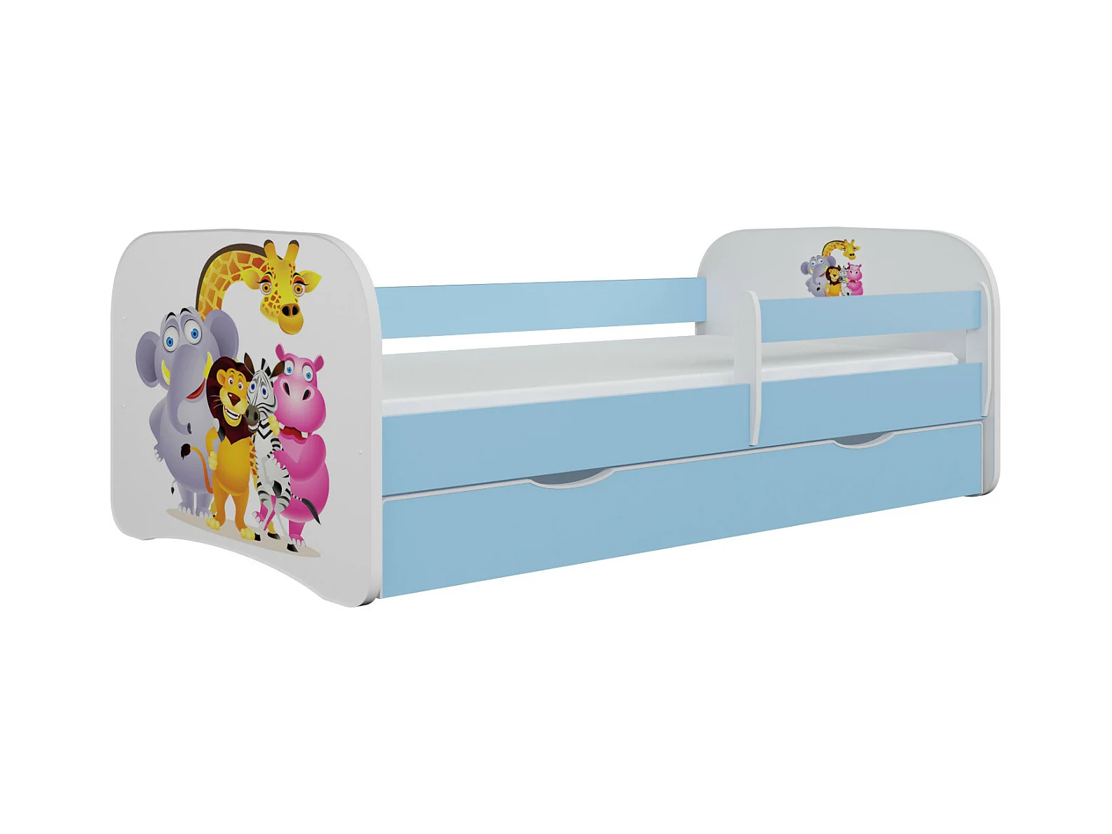 Lit enfant bleu Zoo avec sommiers et barrière de sécurité amovible Drimy-Matelas mousse-80x160-Tiroirs Avec tiroir