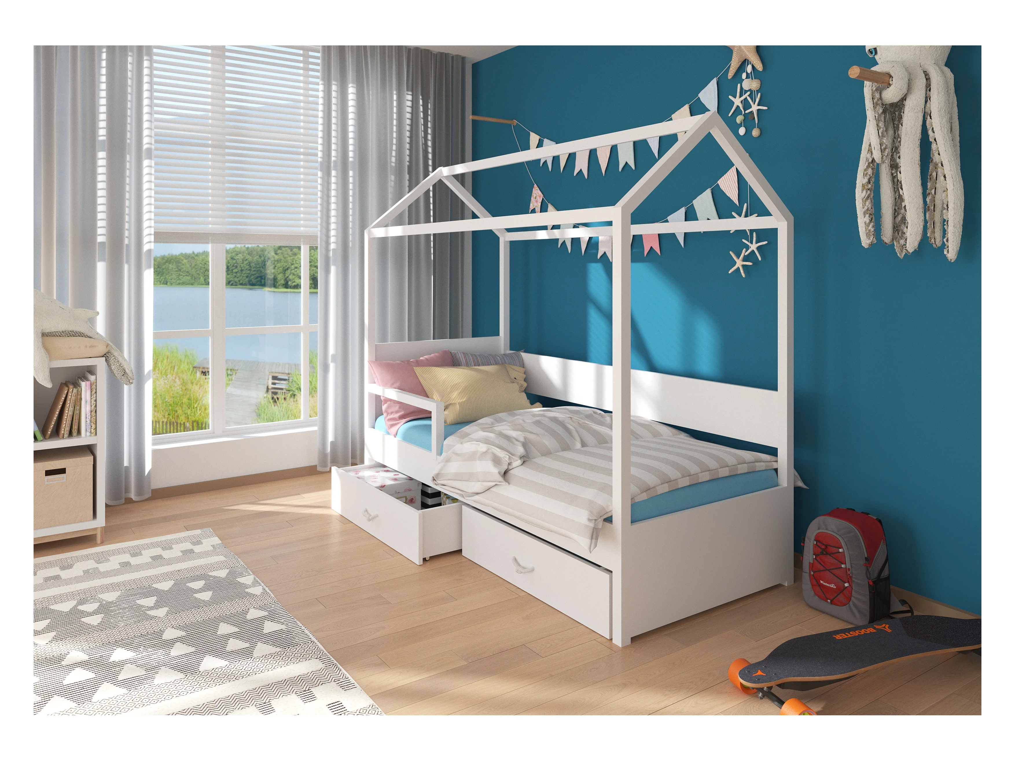 Lit enfant cabane bois pin blanc 90x200 avec barriére et 2 tiroirs de rangement Forka