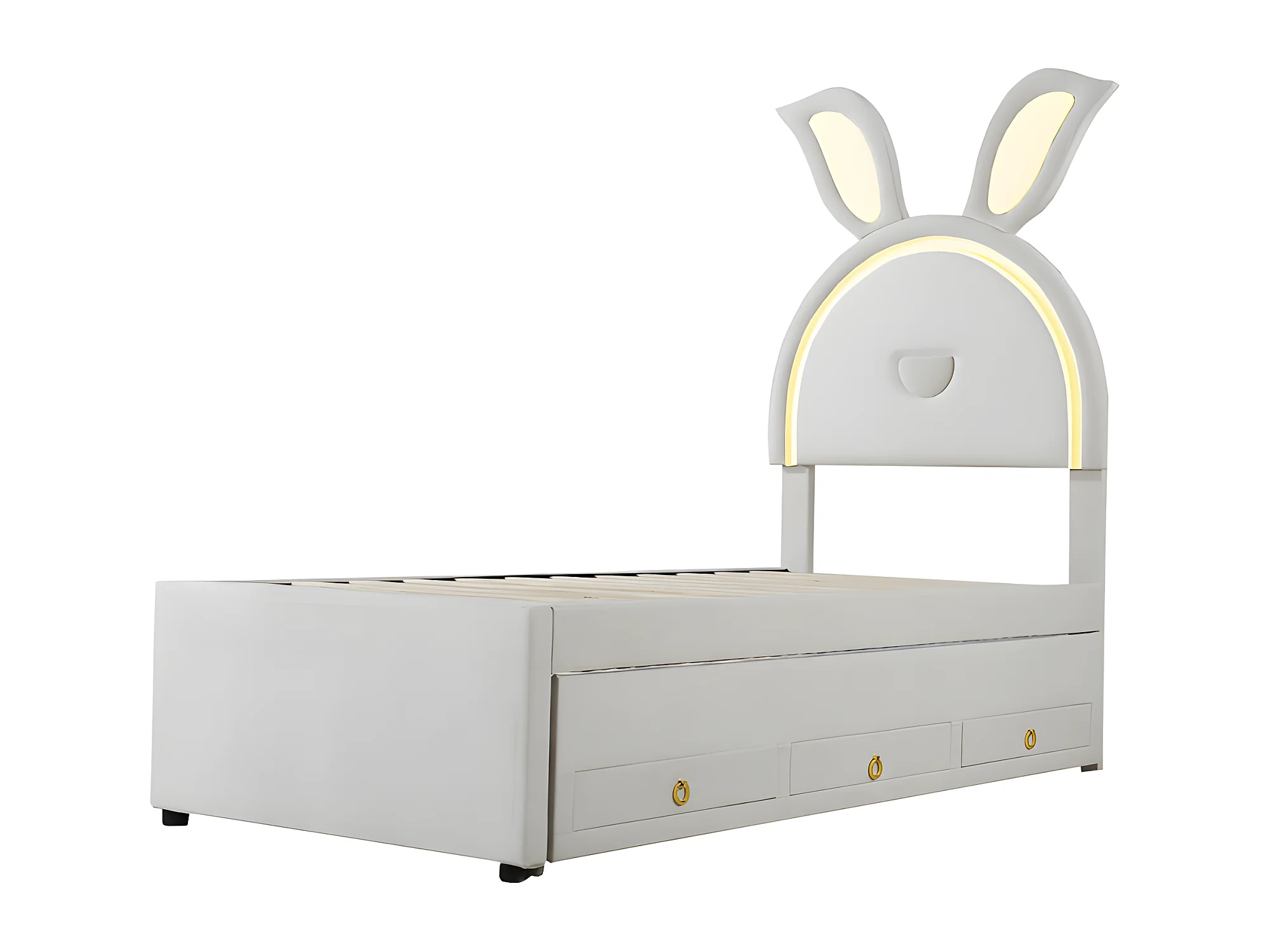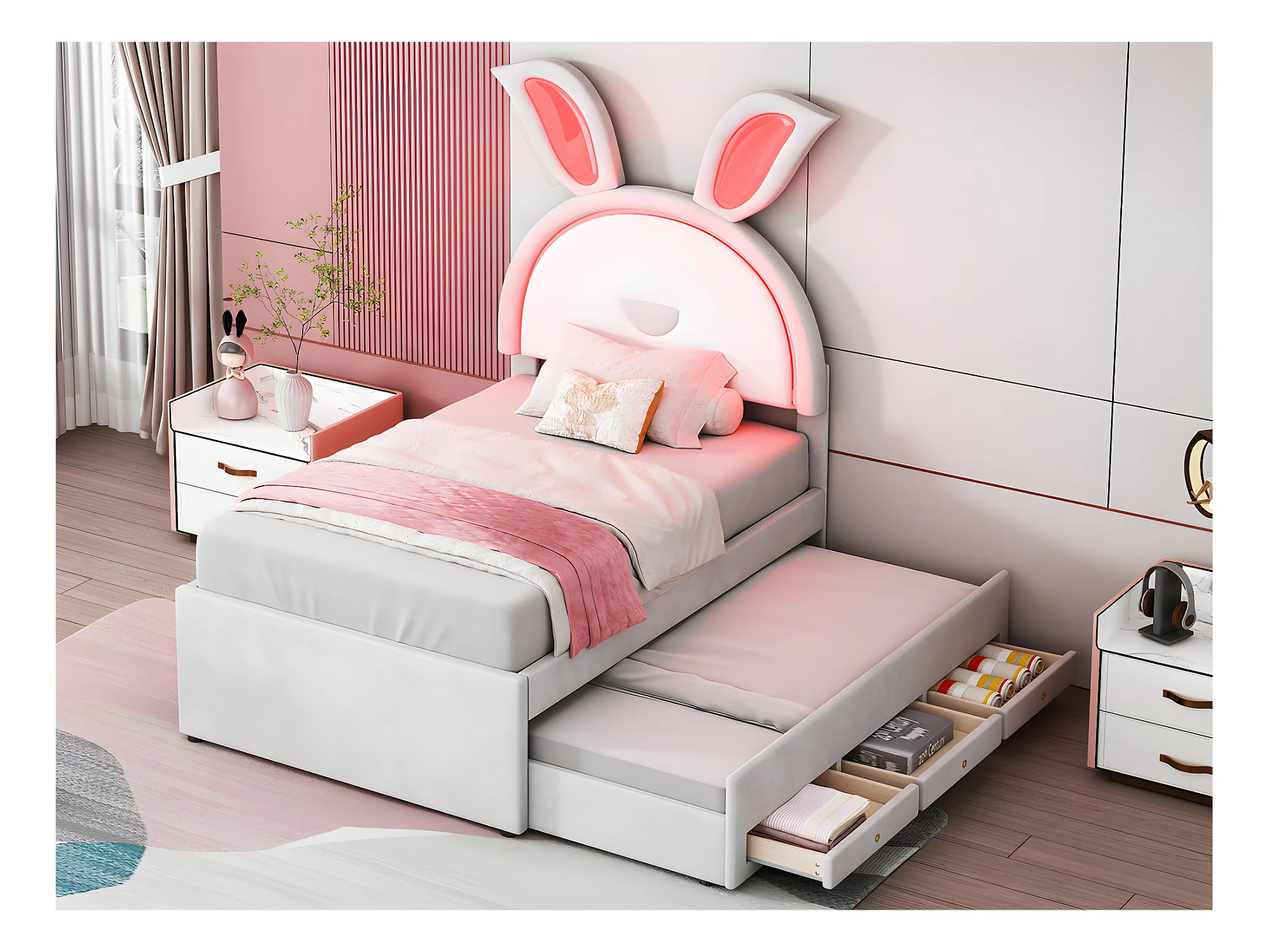 Lit gigogne 90x200+90x190cm, lit enfant capitonné en tissu velours, avec tiroir de rangement, tête de lit LED avec oreilles de lapin, beige