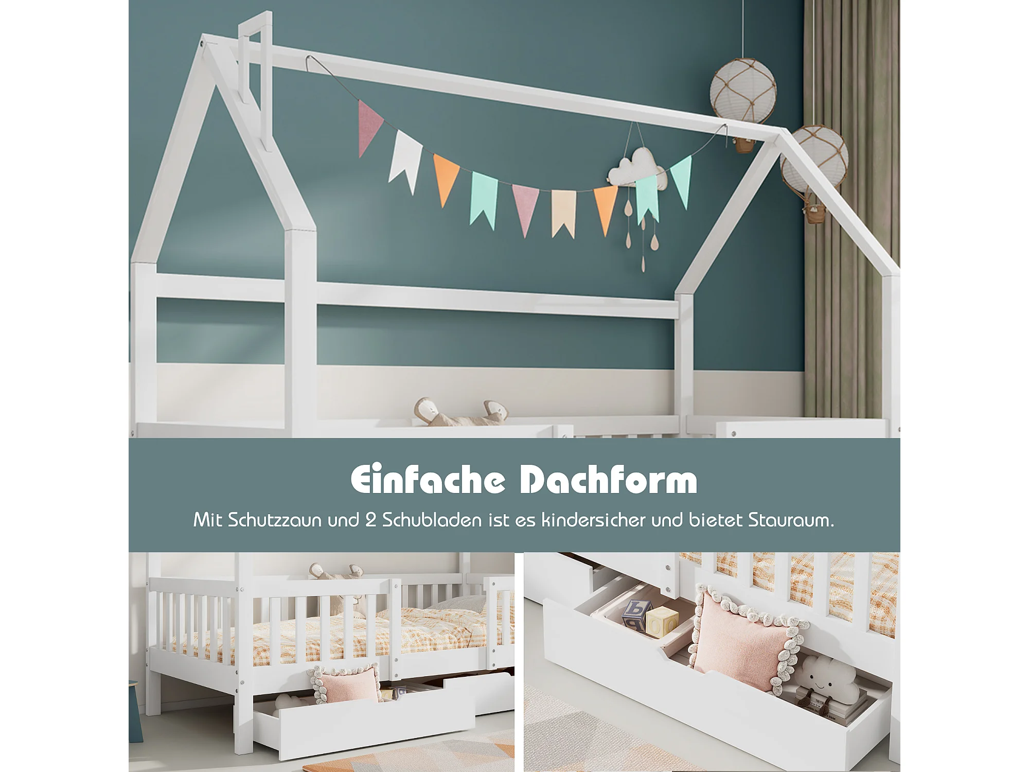 Lit Maison pour enfant avec barrières de sécurité, en bois massif, blanc (90x200 cm)