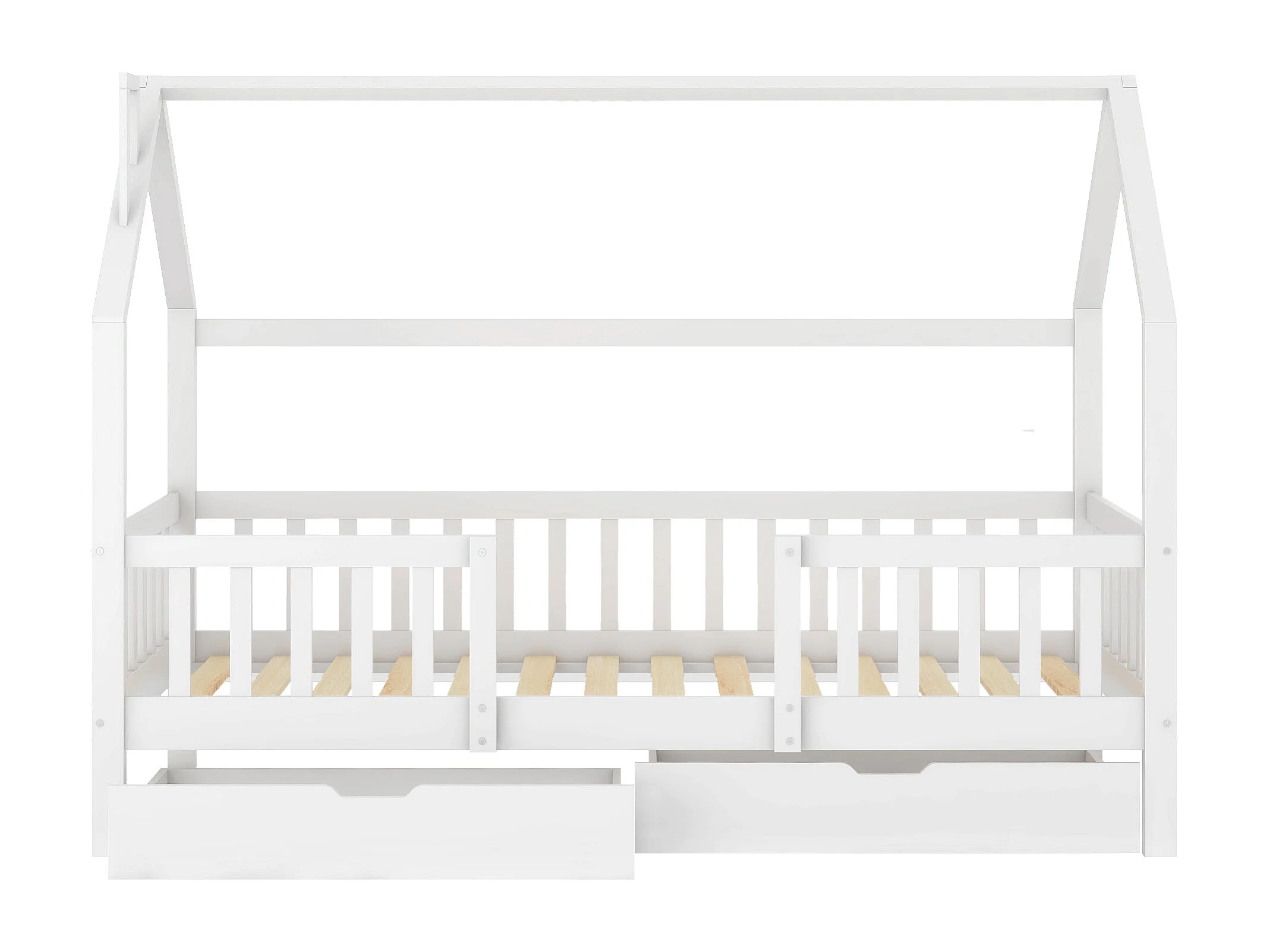 Lit enfant en forme de maison, avec rangement et barreaux de sécurité, en bois de pin, blanc (200x90 cm)