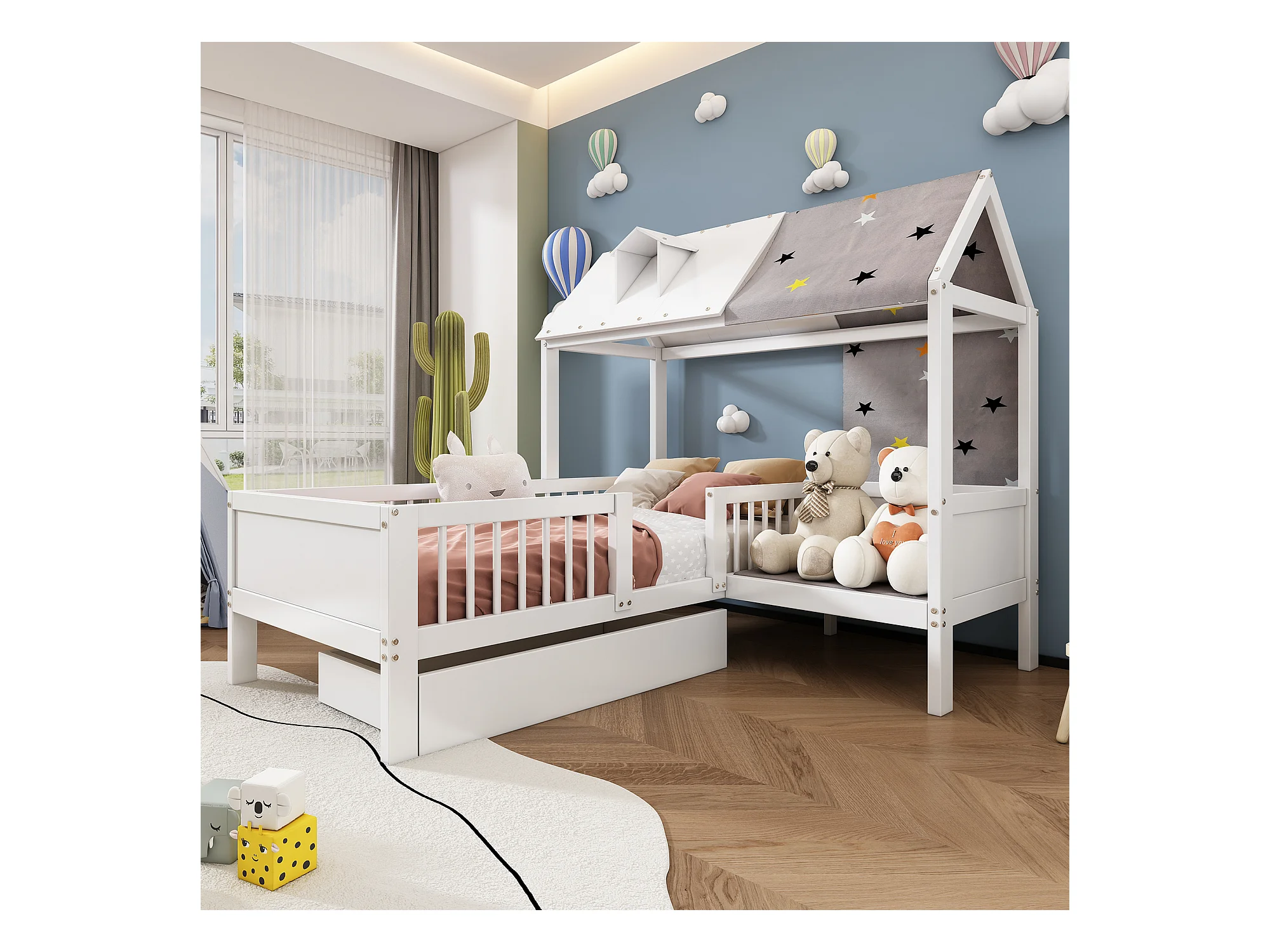 Lit enfant en forme de maison, avec tente et coussins, 2 tiroirs de rangement, bois massif, blanc (90x200 cm)