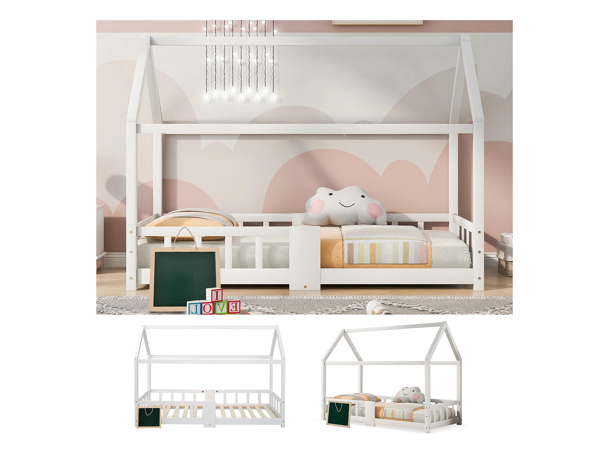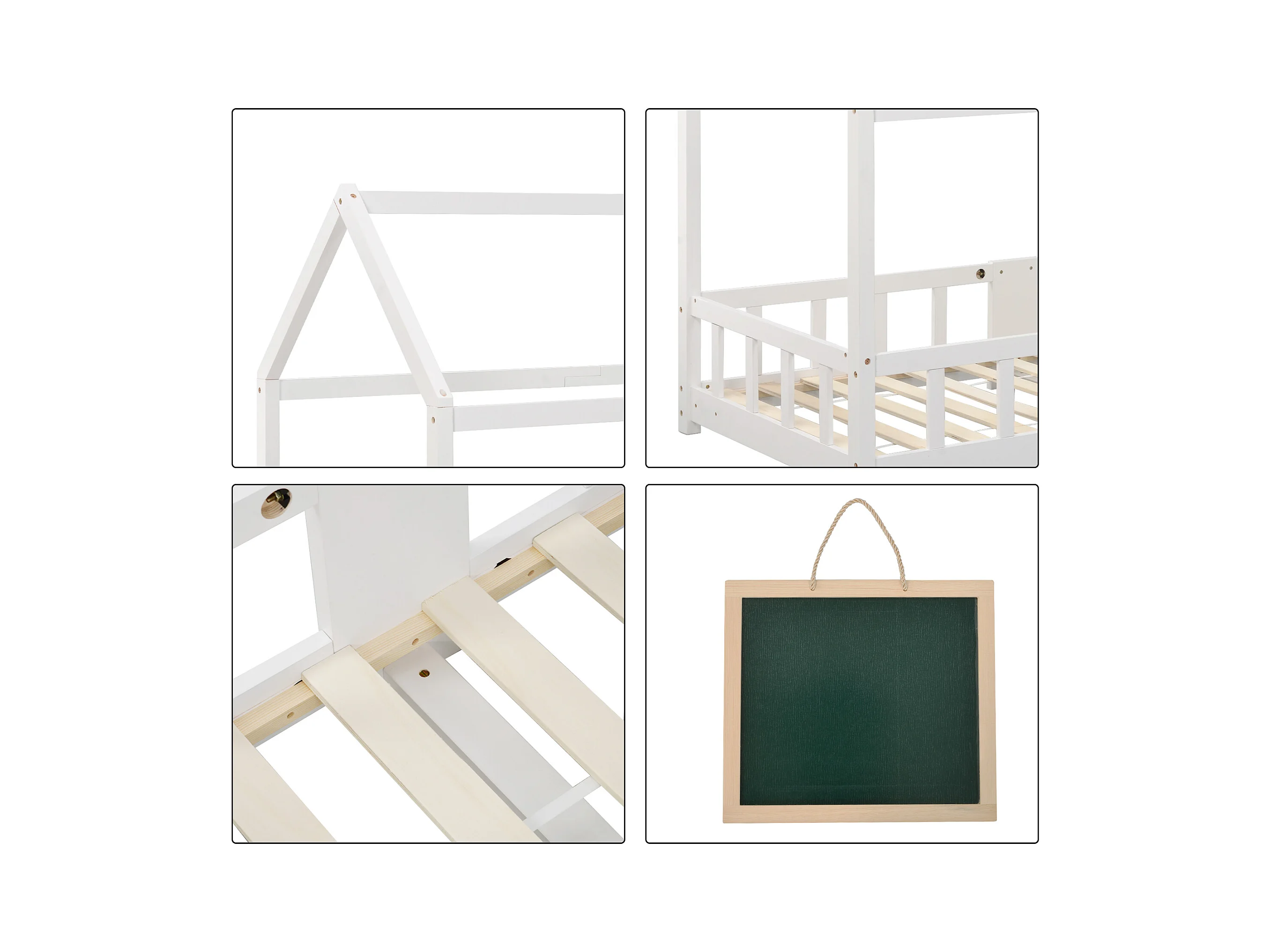 Lit enfant forme maison avec sommier à lattes et protection anti-chute, pin massif blanc, avec tableau effaçable (97x207x140.5cm)