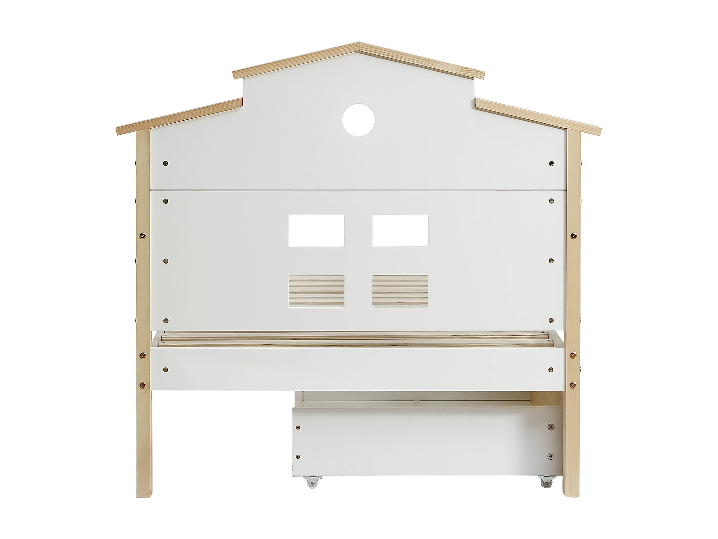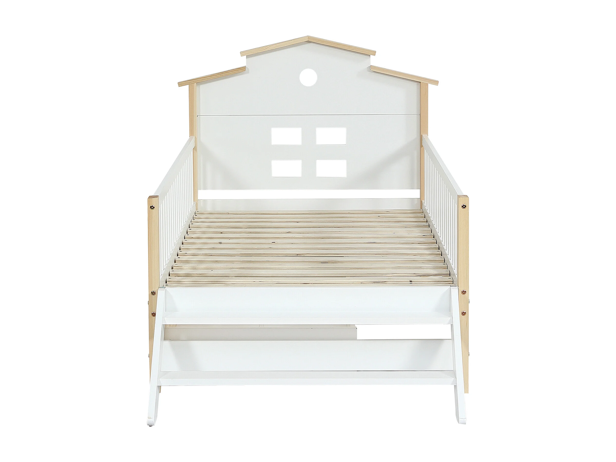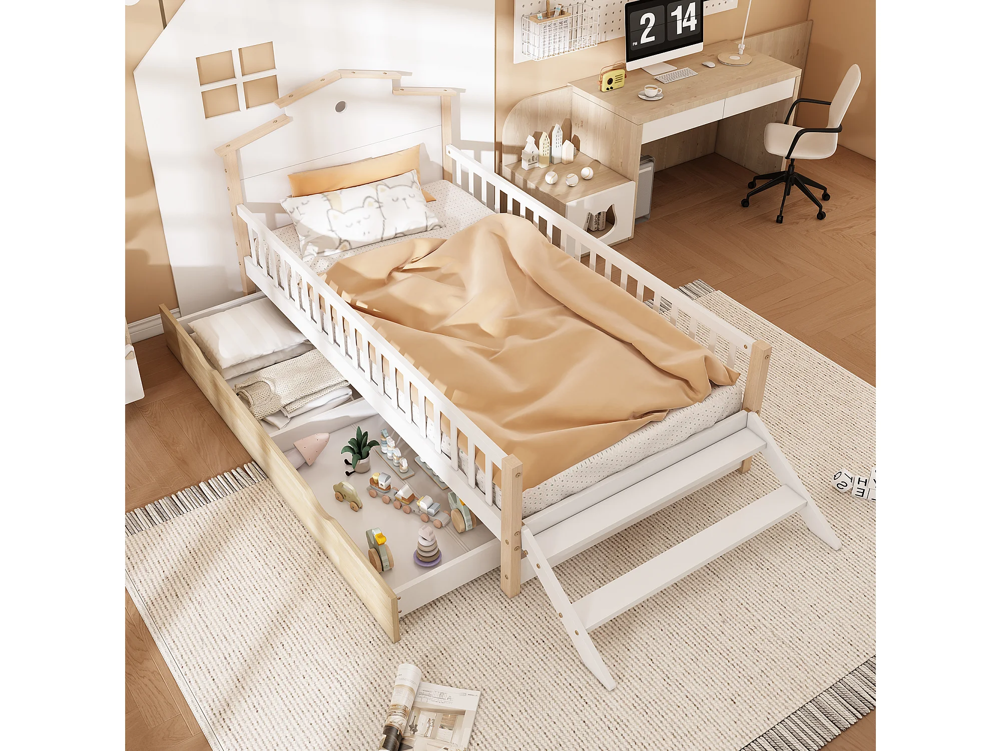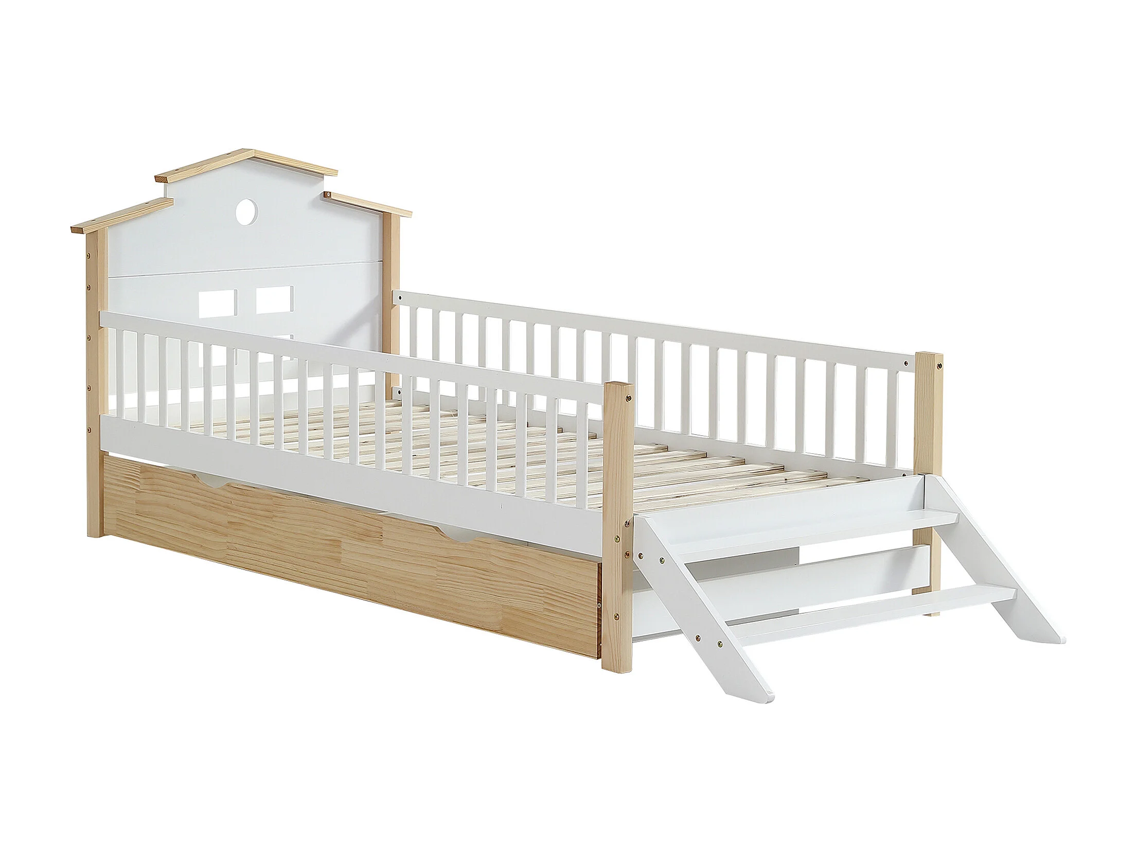 Lit enfant, lit bébé 90x200 cm, pin + MDF, avec 2 tiroirs et marches latérales, avec sommier à lattes et tête de lit, blanc