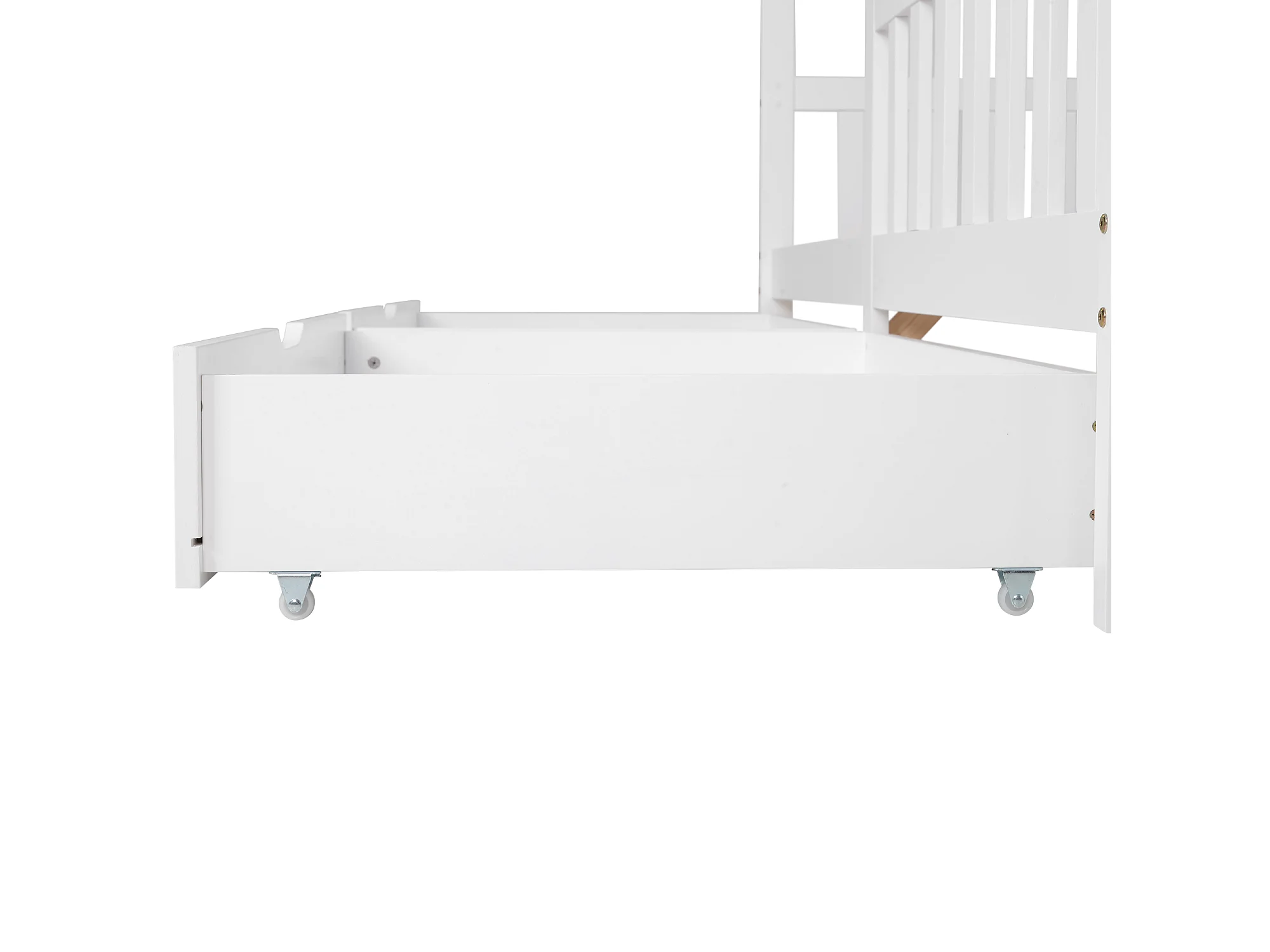 Lit enfant en forme de maison avec tiroirs et étagères, cadre en bois massif, blanc (243x209x183 cm)