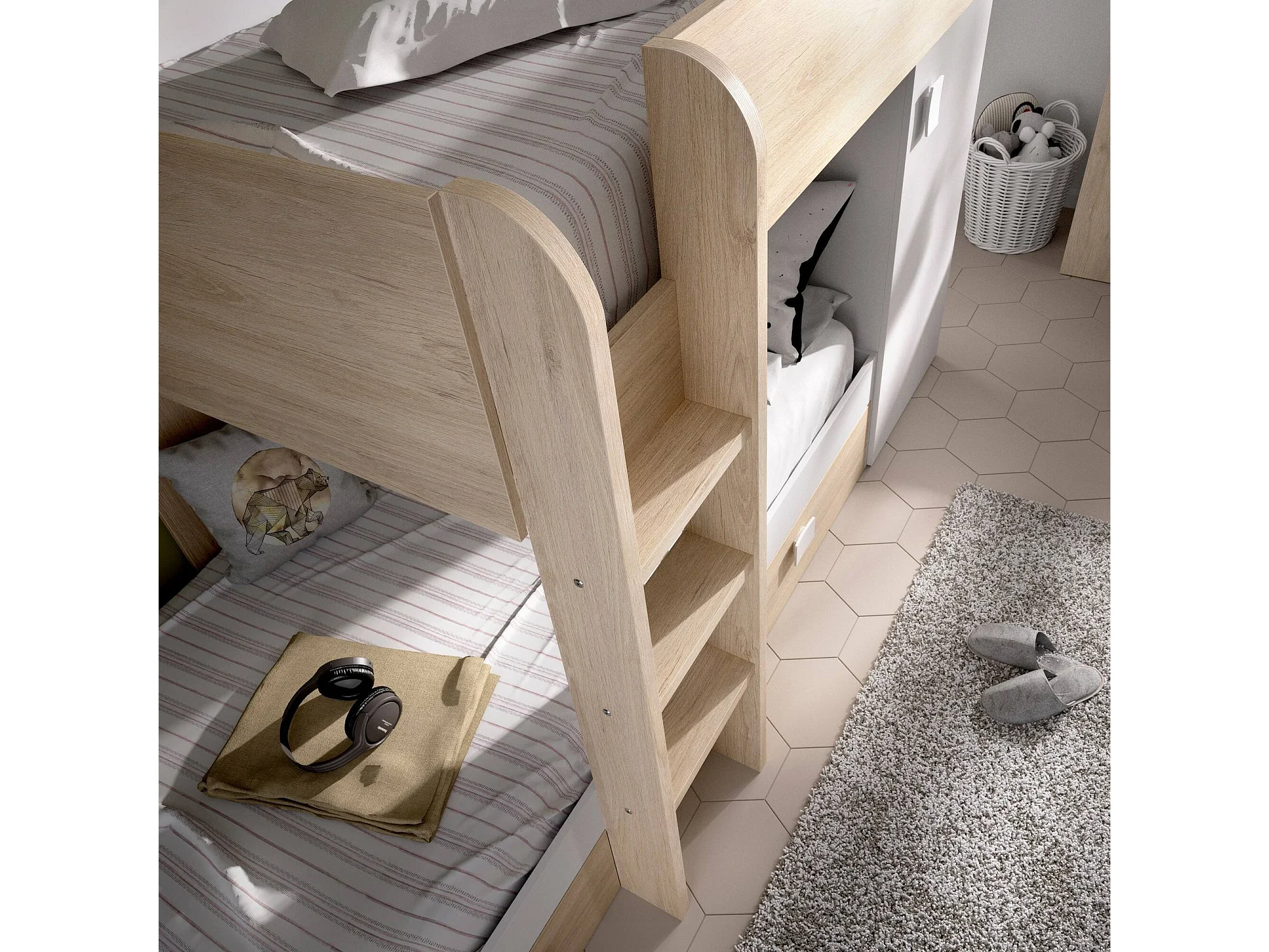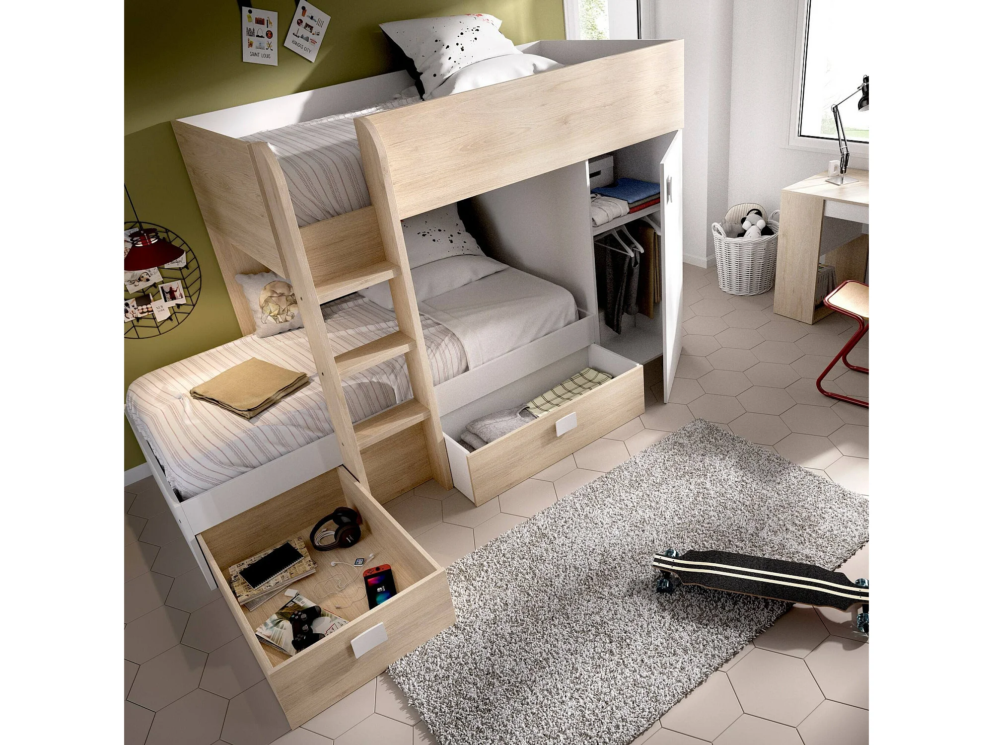 Lit enfant Marmolada, Chambre complète avec armoire et tiroirs, Composition de lits superposés avec deux lits simples, 255x112h150 cm, Blanc et Chêne