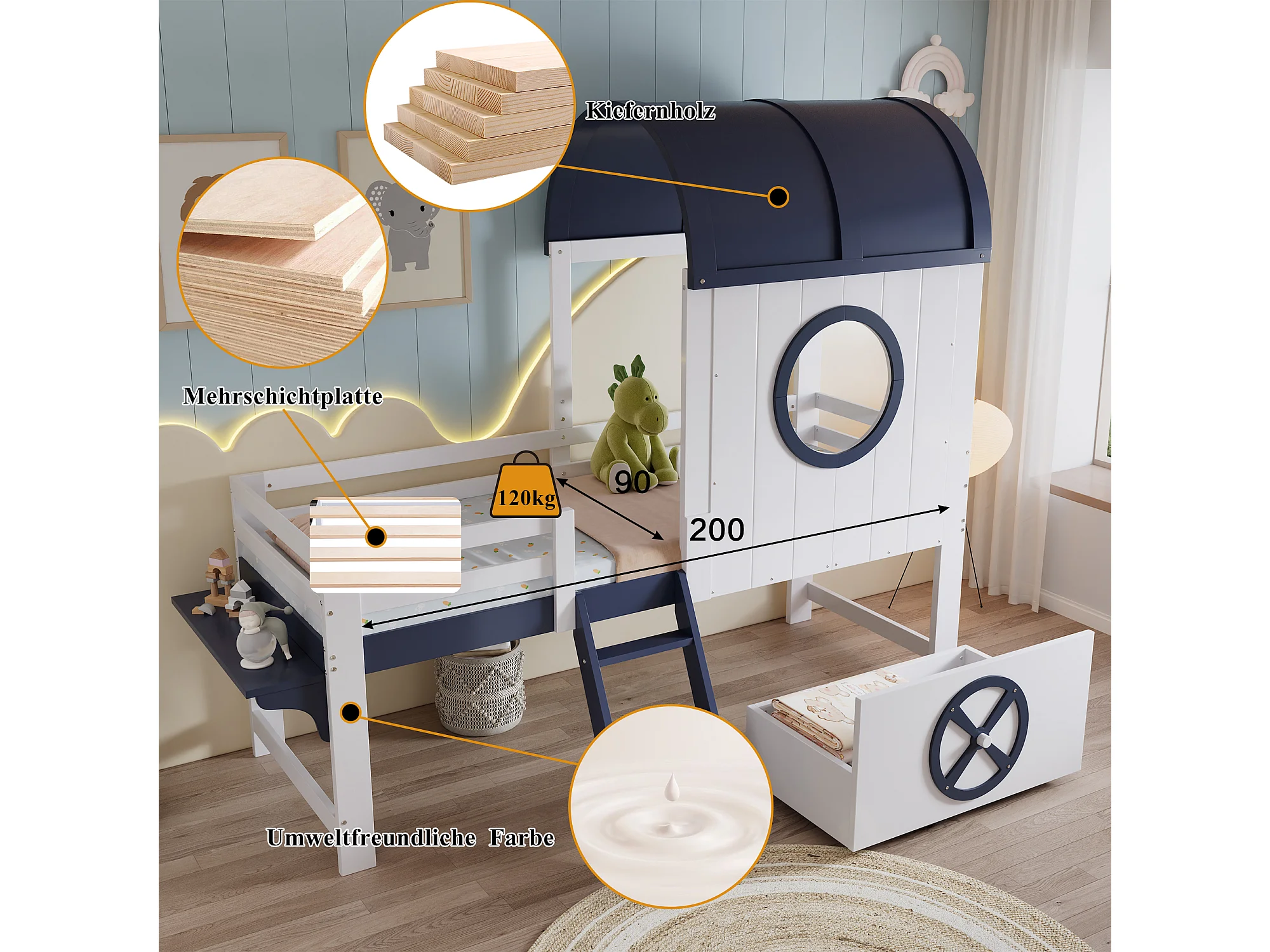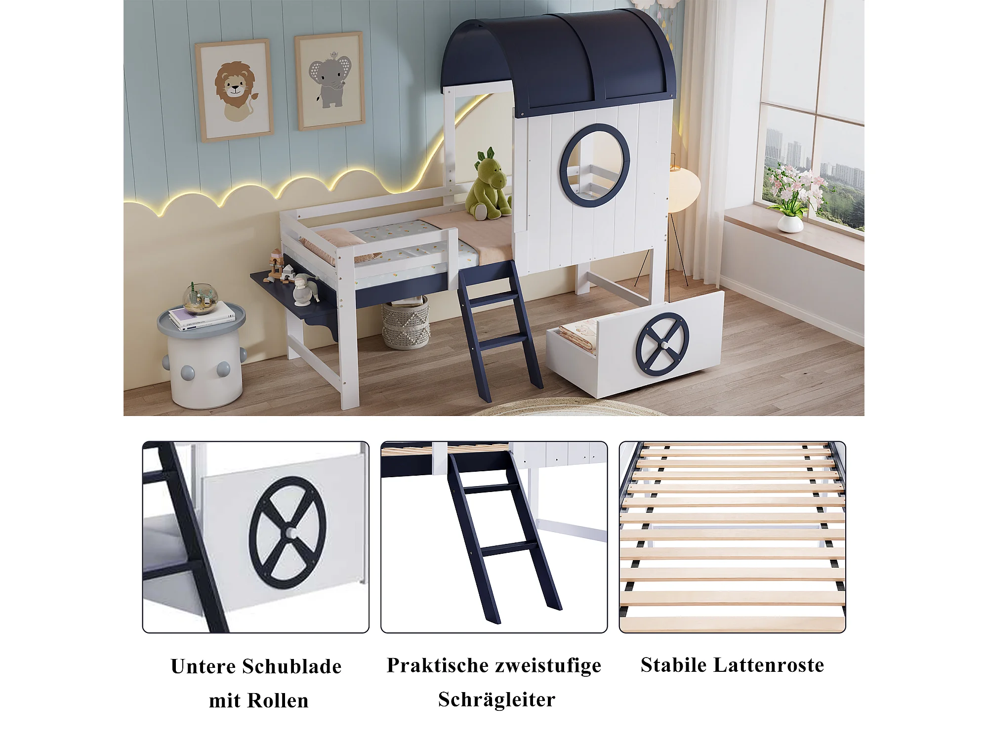 Lit enfant mi-hauteur, avec toit et fenêtres, garde-corps, petite échelle, tiroir sous le lit, pin + MDF, blanc et bleu marine, (203.5x131.5x200 cm)