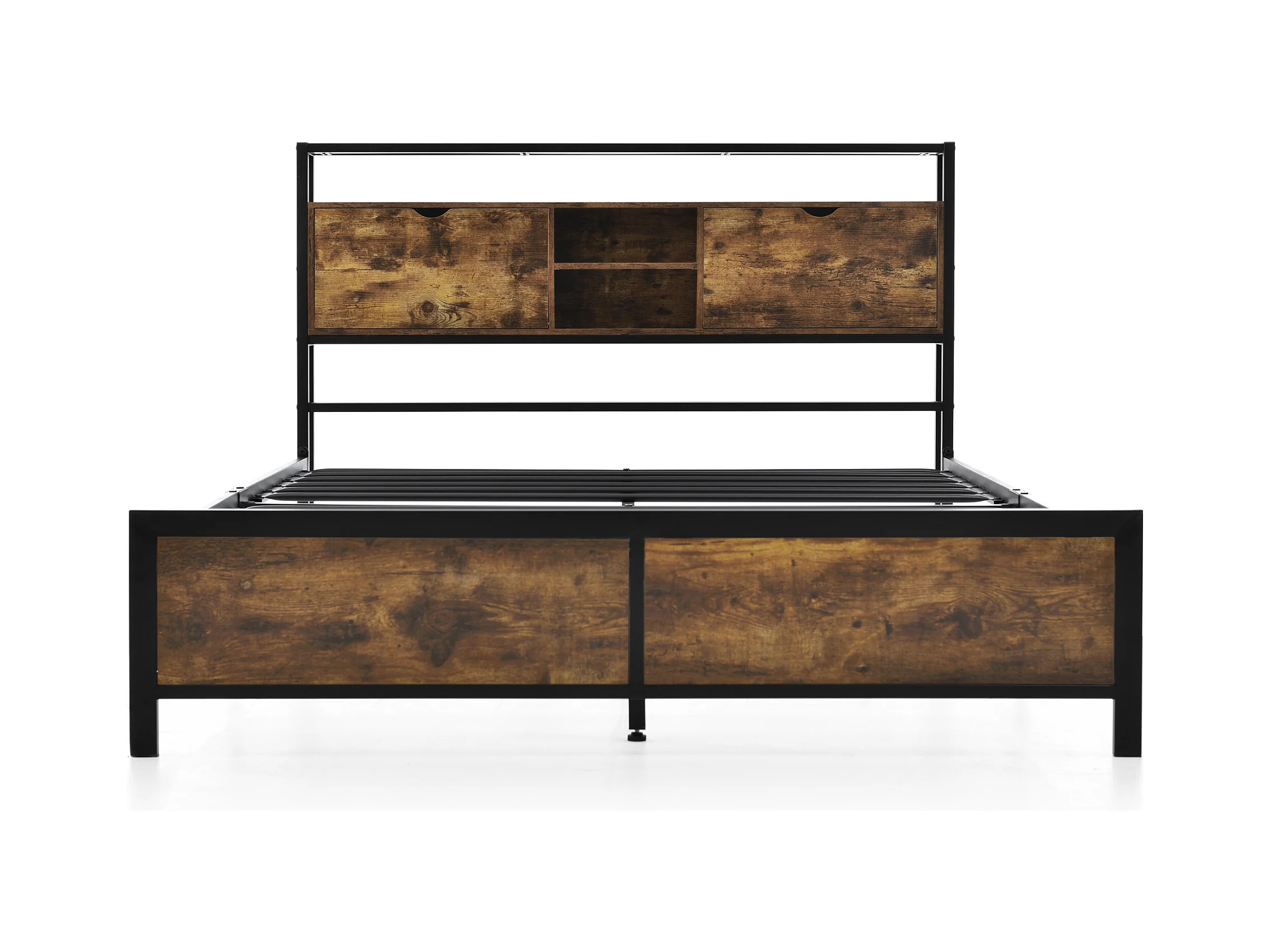 Lit adulte 140x200 cm - lit double avec tête de lit rangement et sommier en métal - naturel foncé - sans matelas