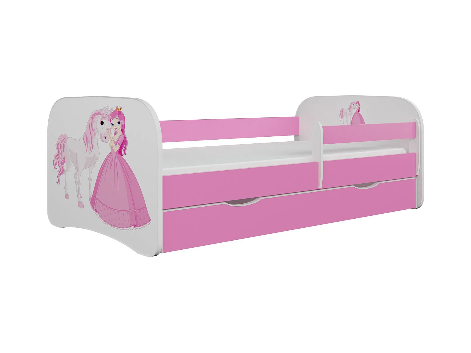 Lit enfant princesse rose à cheval avec sommiers et barrière de sécurité amovible Drimy-Matelas mousse-80x160-Tiroirs Avec tiroir