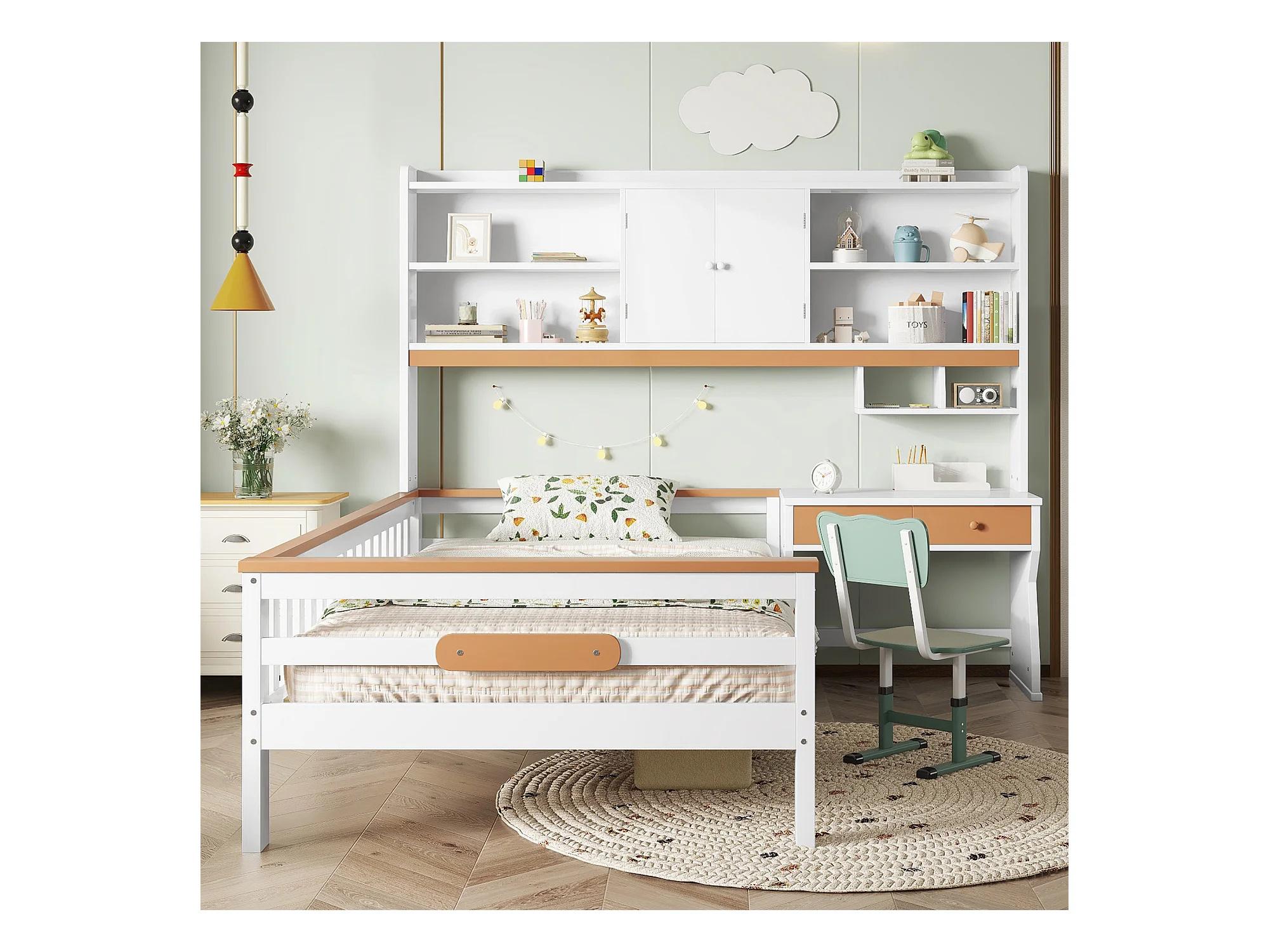 Lit enfant 90 x 200 cm avec armoires, placard et bureau, 2 tiroirs - Bois massif + MDF - Blanc (sans matelas)